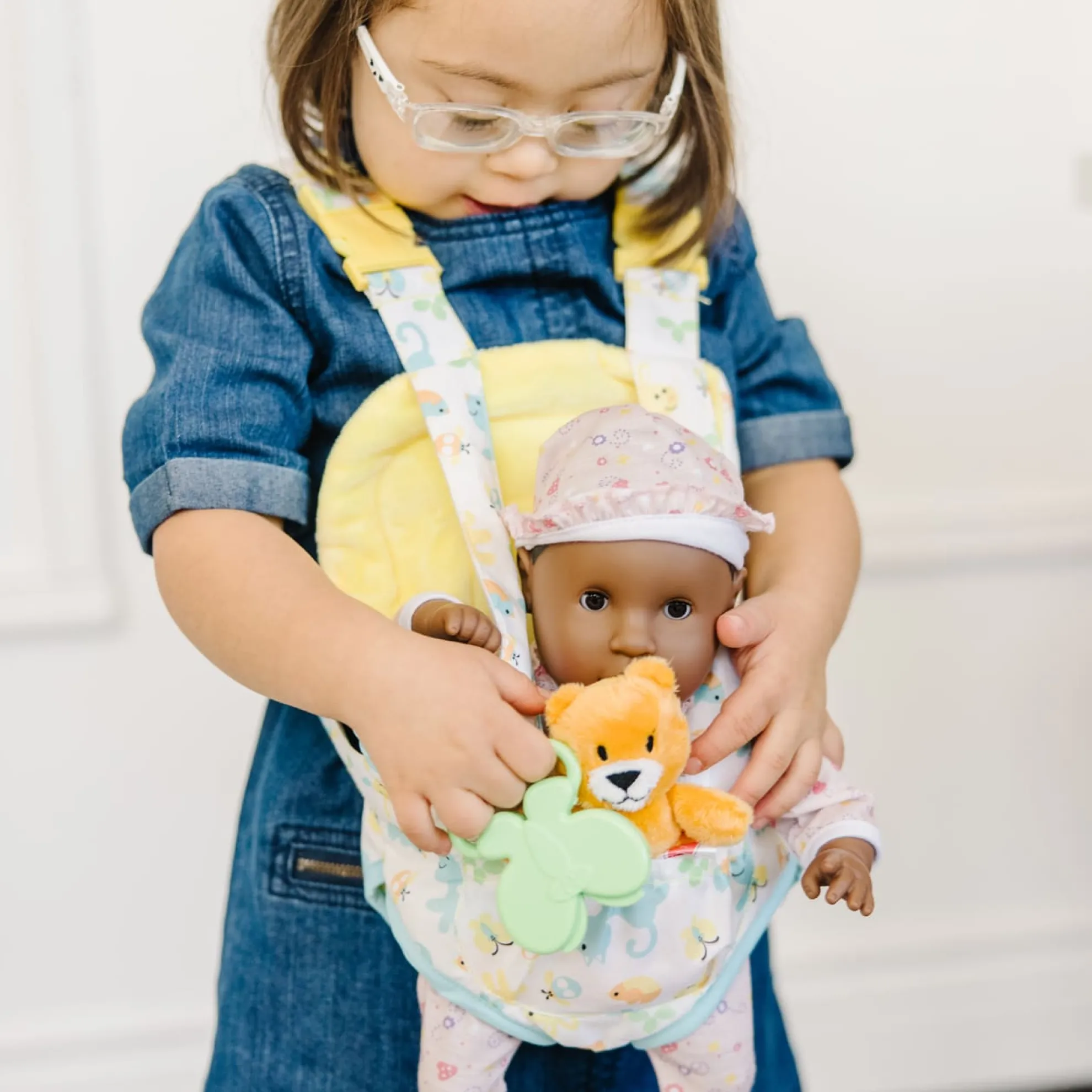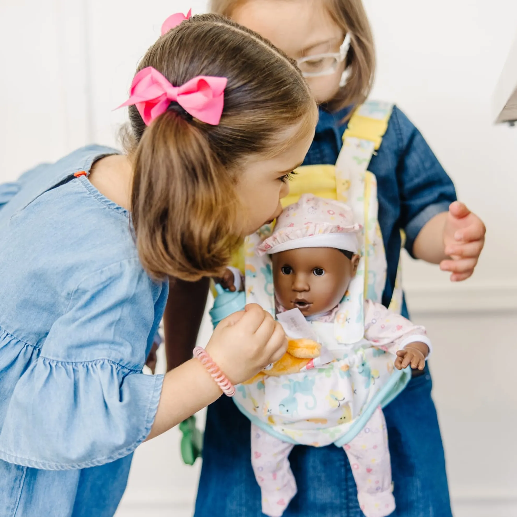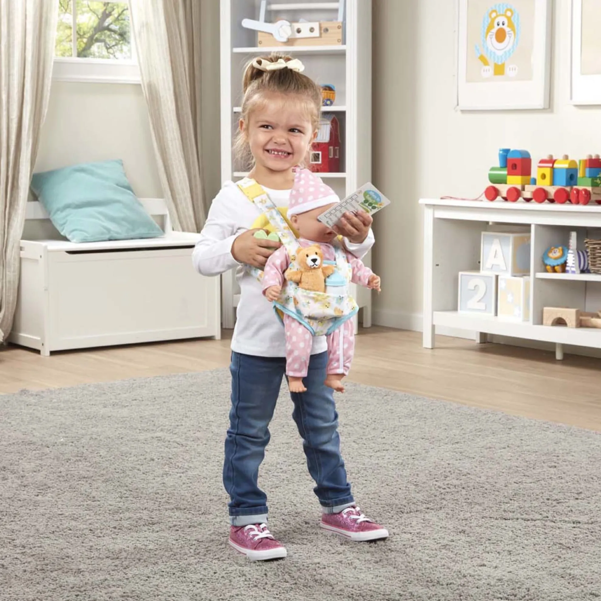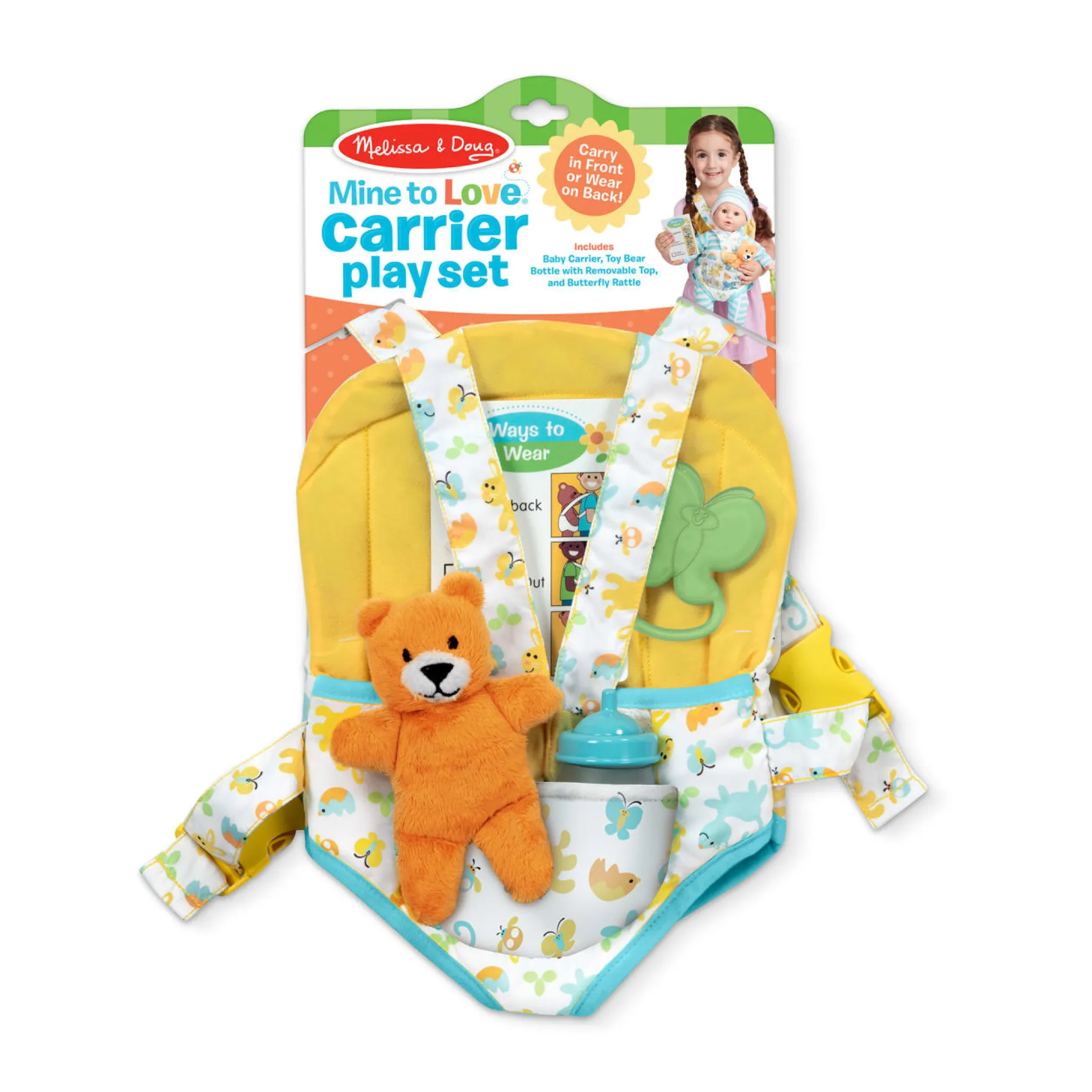 When little caregivers need to be hands-free, there’s nothing better than this realistic baby carrier for kids’ favorite dolls and stuffed animals! The adjustable carrier holds dolls up to 18 inches and can be worn in the front or back, with “baby” facing forward or backward. The play set includes a toy stuffed bear, baby bottle, butterfly rattle, and a reusable double-sided activity card, all of which tuck conveniently into two pockets in the carrier. Sturdy construction and machine washable. With Mine to Love toys, kids three and older can explore grown-up roles and responsibilities while having endless fun caring for their babies. (Dolls/stuffed animals–other than the small toy bear–not included with this set.)