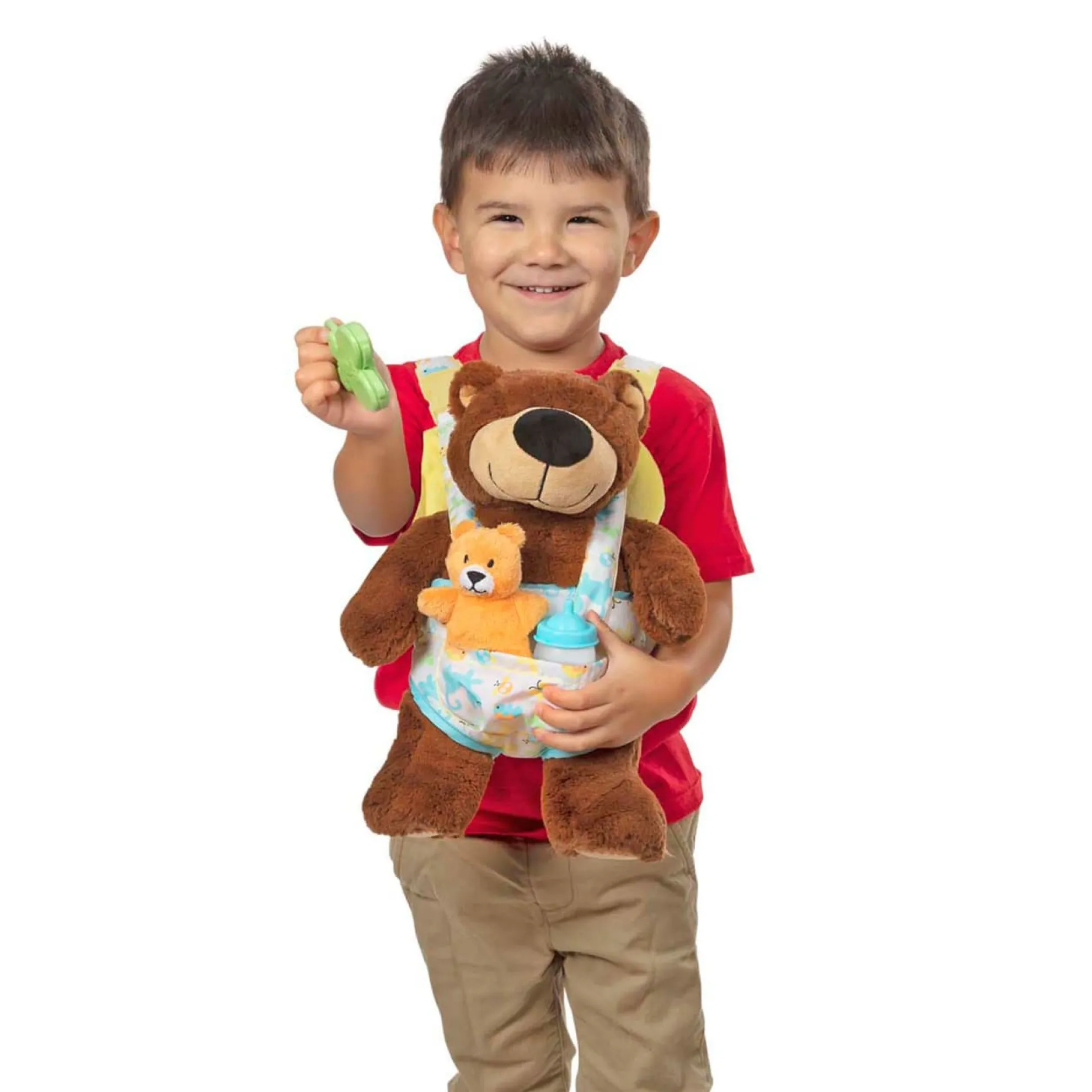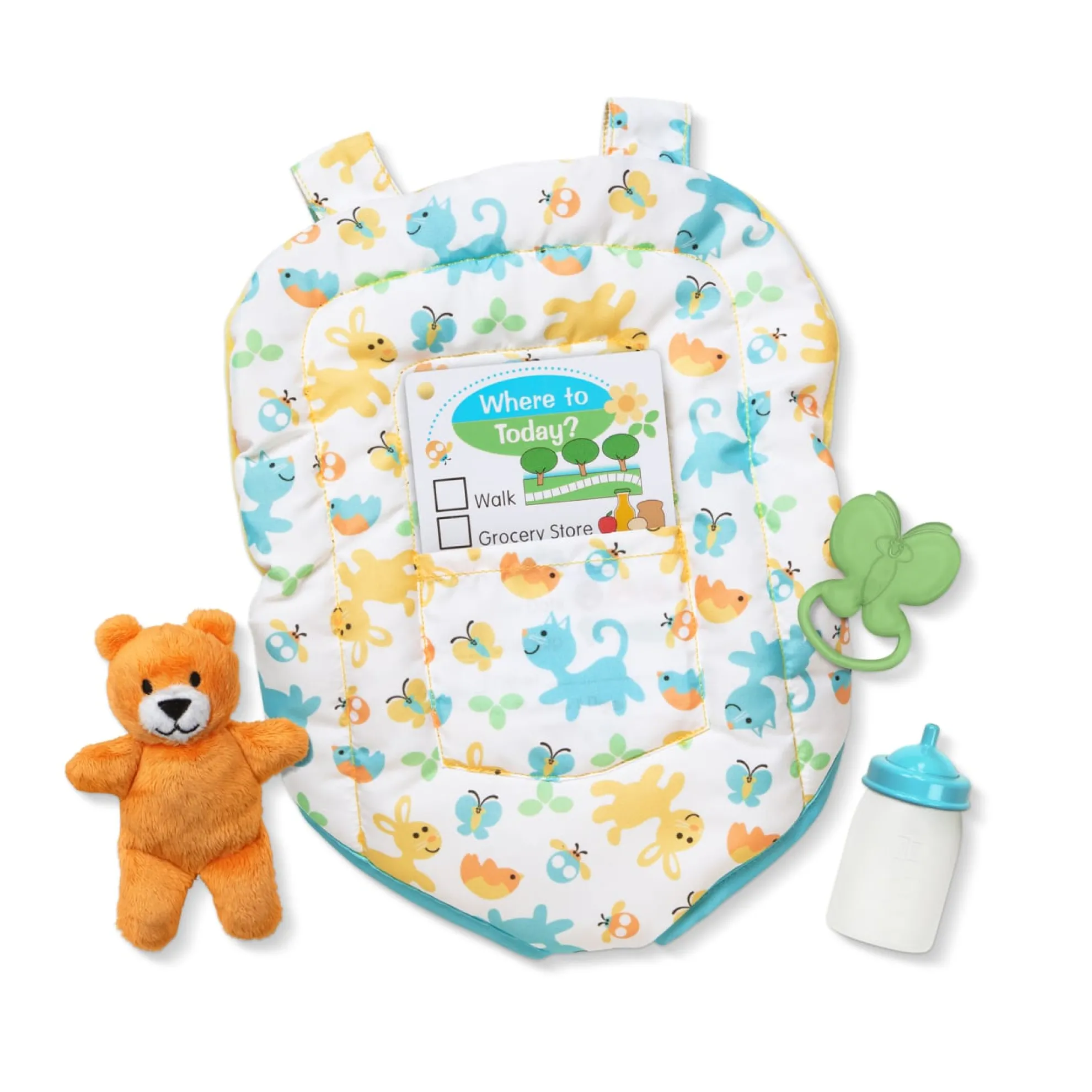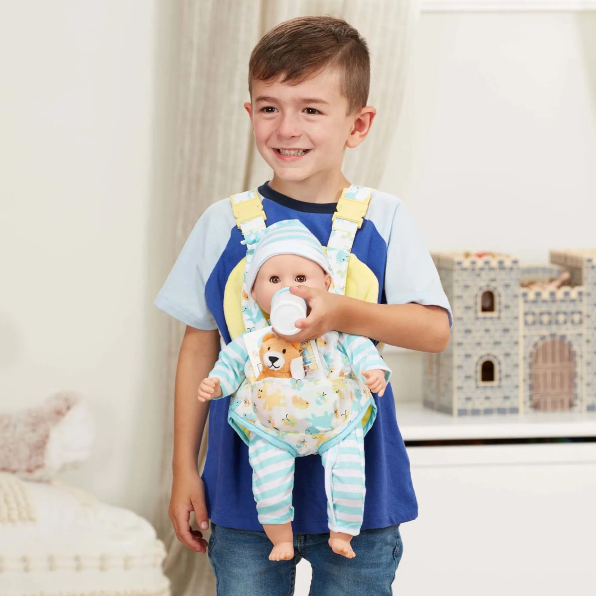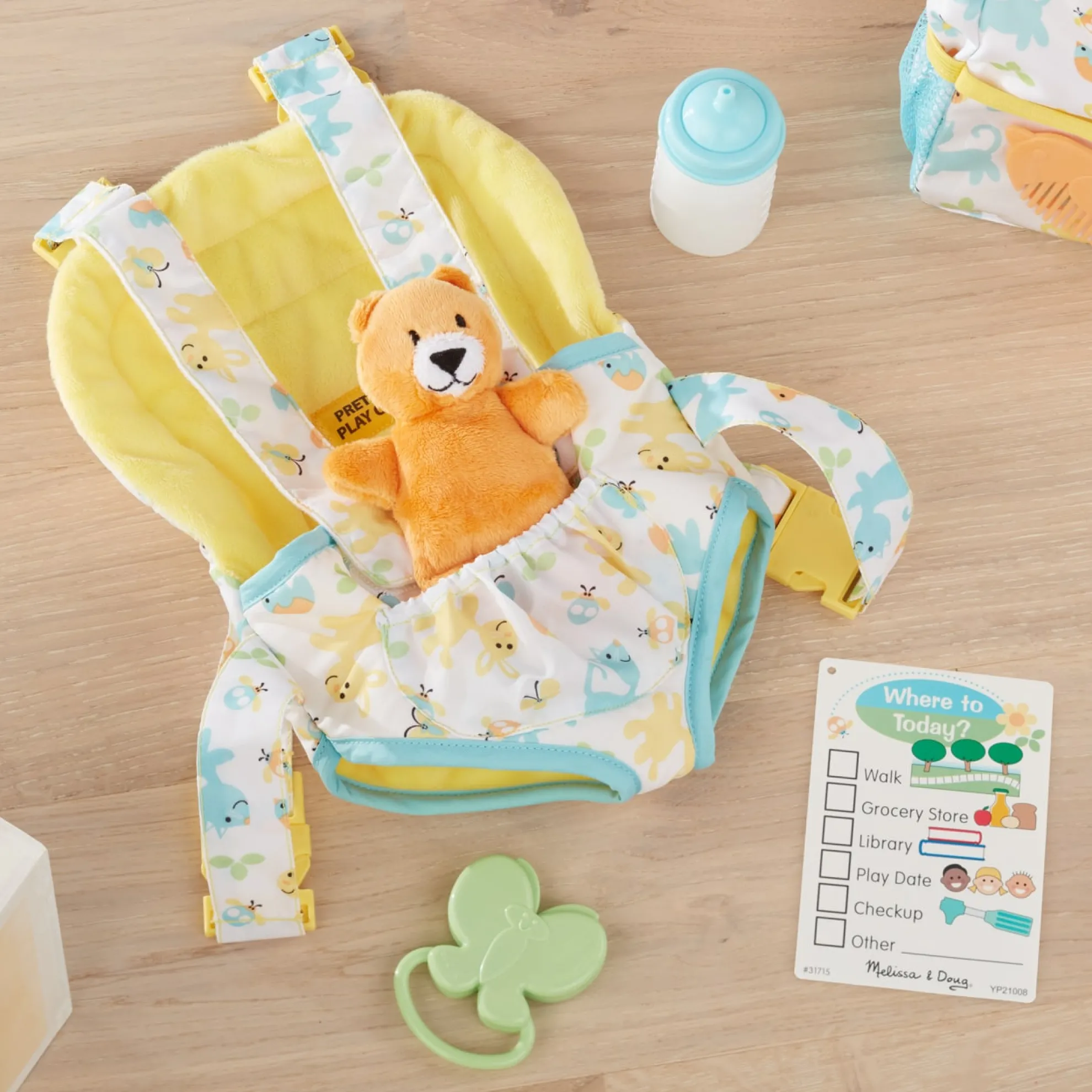 When little caregivers need to be hands-free, there’s nothing better than this realistic baby carrier for kids’ favorite dolls and stuffed animals! The adjustable carrier holds dolls up to 18 inches and can be worn in the front or back, with “baby” facing forward or backward. The play set includes a toy stuffed bear, baby bottle, butterfly rattle, and a reusable double-sided activity card, all of which tuck conveniently into two pockets in the carrier. Sturdy construction and machine washable. With Mine to Love toys, kids three and older can explore grown-up roles and responsibilities while having endless fun caring for their babies. (Dolls/stuffed animals–other than the small toy bear–not included with this set.)