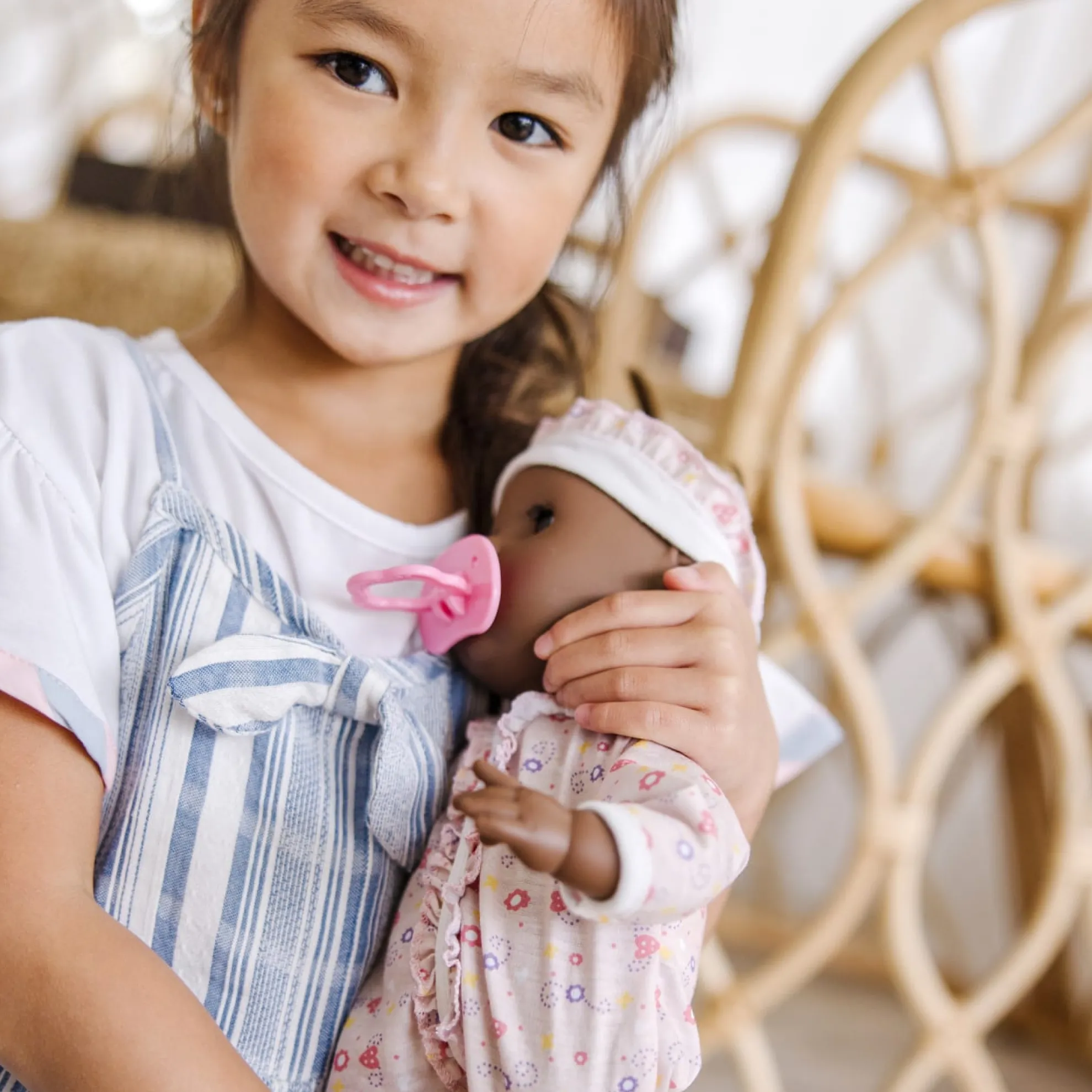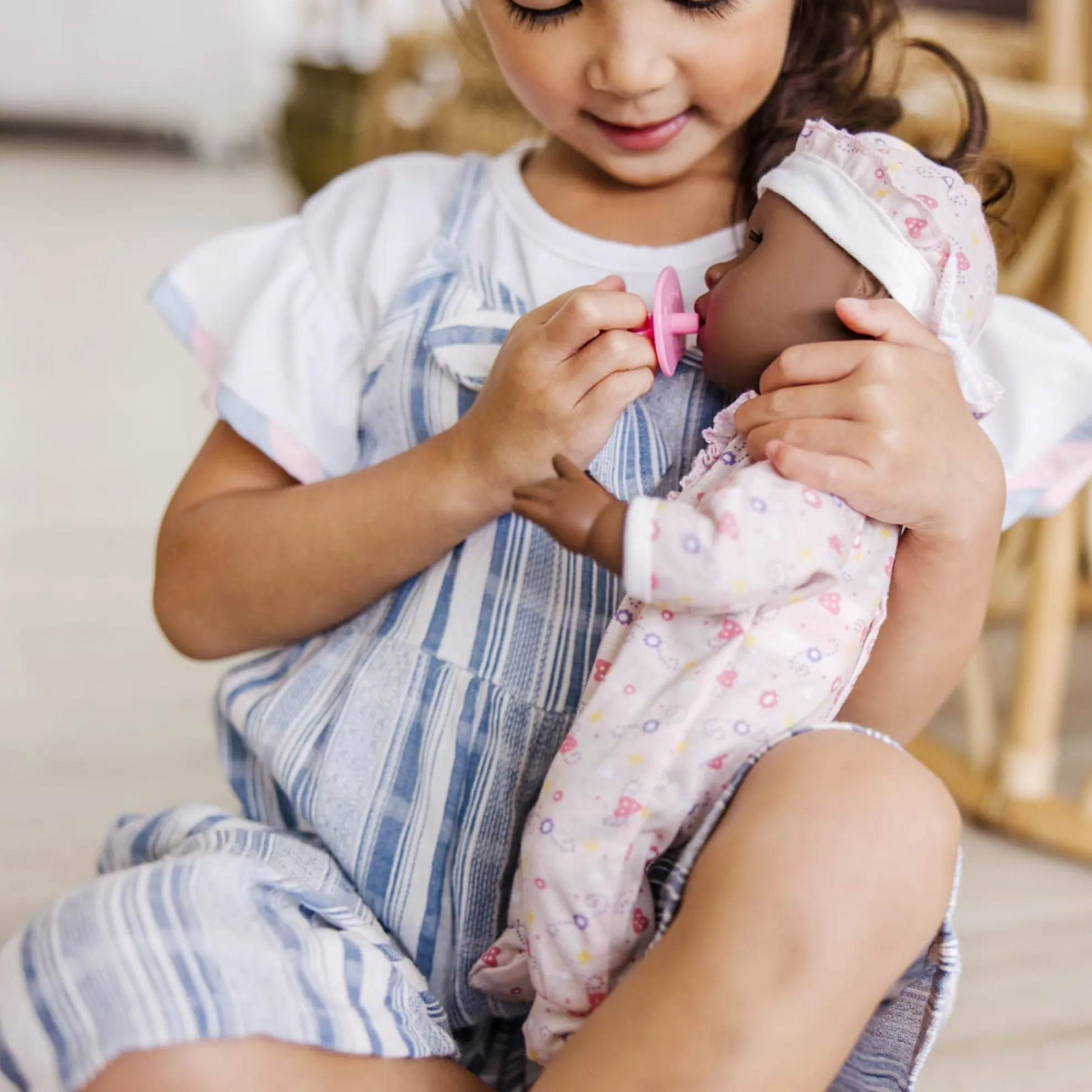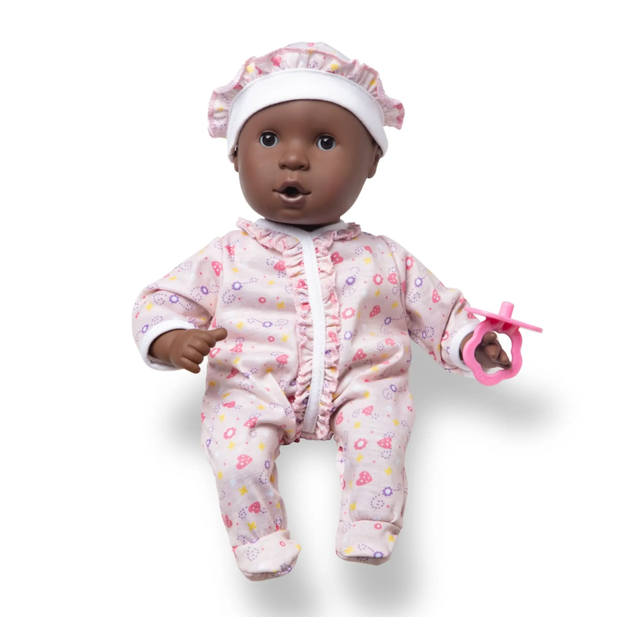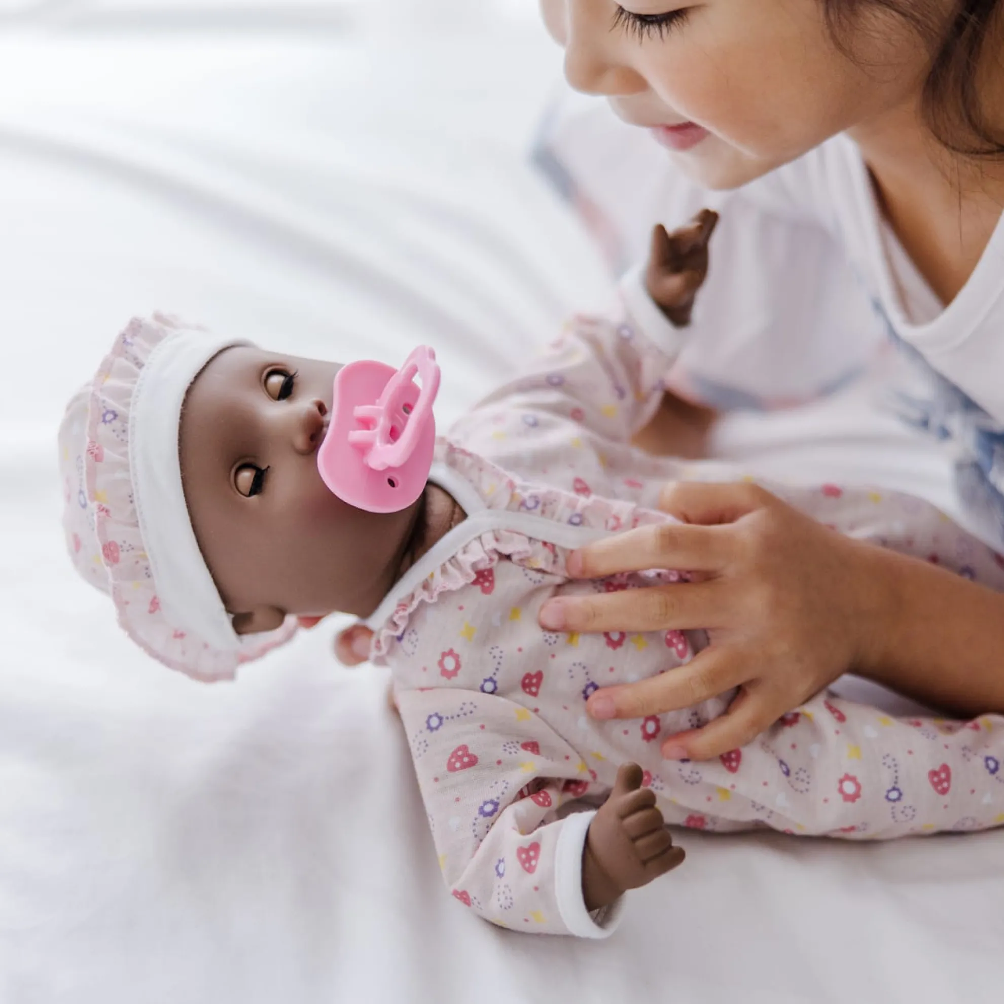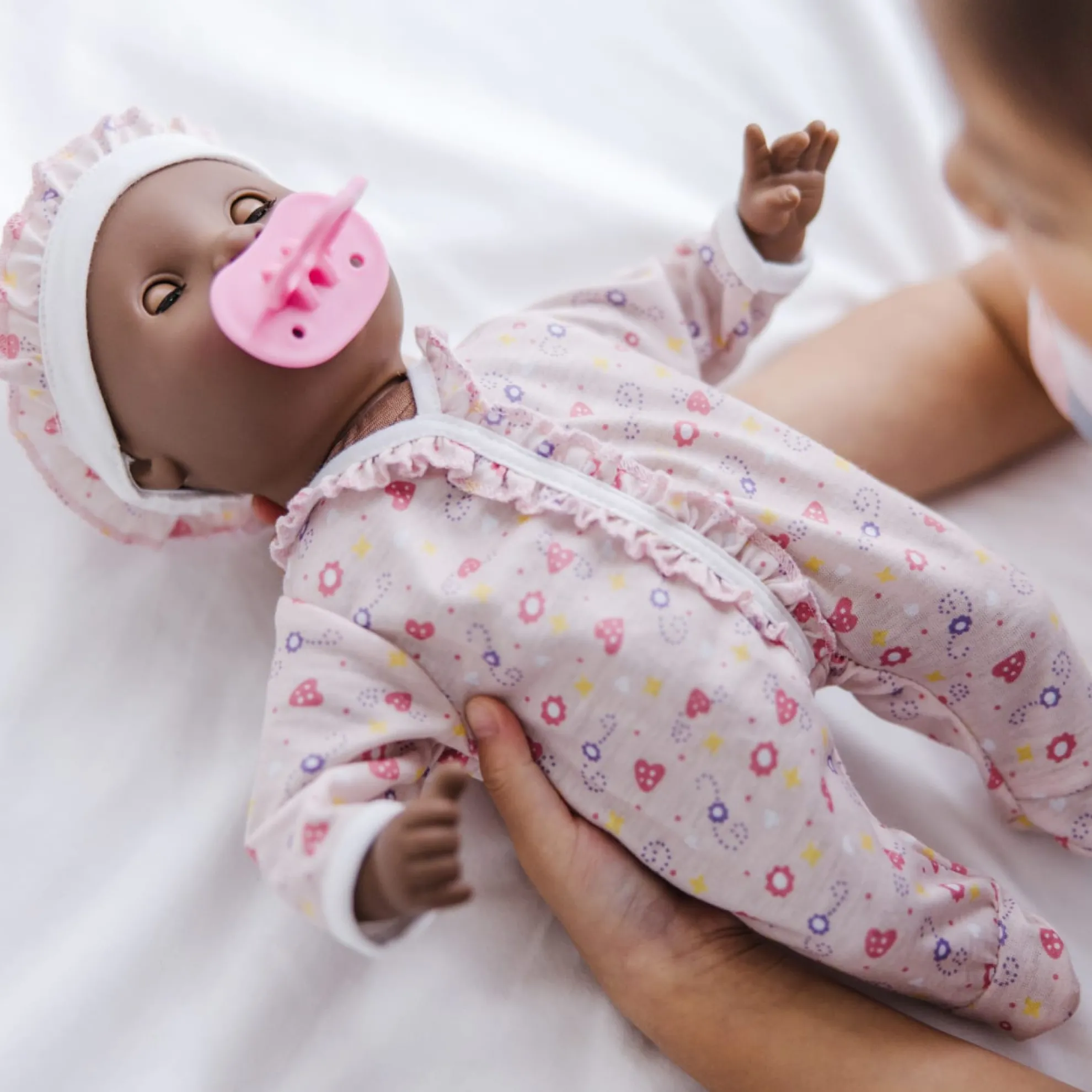 - 12-inch clothed girl baby doll with dark skin tone that can suck her thumb or pacifier