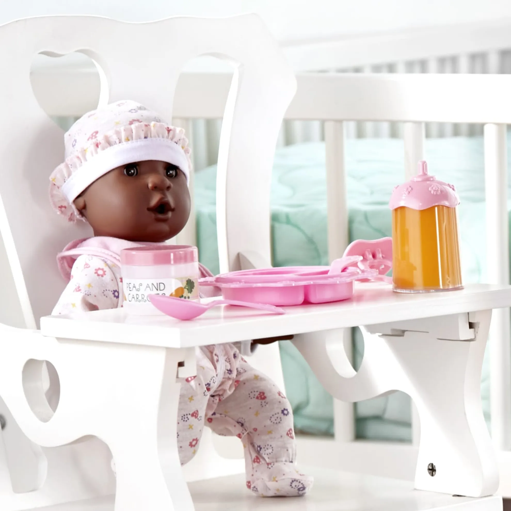 This adorable baby doll is just the right size to hug and cuddle. Gabrielle has molded plastic hair and her beautiful brown eyes open and close! She loves to be held and can also sit up “like a big girl.” Her pretty frilled clothing features hearts and flowers and is removable for dressing and undressing fun, and she can suck her thumb or the included pink pacifier. Doll is 12″ tall.