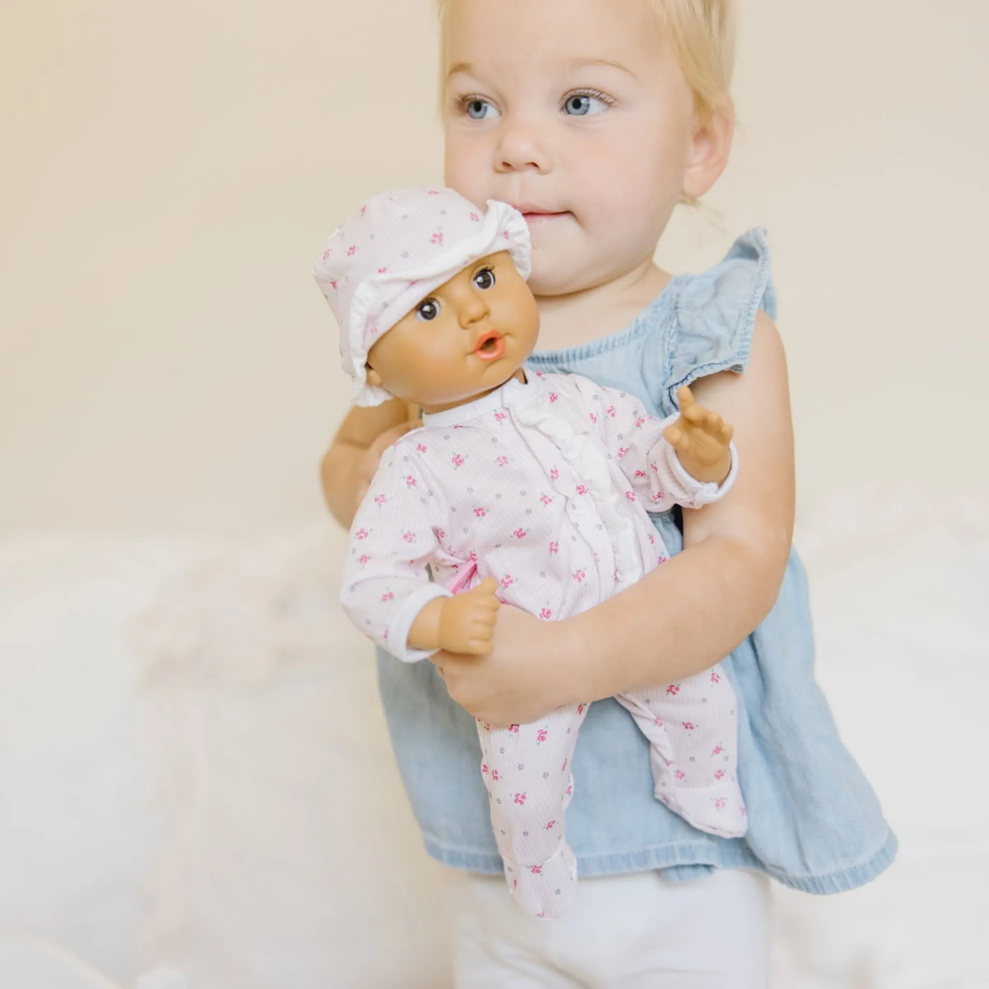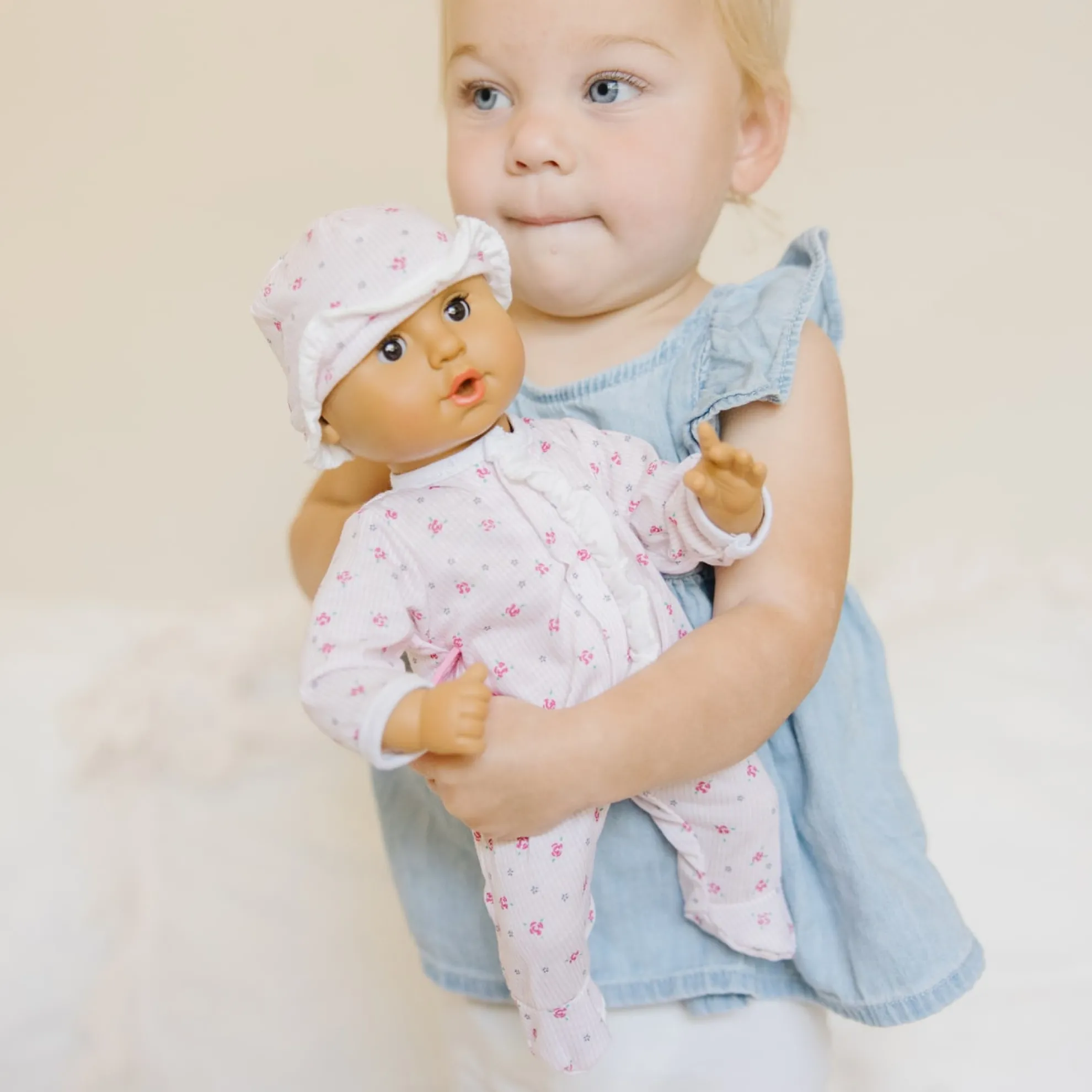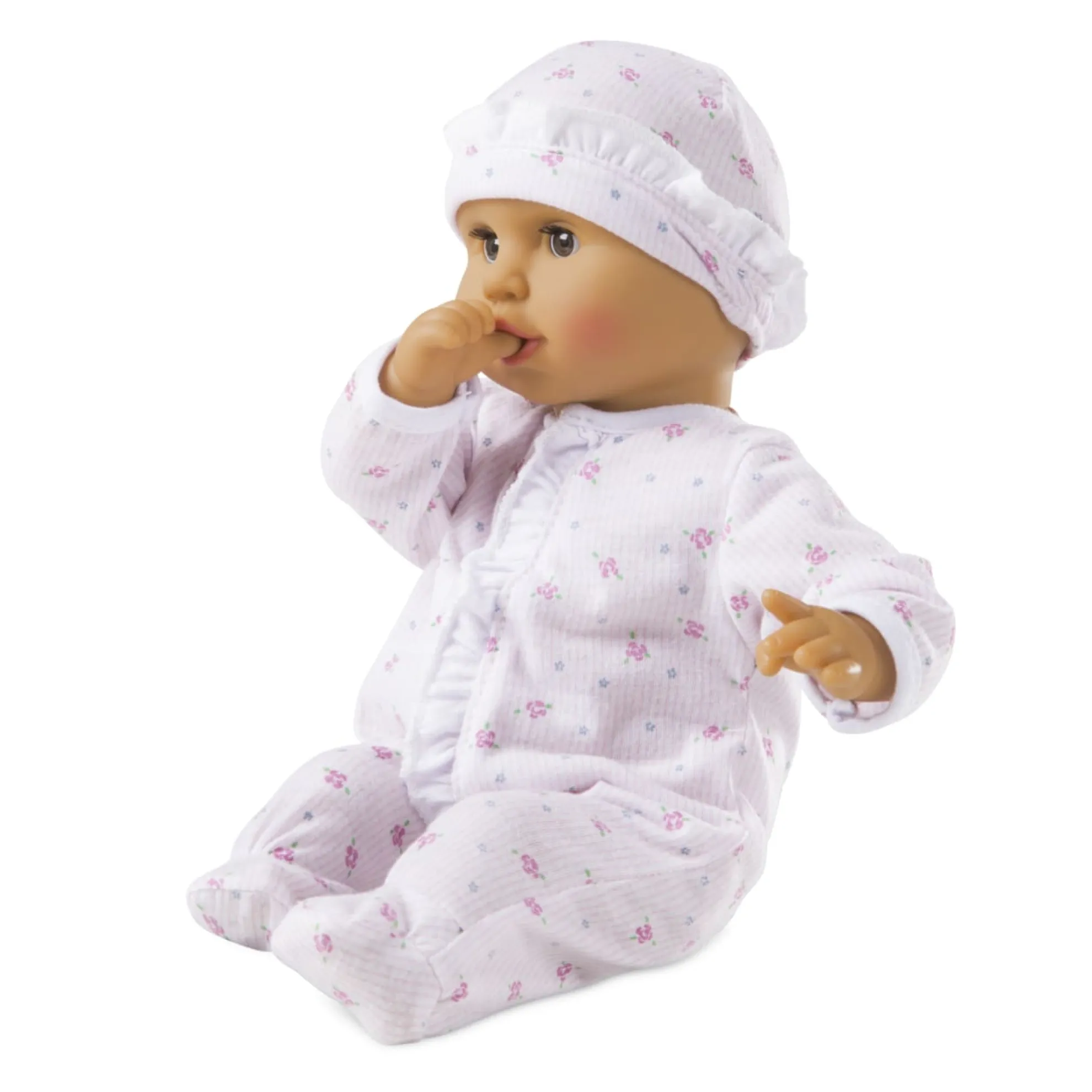 This huggable, lovable baby doll is the perfect size to cuddle. Mariana has molded plastic hair and her beautiful brown eyes open and close. She can even sit up “like a big girl.” Her pretty rosebud clothing is removable for dressing and undressing fun, and she can suck her thumb or the included pacifier. Doll is 12″ tall.