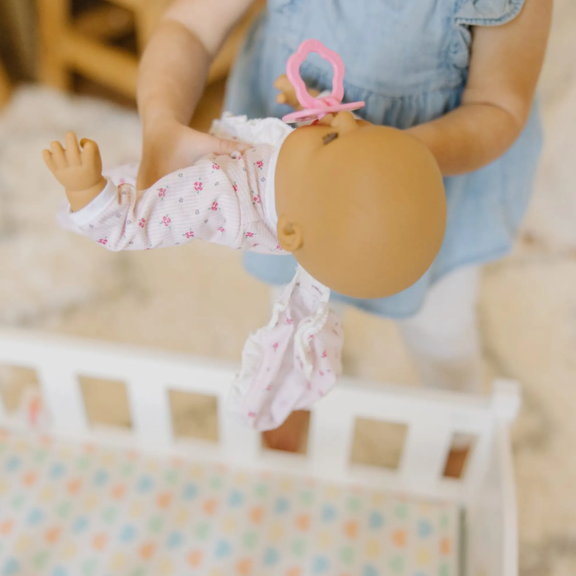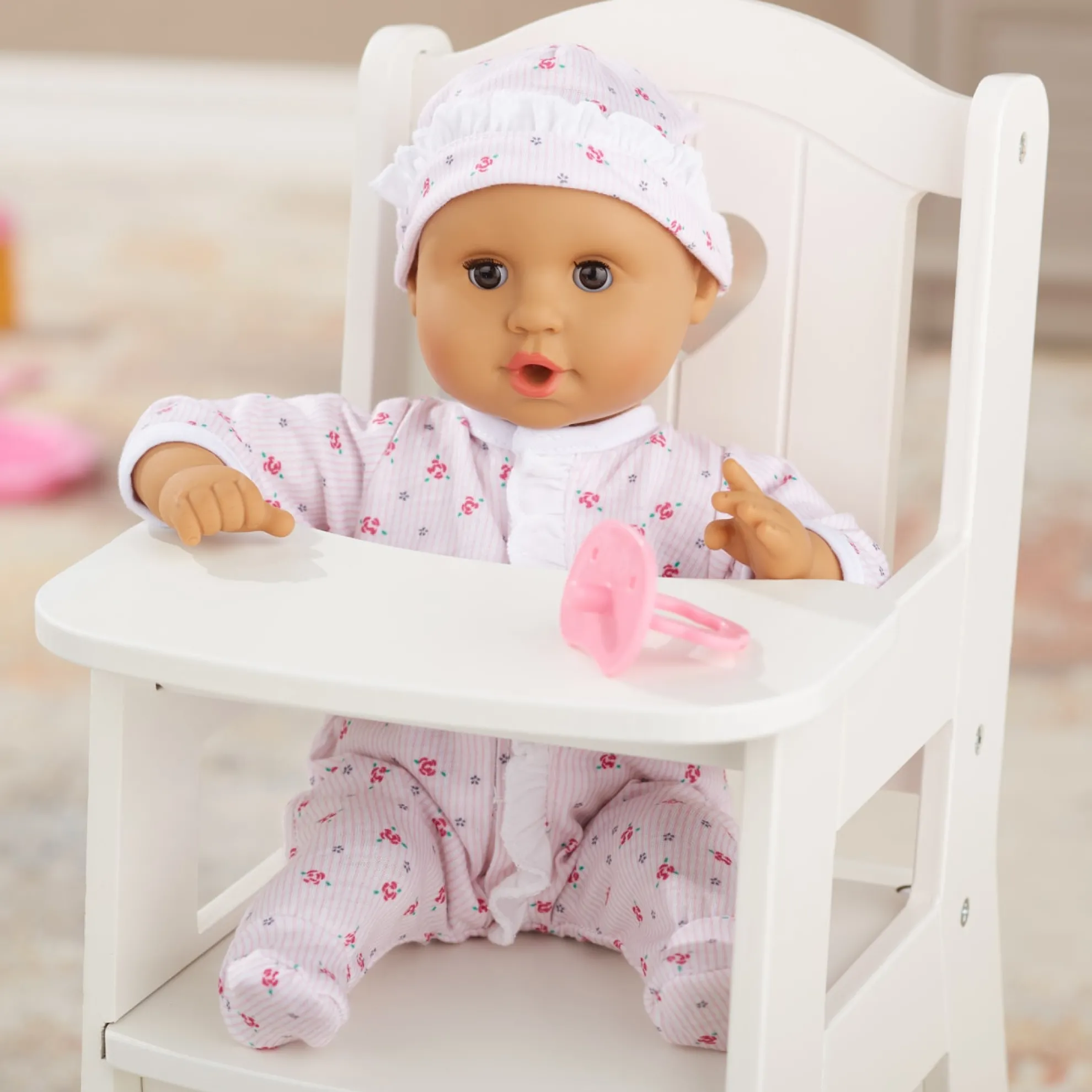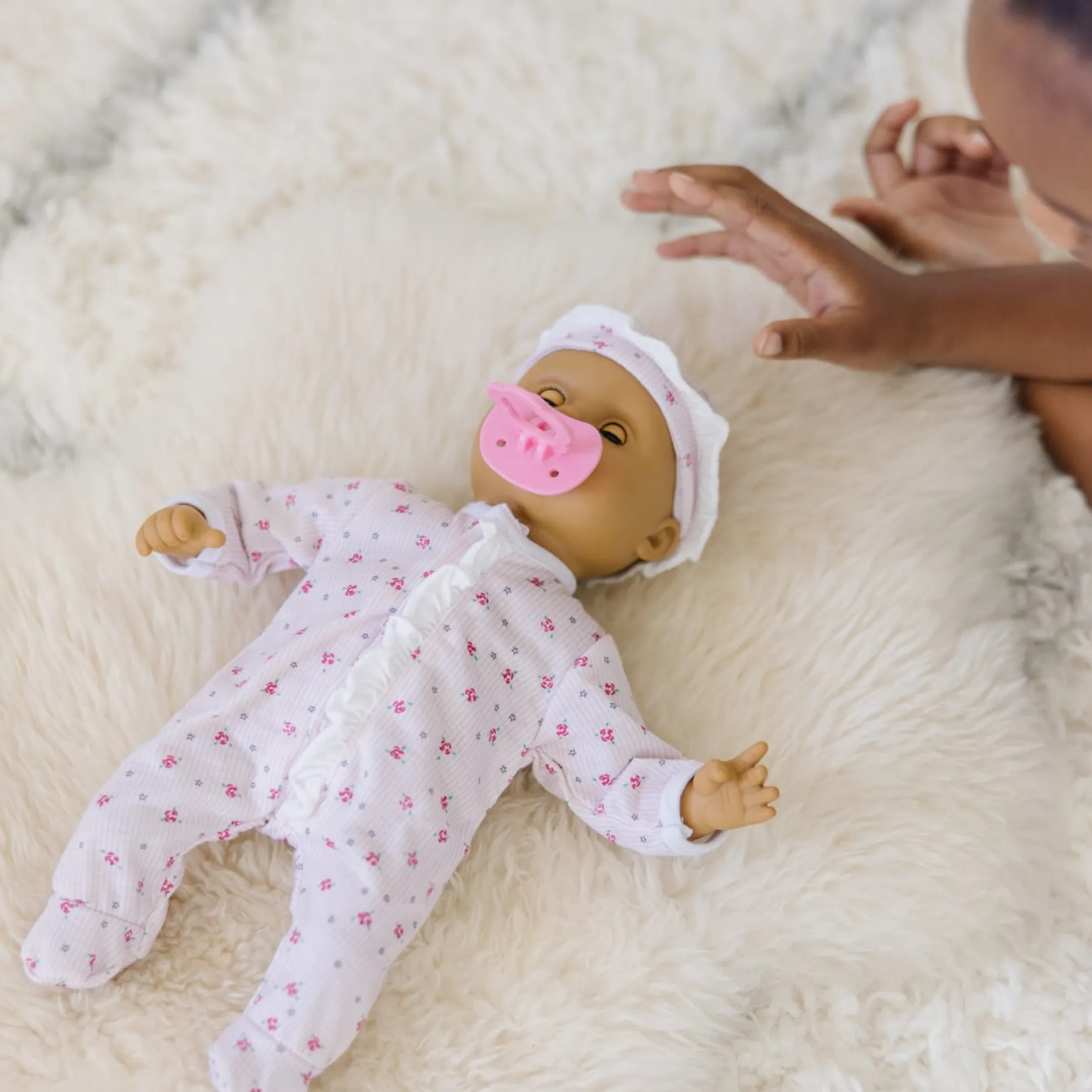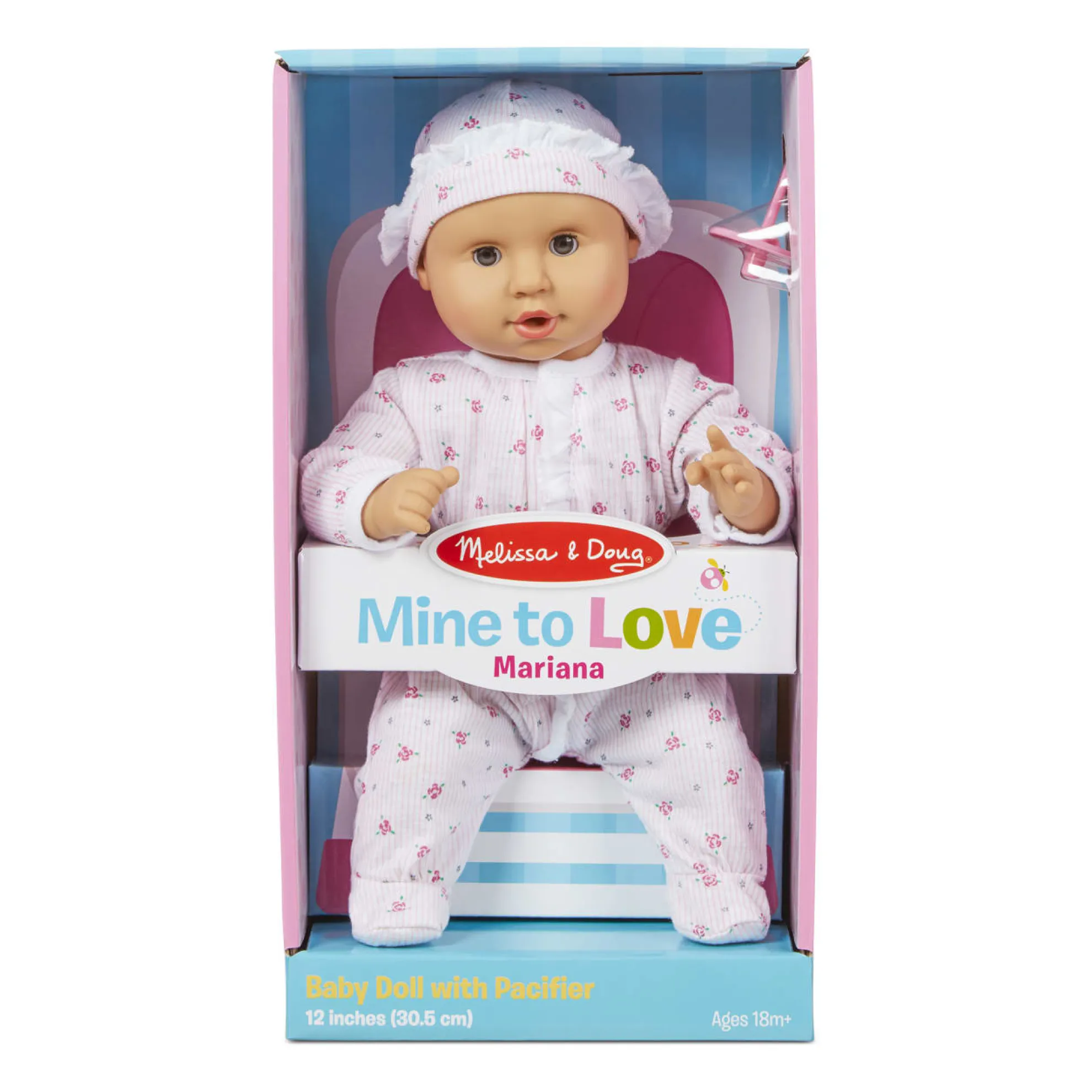 This huggable, lovable baby doll is the perfect size to cuddle. Mariana has molded plastic hair and her beautiful brown eyes open and close. She can even sit up “like a big girl.” Her pretty rosebud clothing is removable for dressing and undressing fun, and she can suck her thumb or the included pacifier. Doll is 12″ tall.