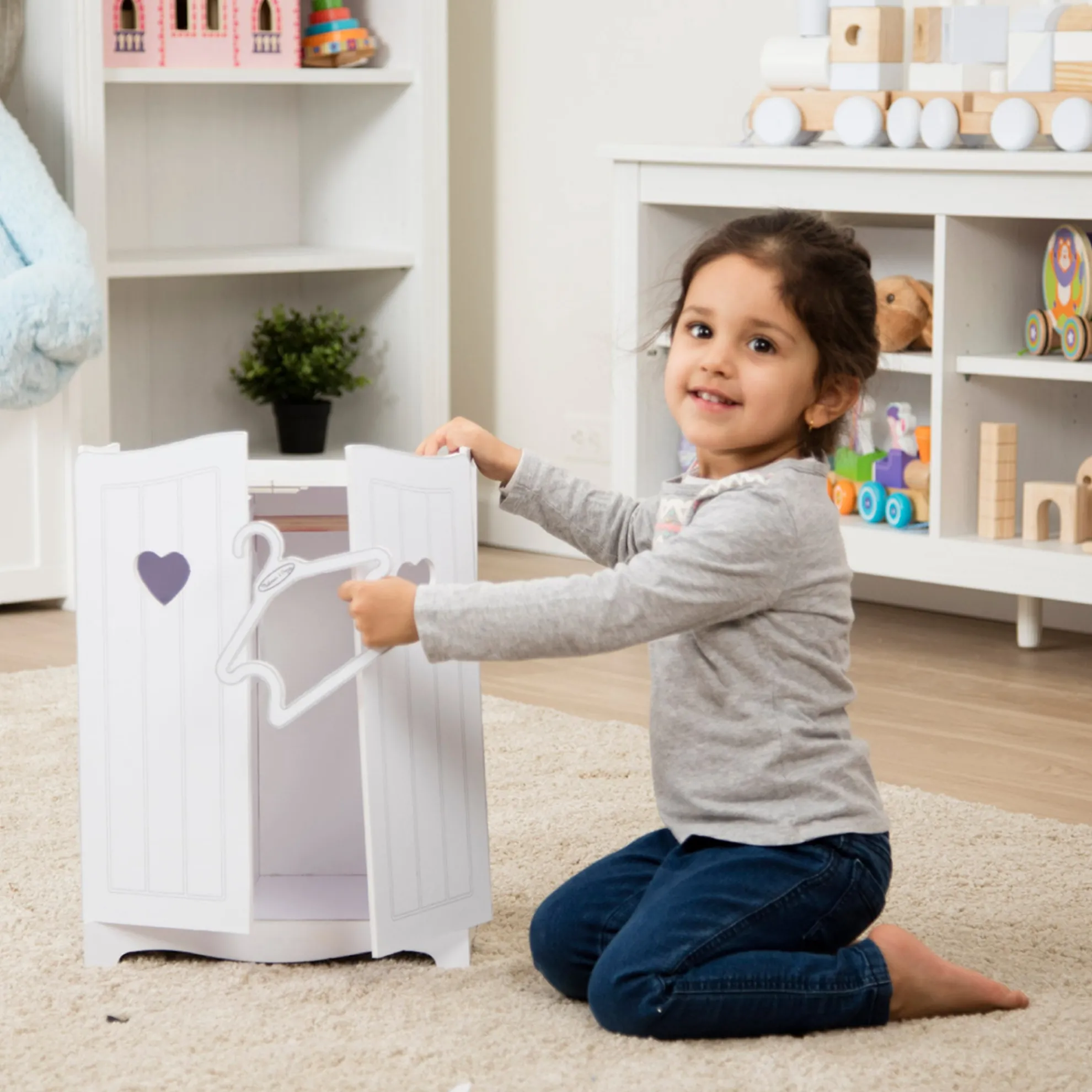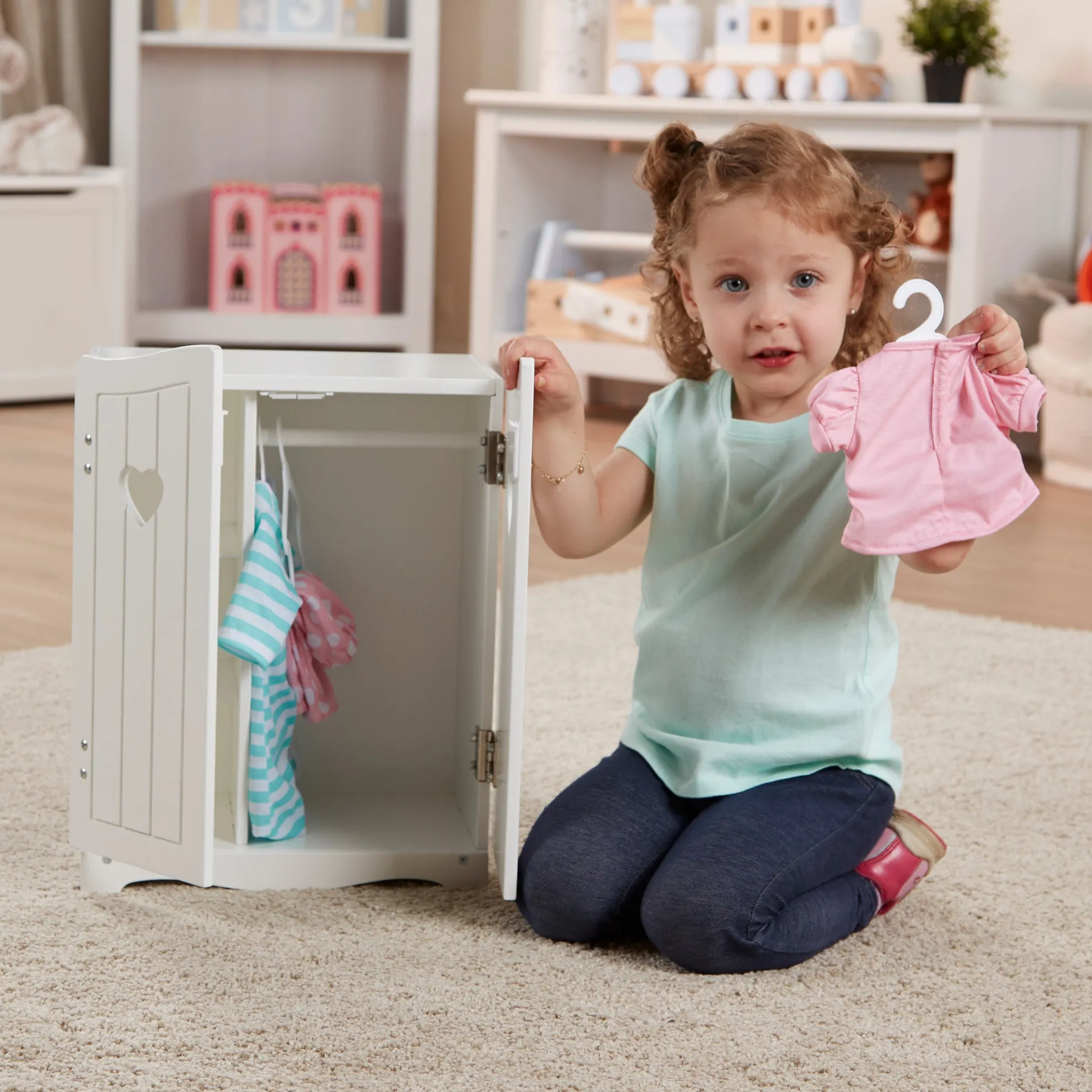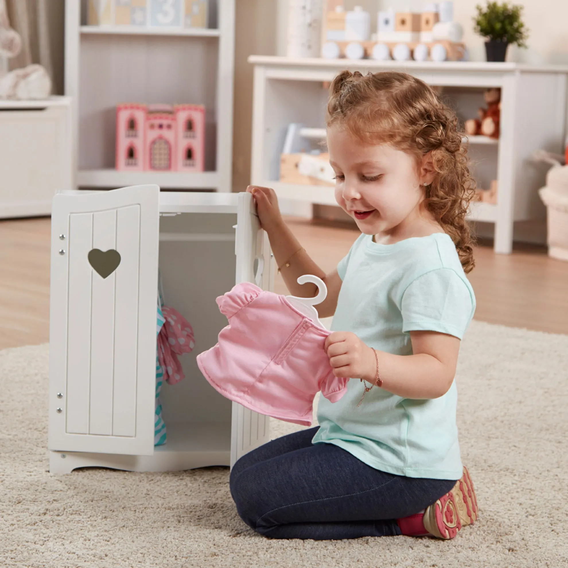 Help favorite dolls and stuffed animals get organized with this realistic and modernly styled wooden armoire that suits any décor! There are three shelves for folded doll clothes and a rod with three hangers for dresses and jackets (clothing not included). The sturdy white closet with two hinged doors stands approximately 17 inches tall and features a wipe-clean surface. Clear instructions make it easy to assemble with just a screwdriver (not included). Mine to Love dolls and accessories encourage empathy and help kids express themselves as they explore grown-up roles and responsibilities. A child’s confidence and self-esteem blossom and grow with each nurturing moment of imaginative play!