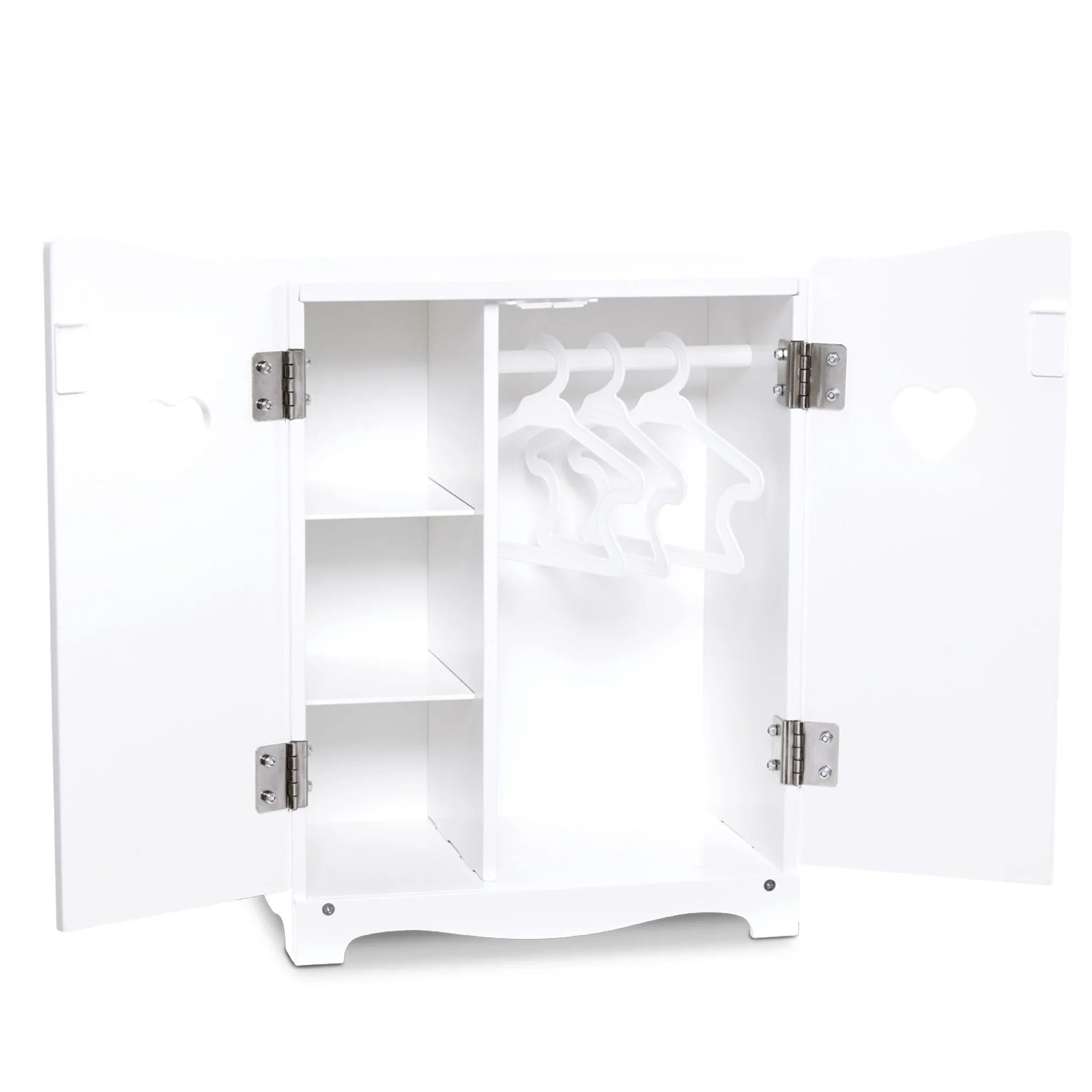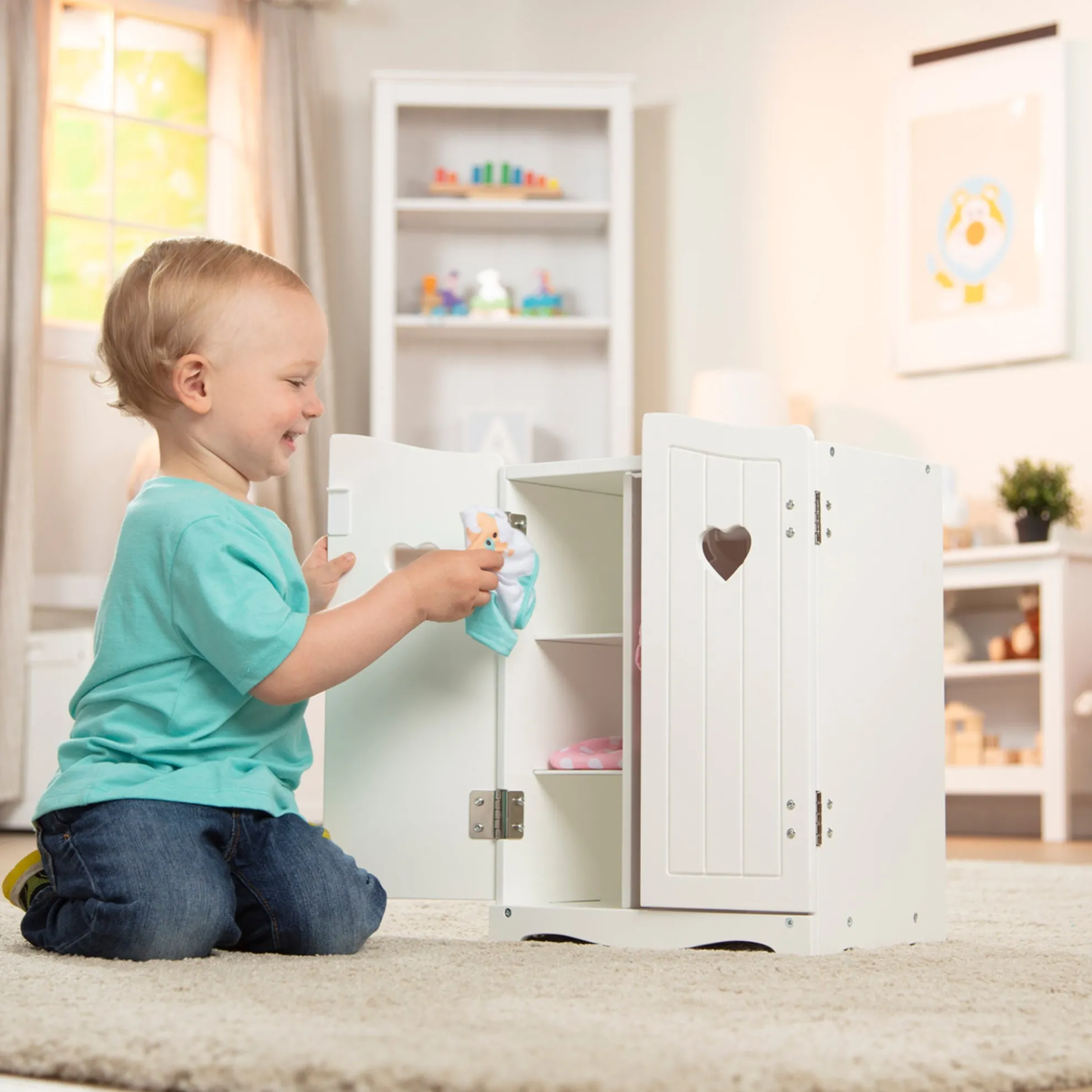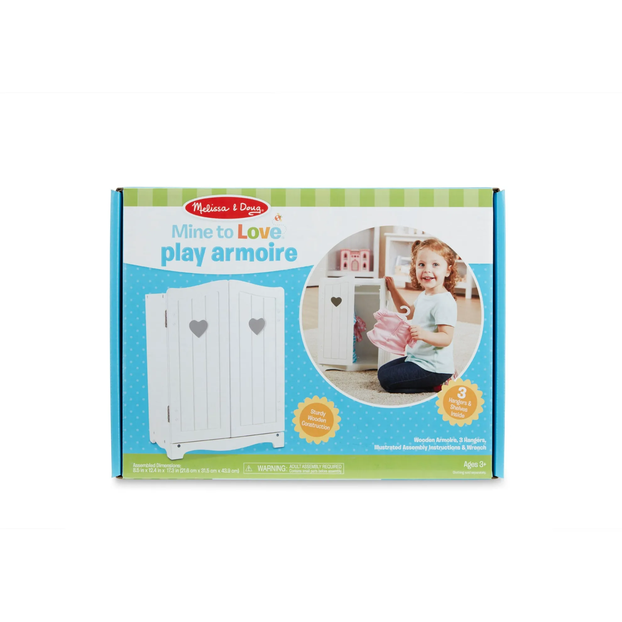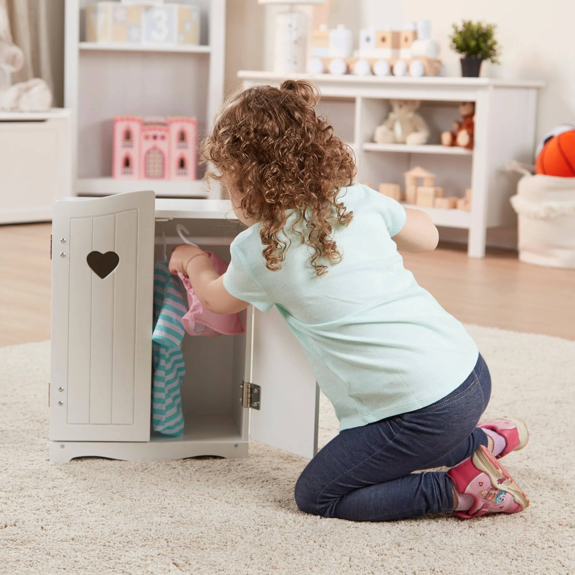 Help favorite dolls and stuffed animals get organized with this realistic and modernly styled wooden armoire that suits any décor! There are three shelves for folded doll clothes and a rod with three hangers for dresses and jackets (clothing not included). The sturdy white closet with two hinged doors stands approximately 17 inches tall and features a wipe-clean surface. Clear instructions make it easy to assemble with just a screwdriver (not included). Mine to Love dolls and accessories encourage empathy and help kids express themselves as they explore grown-up roles and responsibilities. A child’s confidence and self-esteem blossom and grow with each nurturing moment of imaginative play!