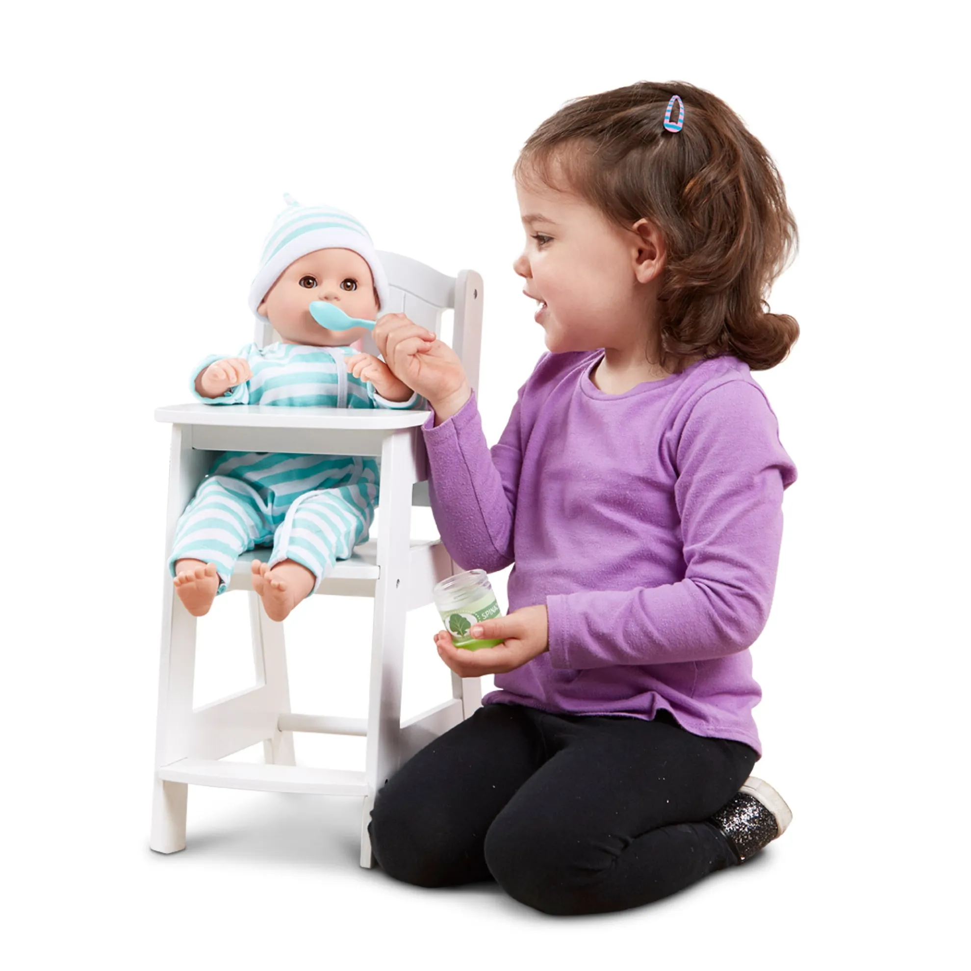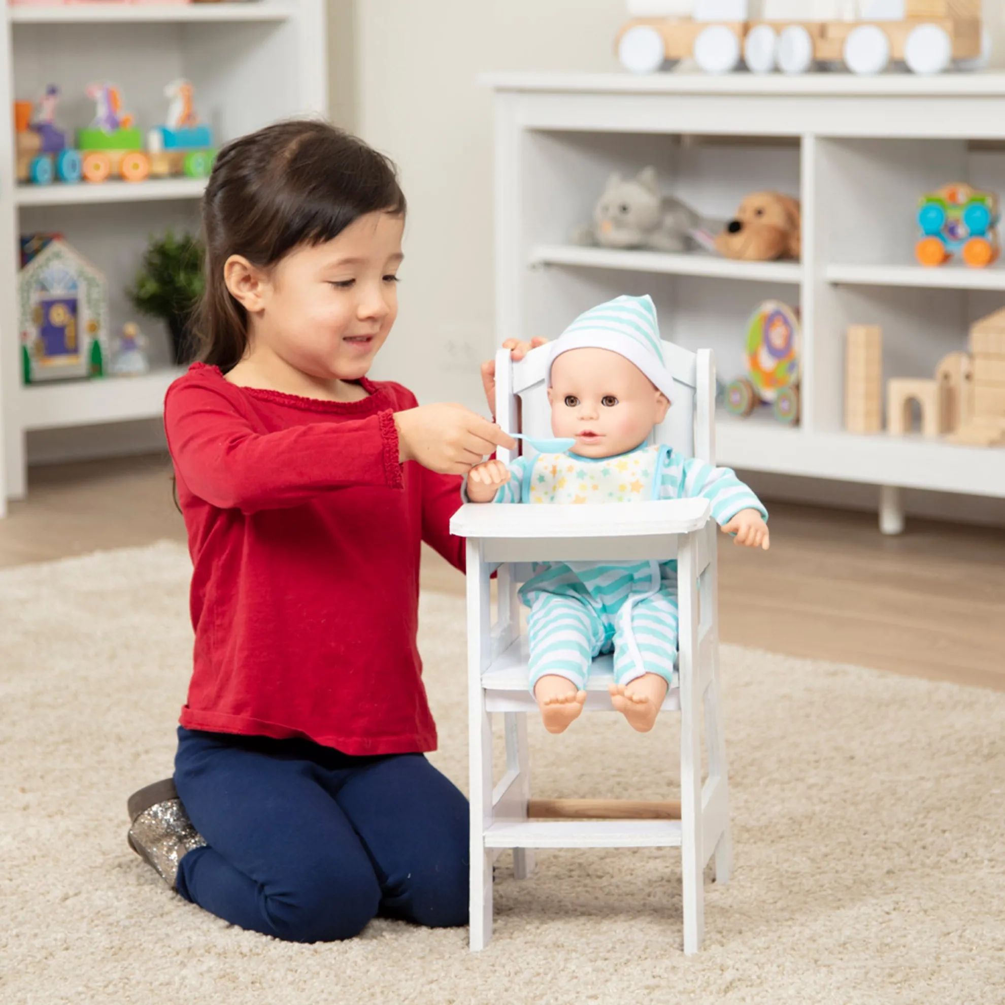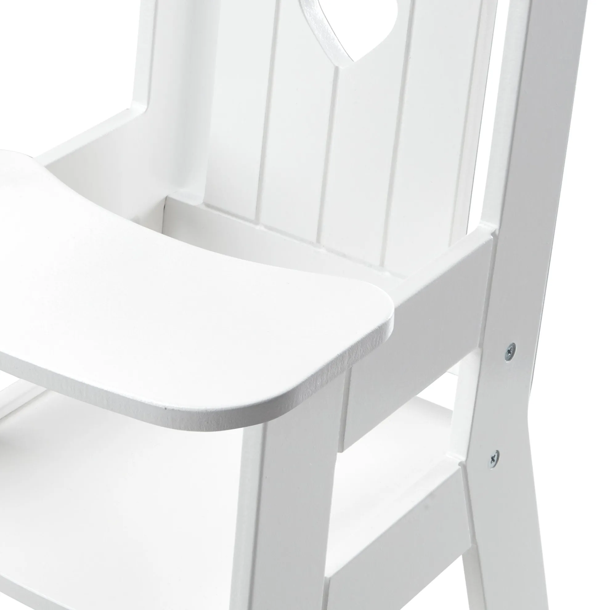 Help favorite dolls and stuffed animals get ready for mealtime in this realistic and classically styled wooden high chair that suits any décor! Made to fit dolls up to 20 inches tall, this durable white chair stands approximately 18 inches tall and features a removable tray and wipe-clean surface. Clear instructions make it easy to assemble with just a screwdriver (not included). Mine to Love dolls and accessories encourage empathy and help kids express themselves as they explore grown-up roles and responsibilities. A child’s confidence and self-esteem blossom and grow with each nurturing moment of imaginative play!