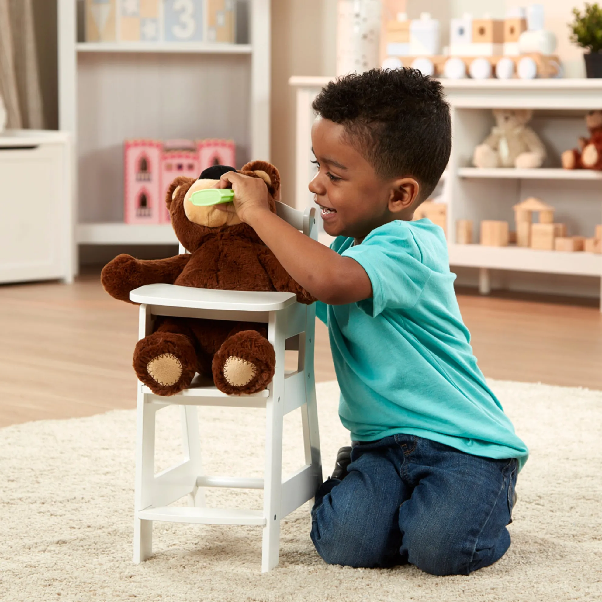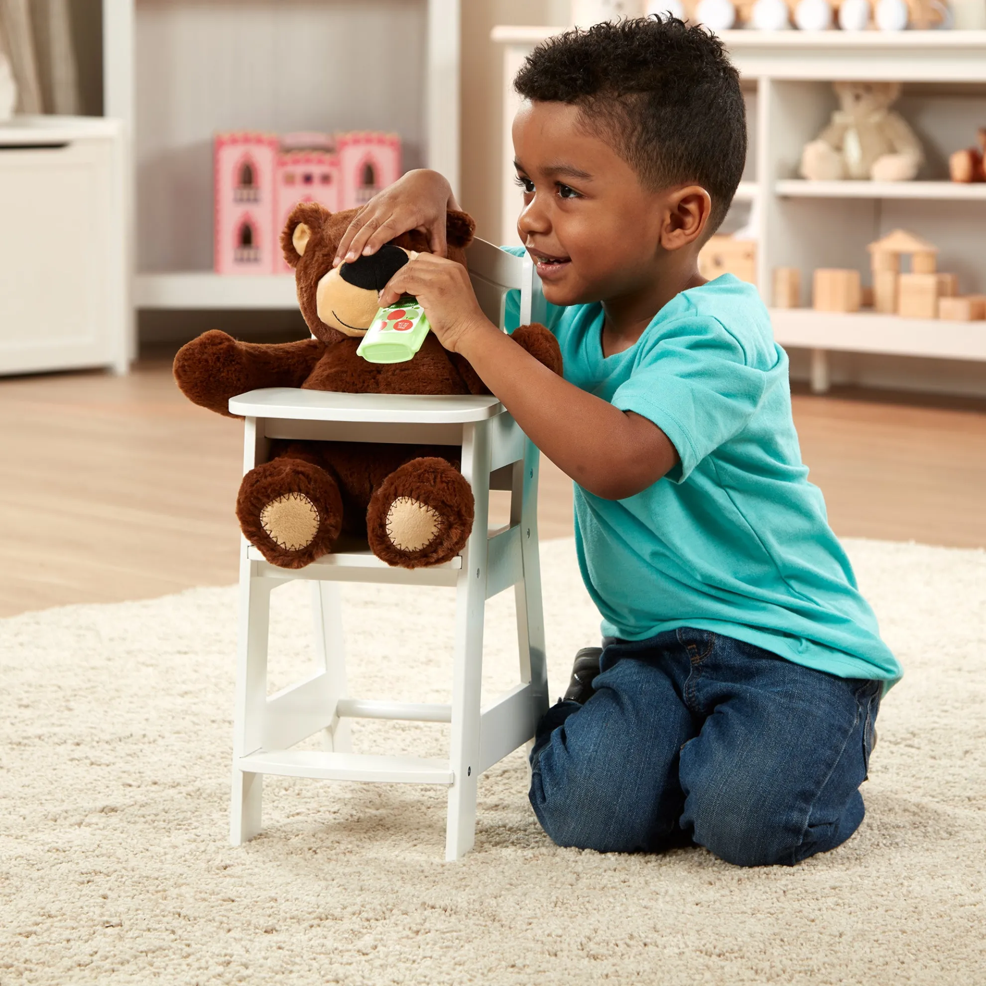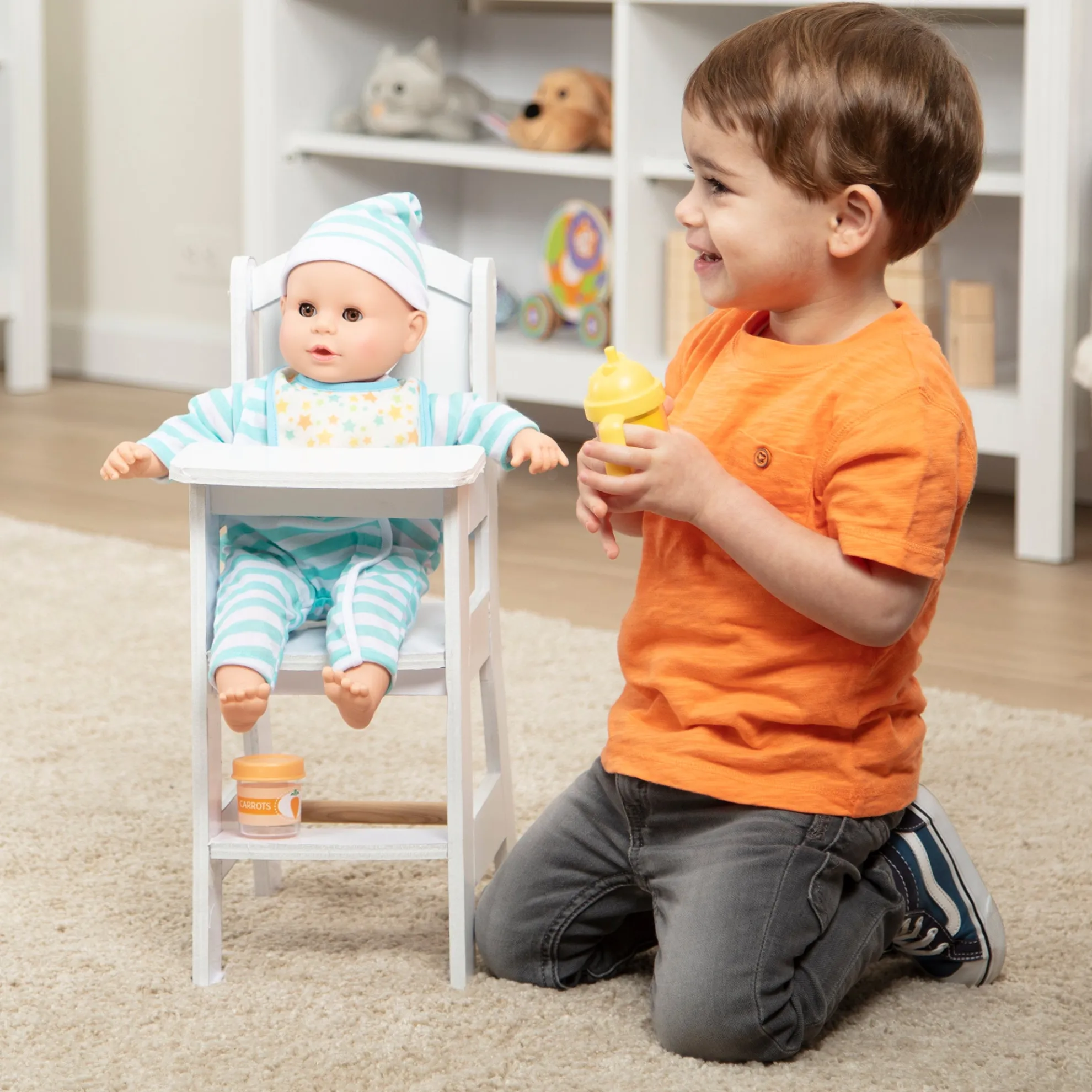 Help favorite dolls and stuffed animals get ready for mealtime in this realistic and classically styled wooden high chair that suits any décor! Made to fit dolls up to 20 inches tall, this durable white chair stands approximately 18 inches tall and features a removable tray and wipe-clean surface. Clear instructions make it easy to assemble with just a screwdriver (not included). Mine to Love dolls and accessories encourage empathy and help kids express themselves as they explore grown-up roles and responsibilities. A child’s confidence and self-esteem blossom and grow with each nurturing moment of imaginative play!