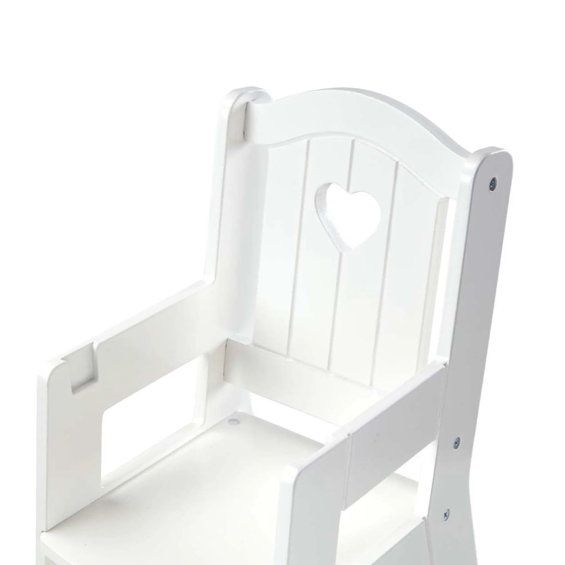 - White wooden play high chair for dolls and stuffed animals up to 20 inches tall
