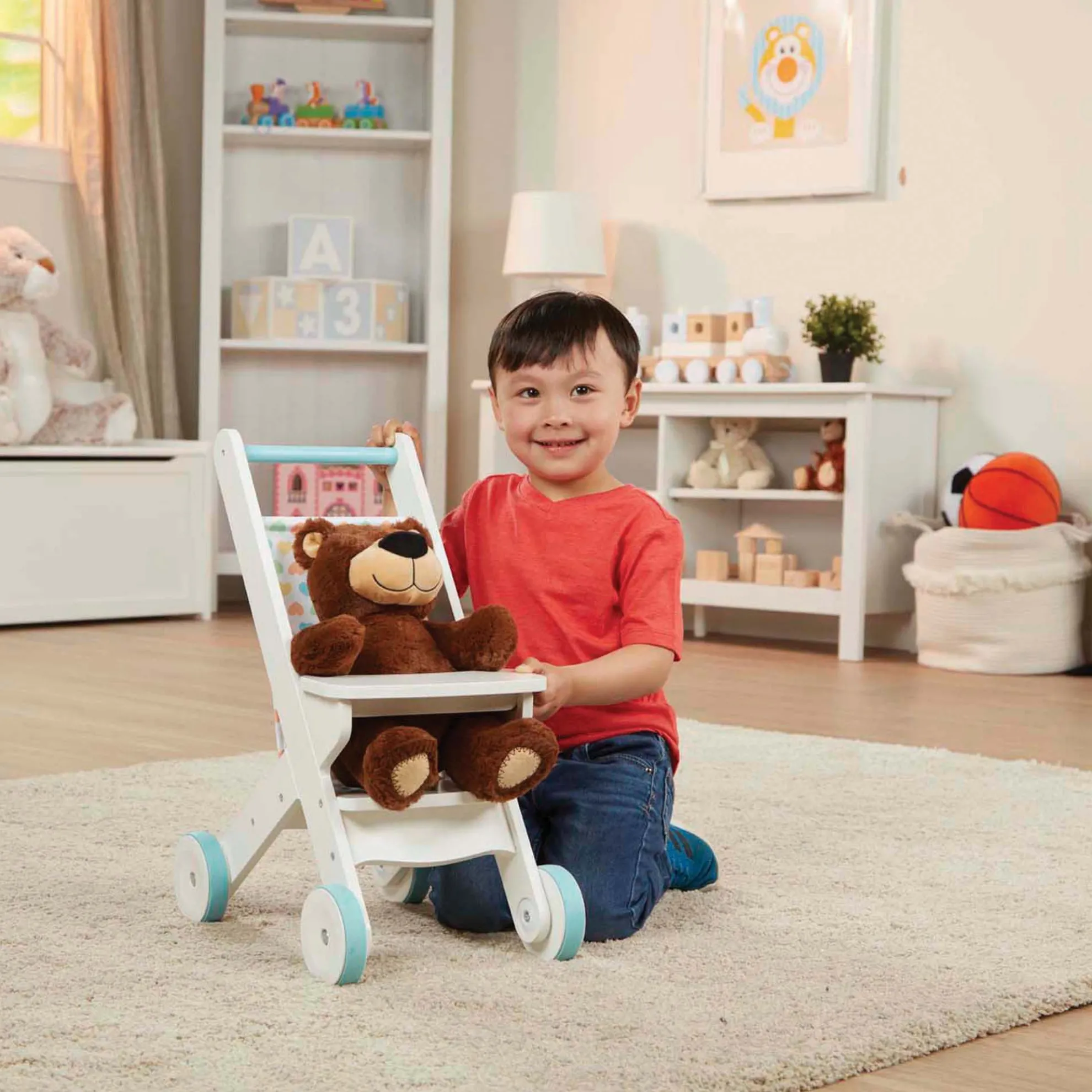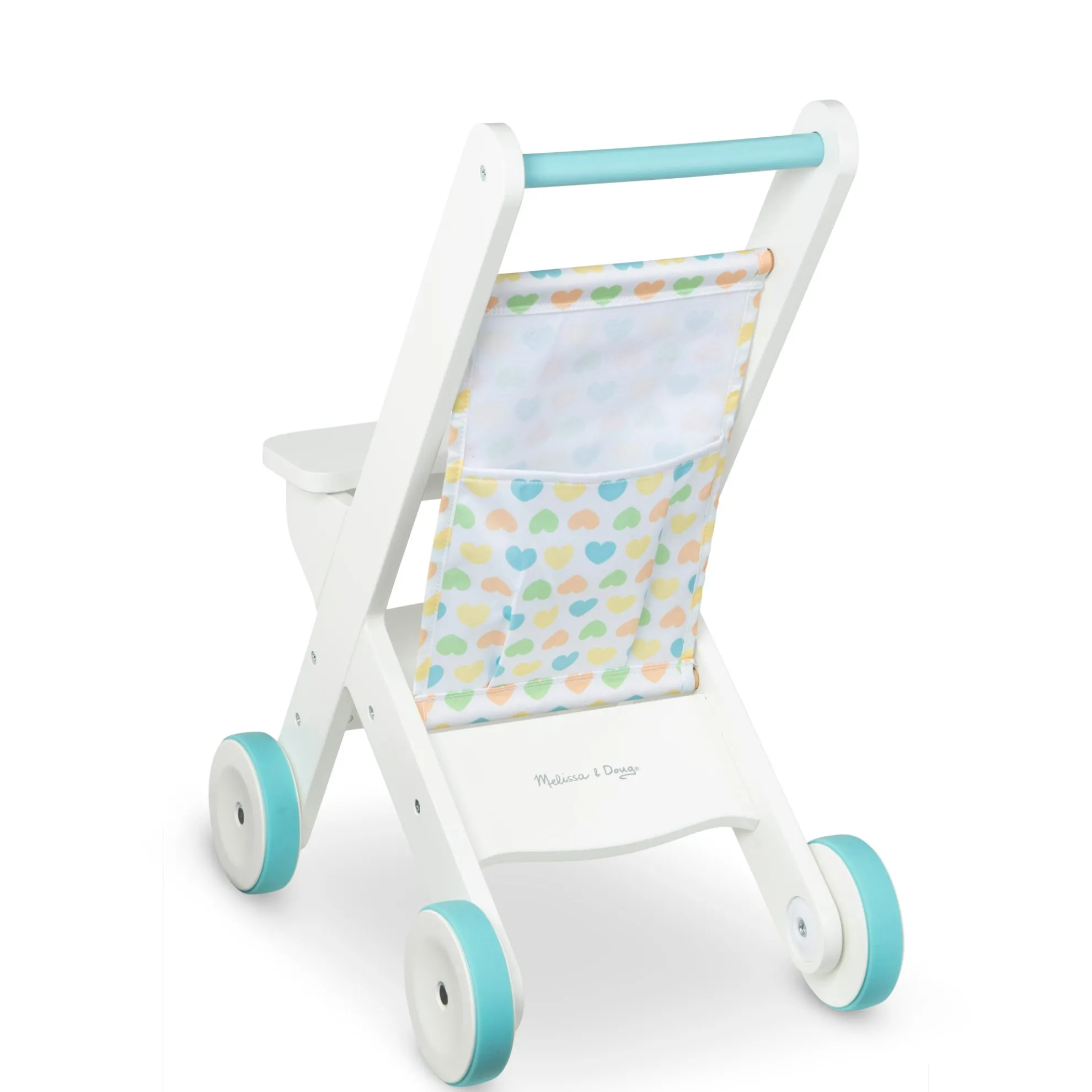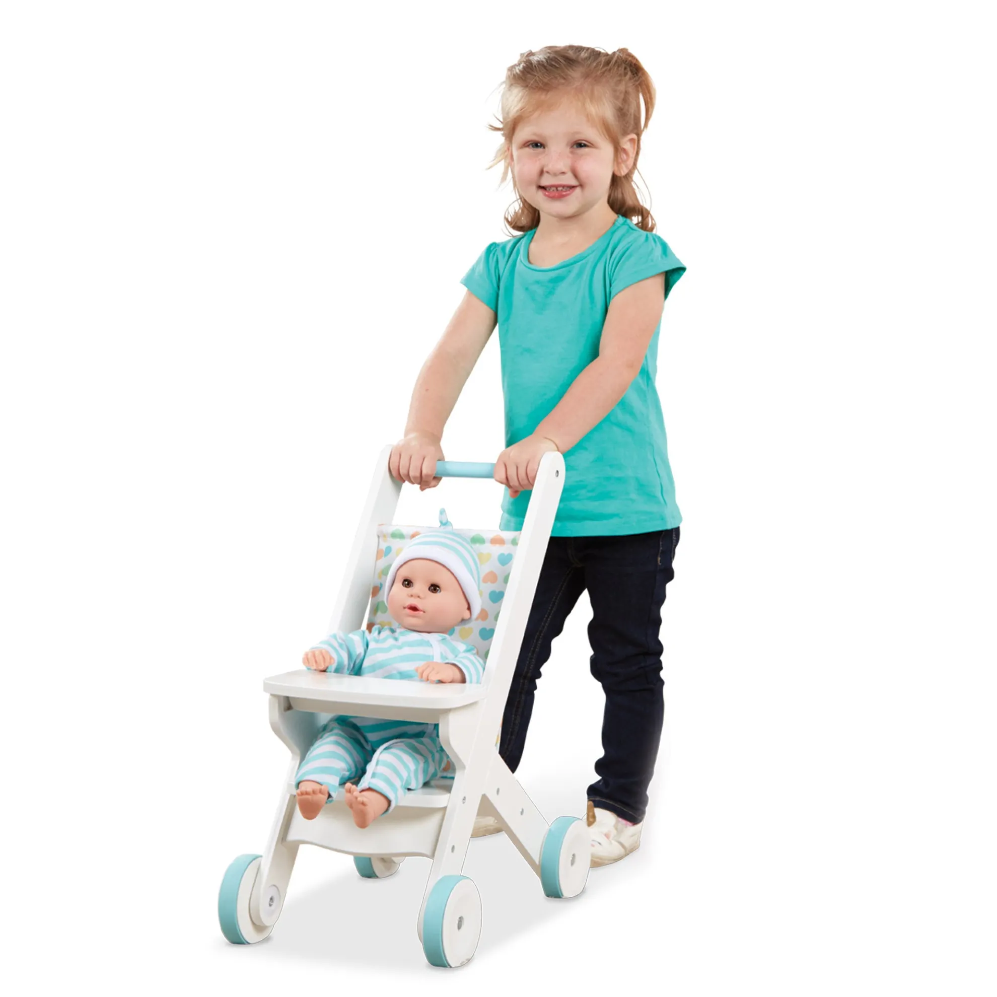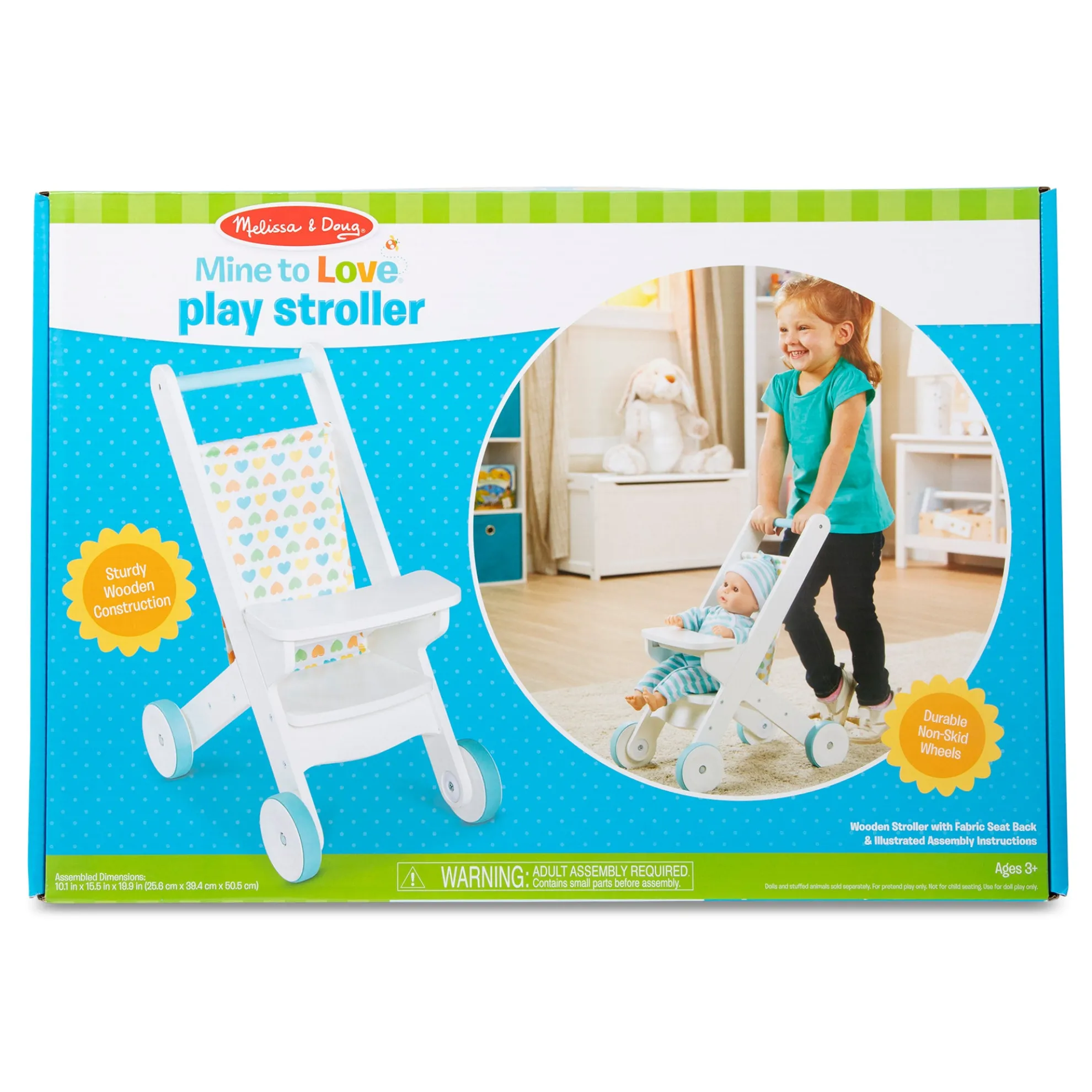 Anytime is a good time for favorite dolls and stuffed animals to go for a stroll in this cozy and classically styled rolling wooden stroller! Made to fit dolls up to 20 inches tall, this durable white stroller stands approximately 20 inches tall and features non-skid wheels, a fabric seat back, and a cloth pocket to take toys and necessities on the go. Clear instructions make it easy to assemble with just a screwdriver (not included). Mine to Love dolls and accessories encourage empathy and help kids express themselves as they explore grown-up roles and responsibilities. A child’s confidence and self-esteem blossom and grow with each nurturing moment of imaginative play!