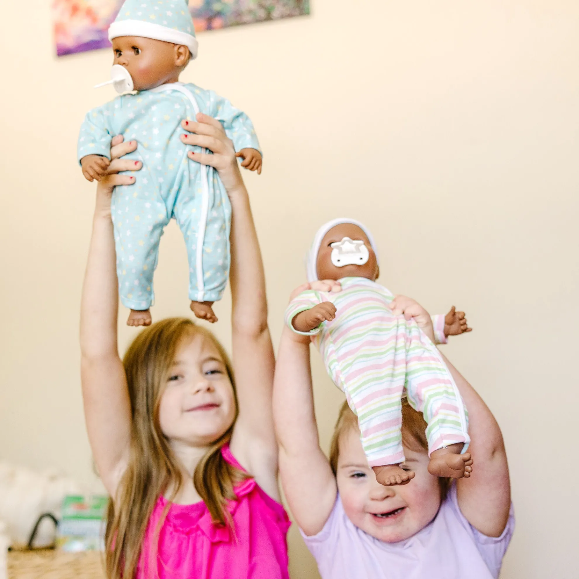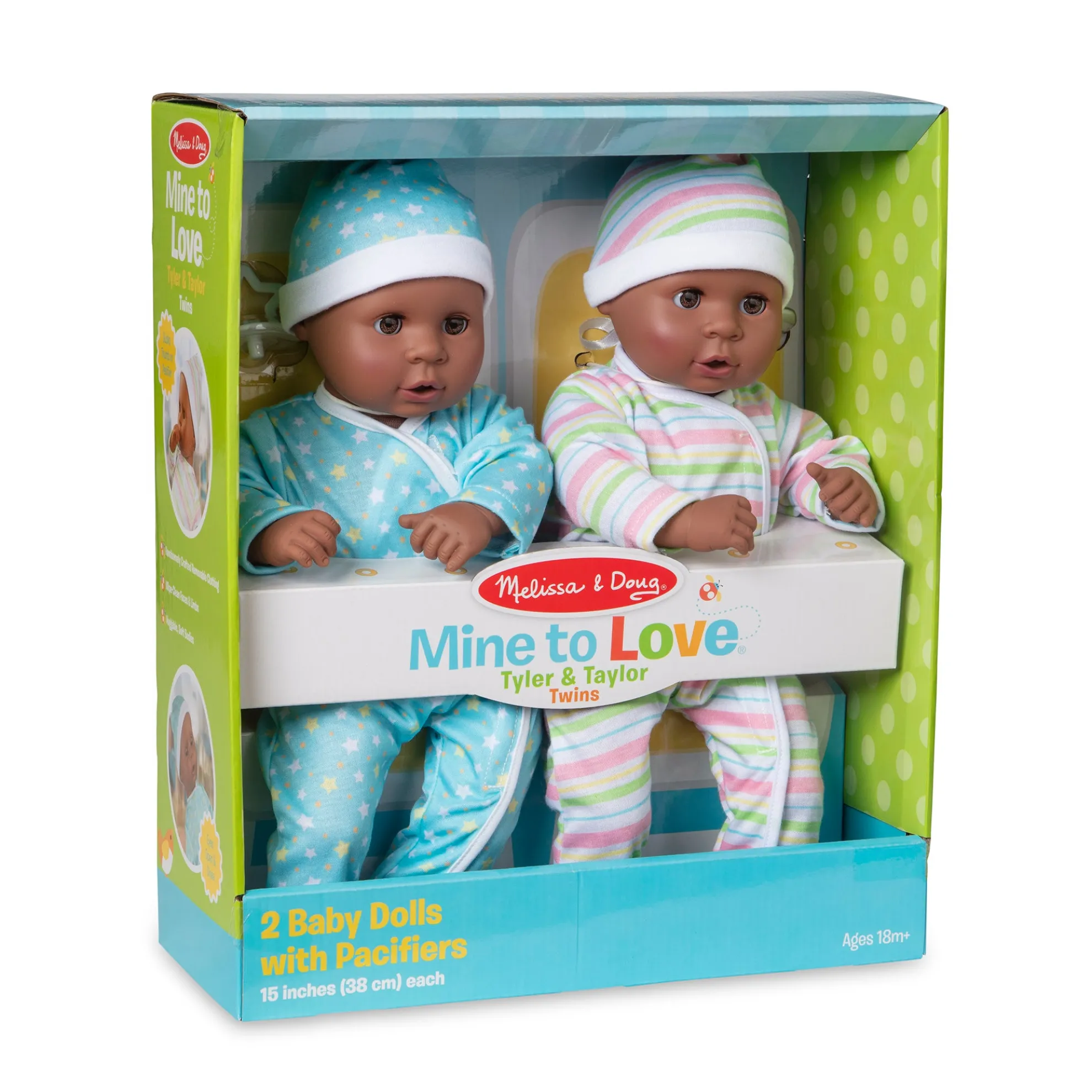 It’s twice the fun with twin 15-inch dolls Tyler and Taylor! They have adorable coordinating removable rompers and caps, eyes that open and close, and they can suck their thumbs or the included pacifiers. Just right for kids 18 months and older, their soft, huggable bodies are lightly scented, with wipe-clean, dark skin-tone faces and limbs. Mine to Love dolls and accessories encourage empathy and help kids express themselves as they explore grown-up roles and responsibilities. A child’s confidence and self-esteem blossom and grow with each nurturing moment of imaginative play. Tyler and Taylor are just waiting for a child to call them “Mine to Love”!