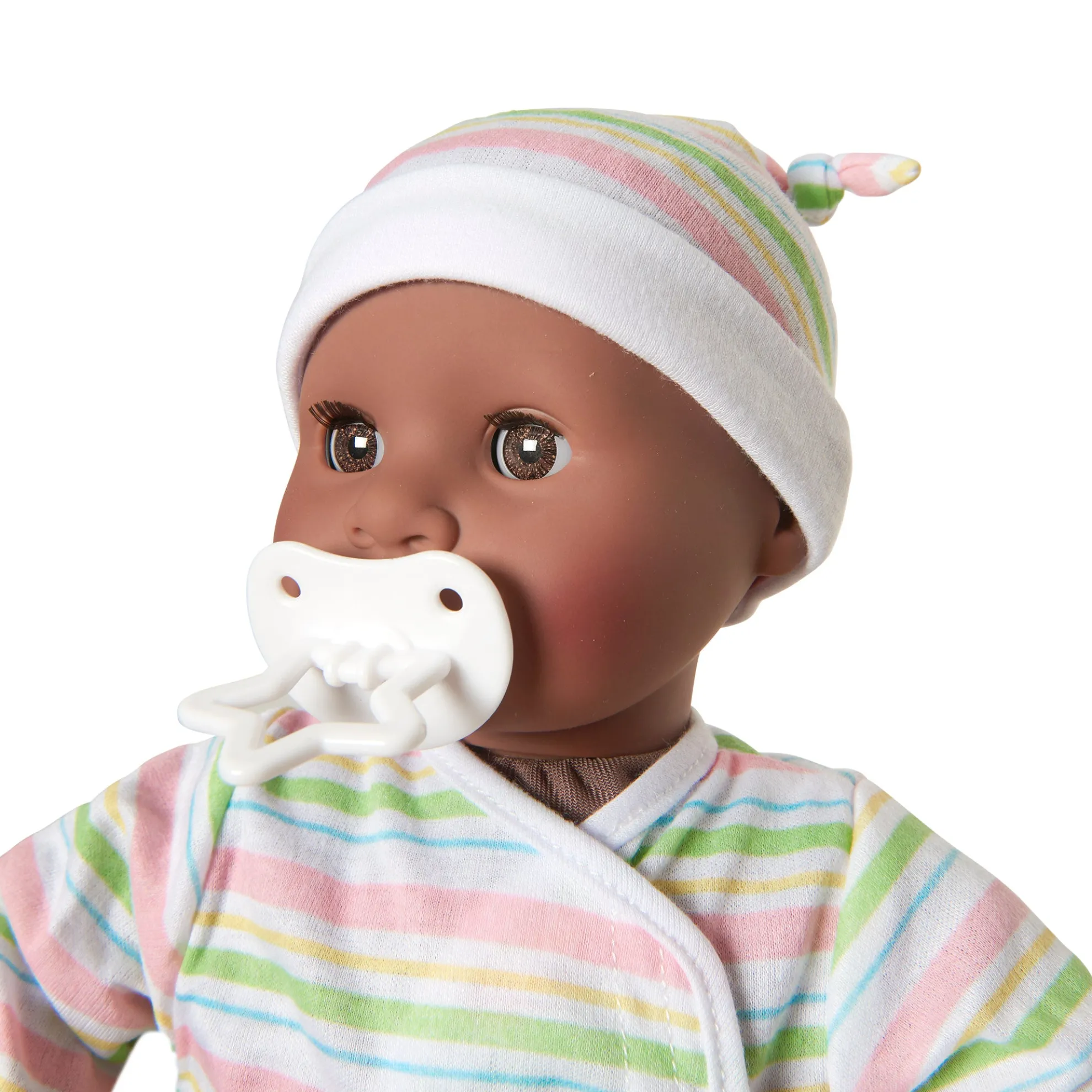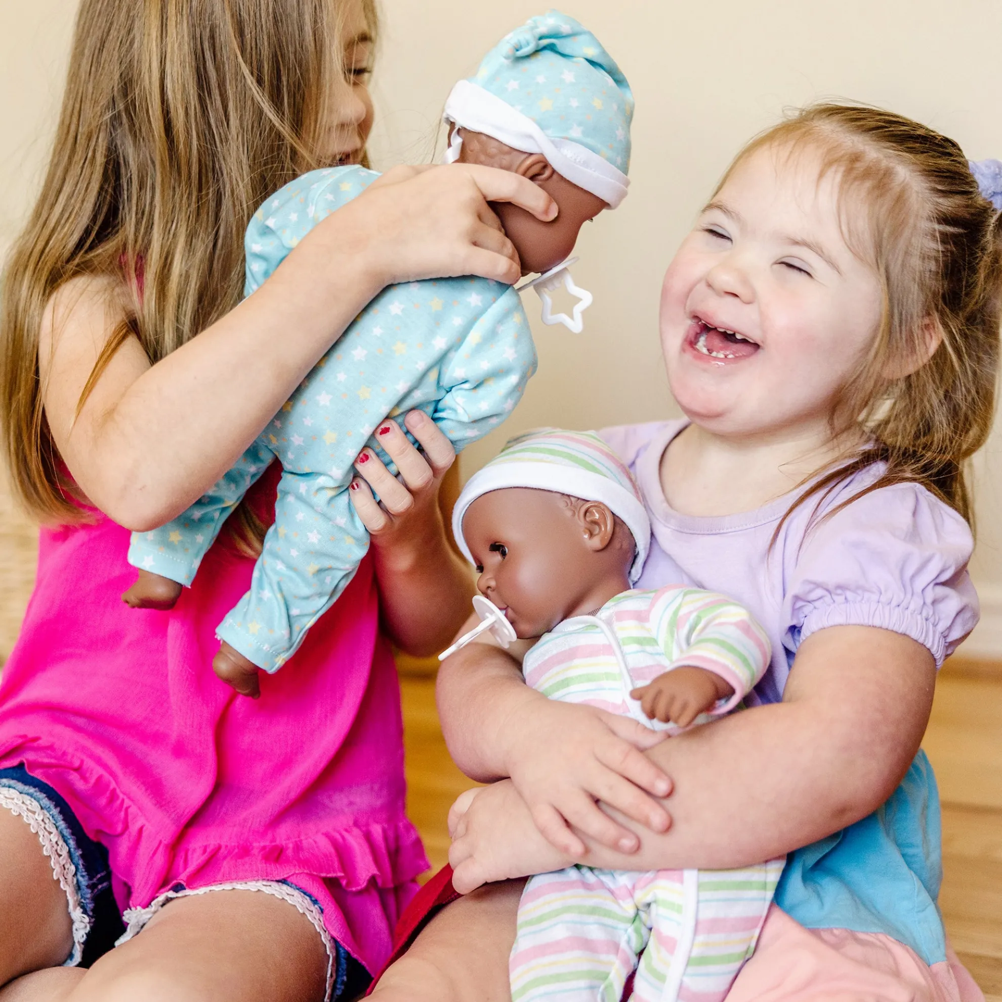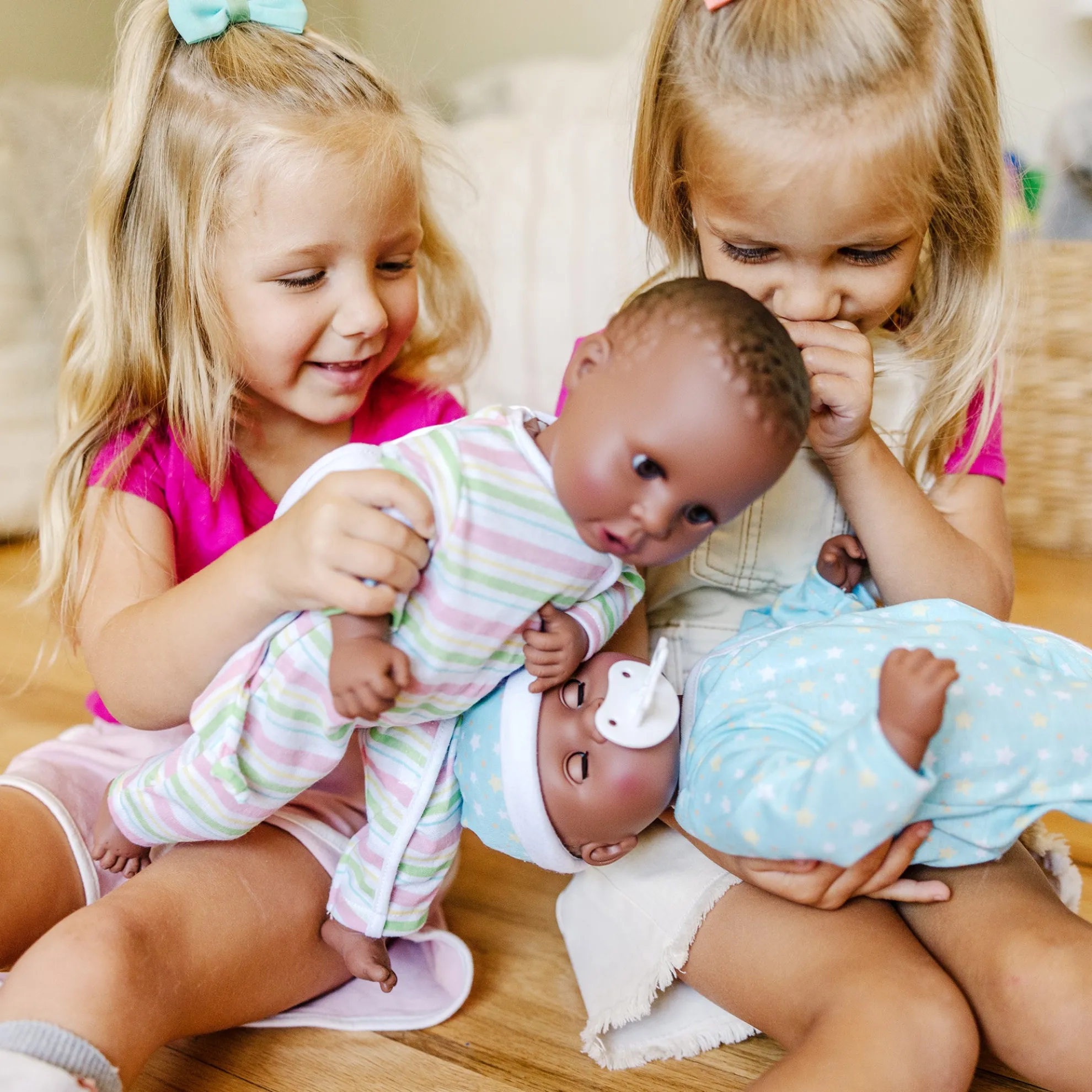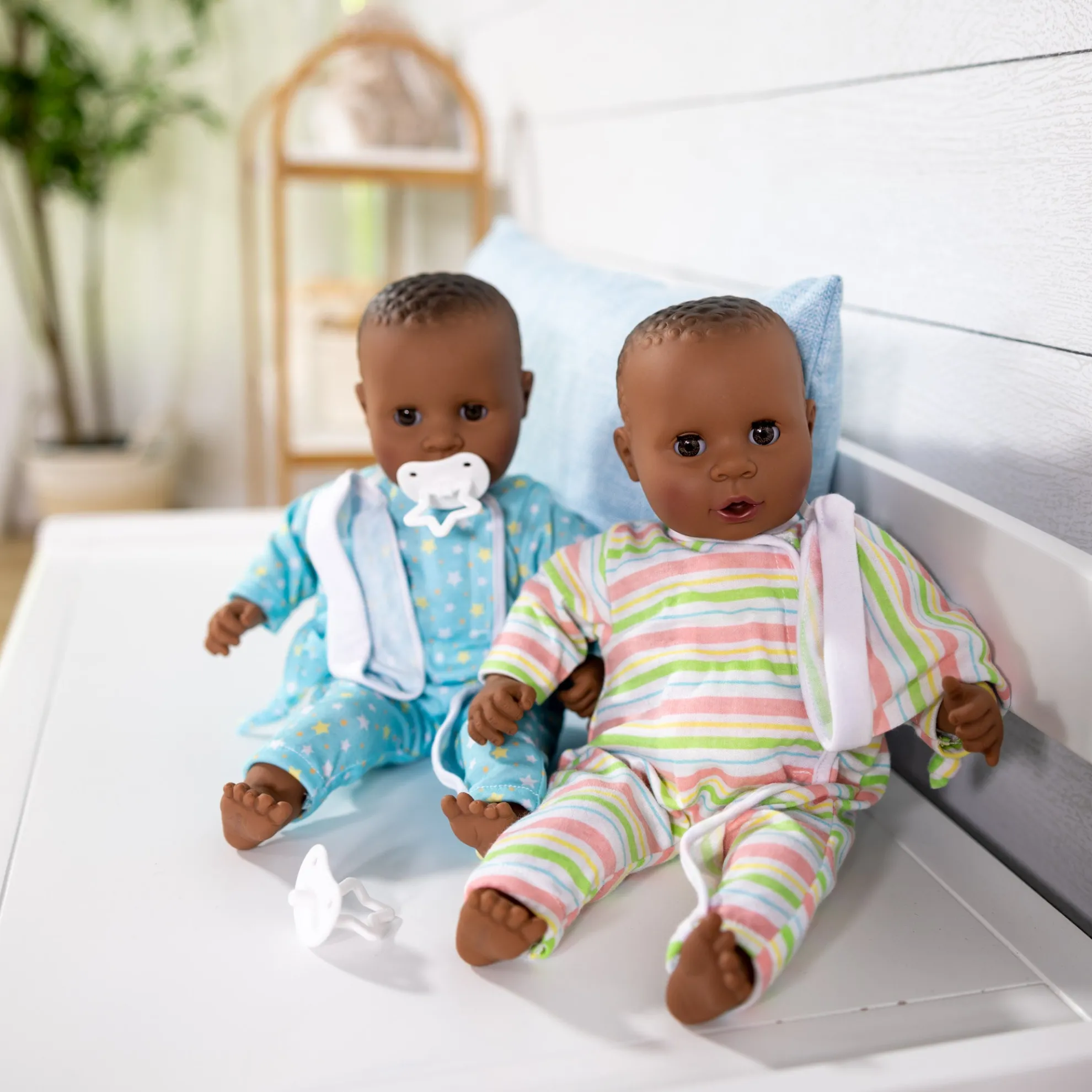 - Two 15-inch clothed boy and girl baby dolls with dark skin tone that can suck their thumbs or pacifiers