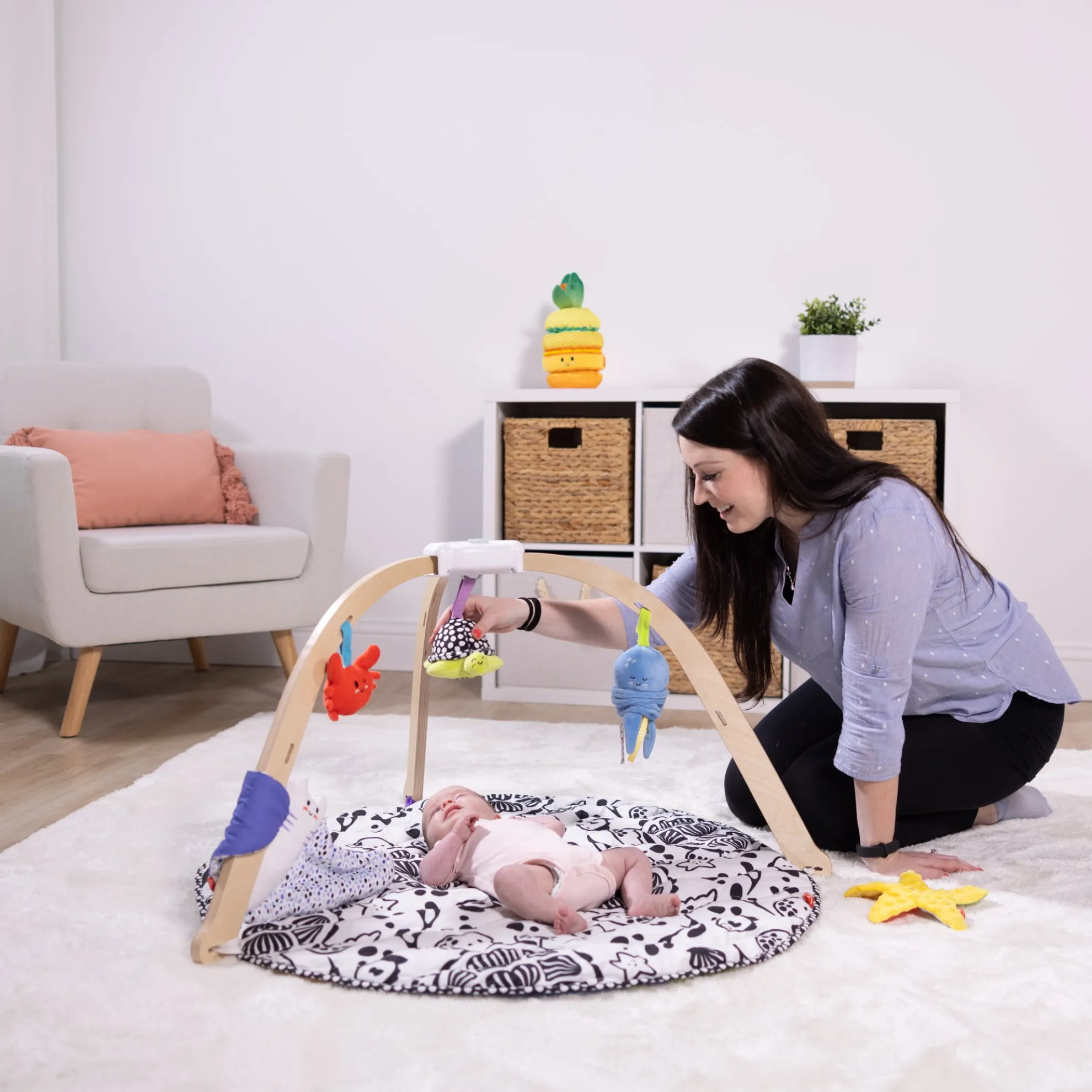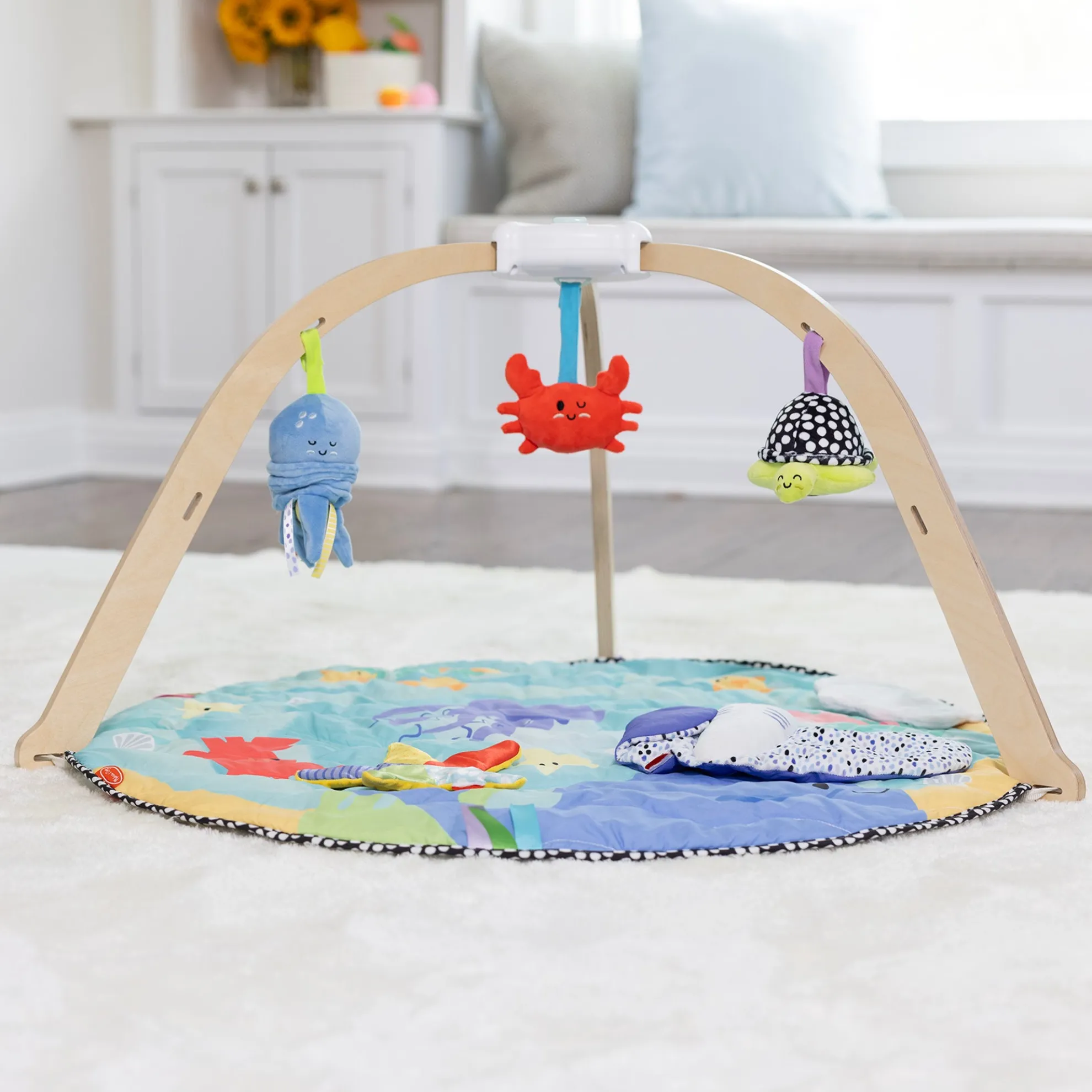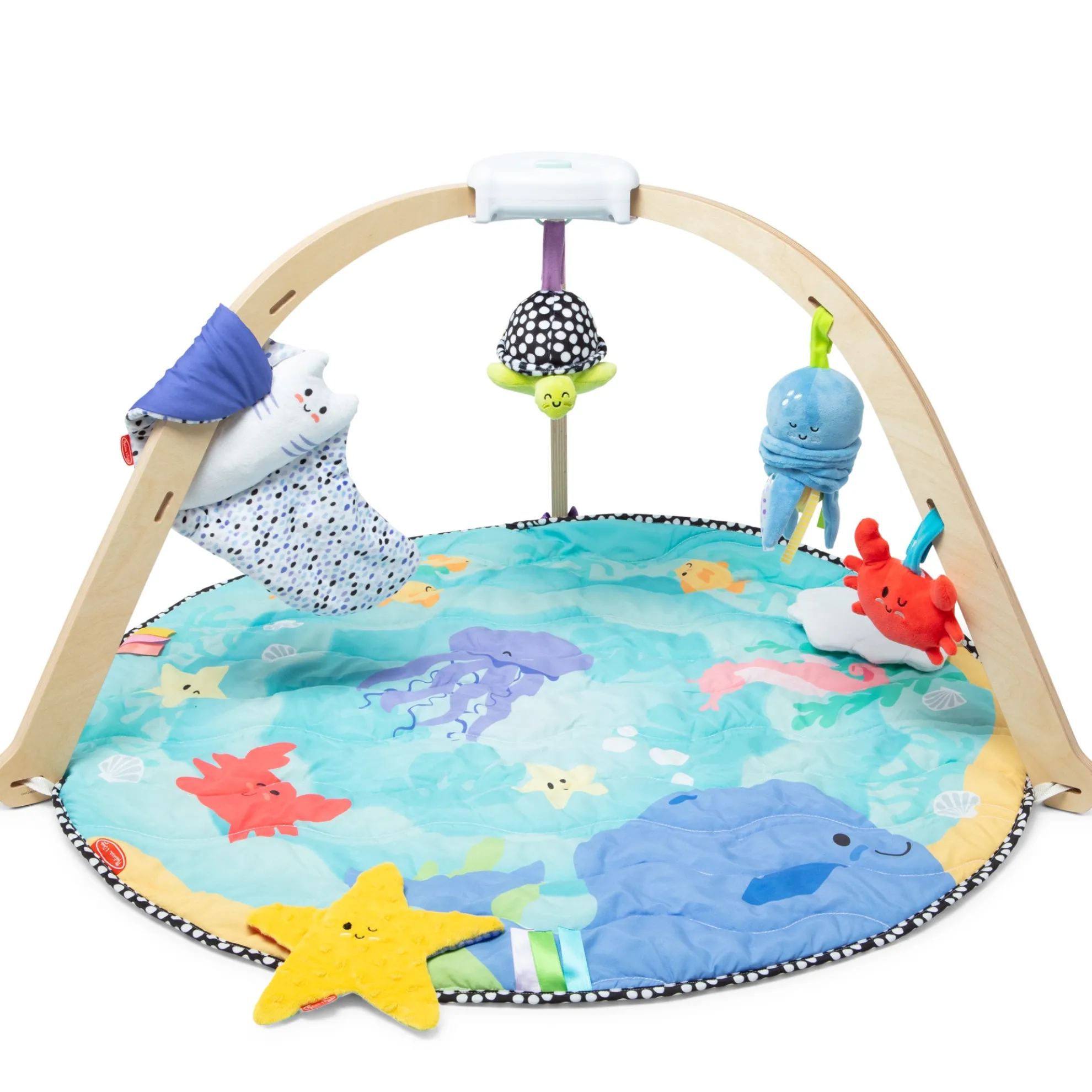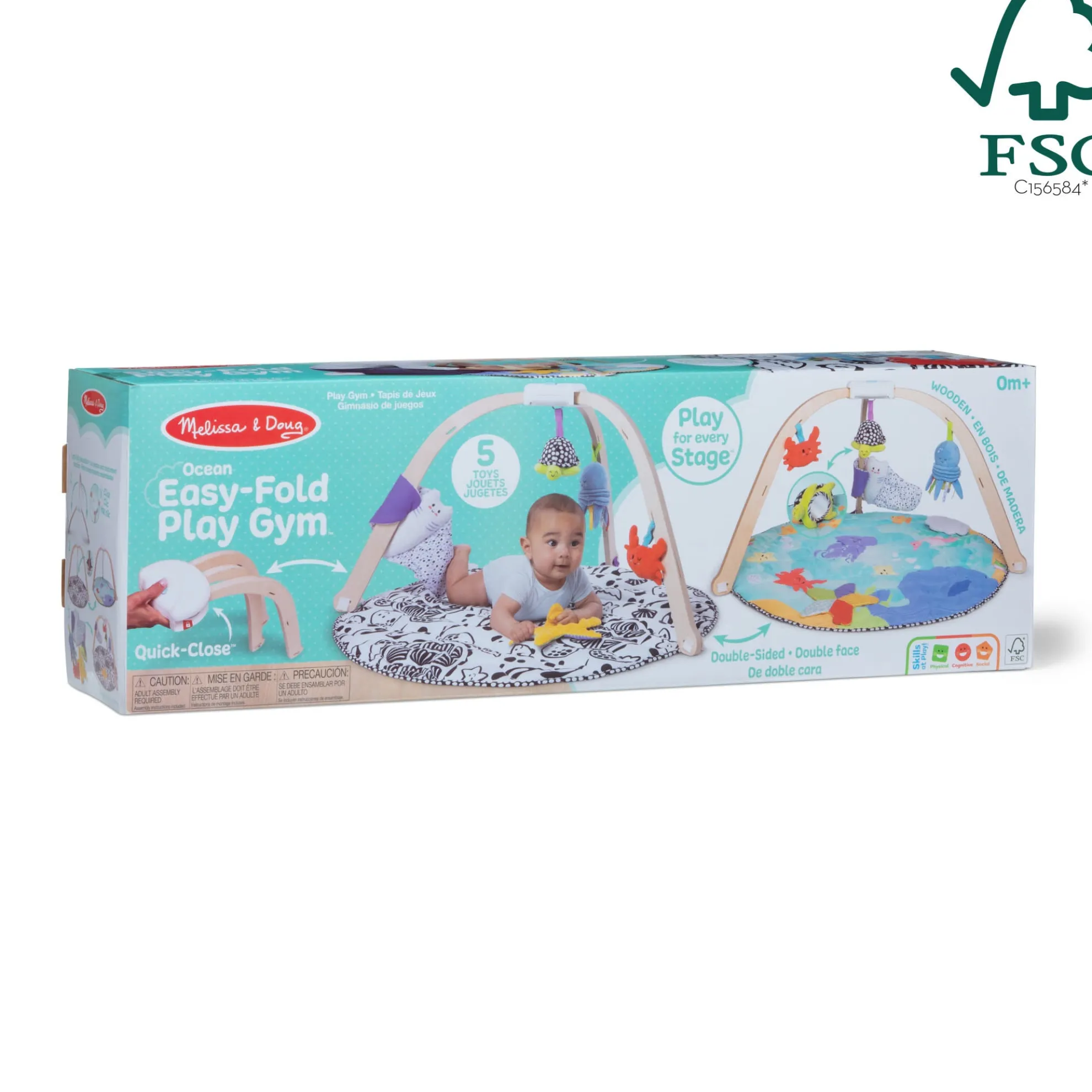 The Melissa & Doug Ocean Easy-Fold Play Gym with Quick-Close™ storage is thoughtfully designed to encourage babies from birth to 9 months old to play and learn through multiple stages and ages! Sturdy, wide wooden arches are pre-assembled for easy set-up and offer caregivers easy access to baby. The arches stay secure on the comfy, reversible play mat with sensory ribbons and a crinkling peek-a-boo clam shell. One side of the mat features high-contrast black-and-white graphics for early visual stimulation, and the other includes a full-color ocean scene to keep older babies engaged as vision develops. Attach the included soft, skill-supporting toys to the gym or play with them independently! There’s a vibrating wiggly octopus, a chiming high-contrast turtle with built-in safety mirror, a double-sided, multi-textured crinkling sea star, a bright squeaking crab, and a chiming manta ray that rattles when it’s kicked. Mat and toys are machine washable. Press the innovative Quick-Close™ button to unlock the frame and easily fold for storage or to take the play gym on the go! The included Play Guide illustrates the many ways the play gym supports the powerful role play has in brain development, physical well-being, and creating connections! This product is certified by the Forest Stewardship Council. FSC certification ensures that products come from responsibly managed forests that provide environmental, social, and economic benefits, and that forests are protected for future generations. Please note that FSC certification applies to new inventory only (FSC C156584)