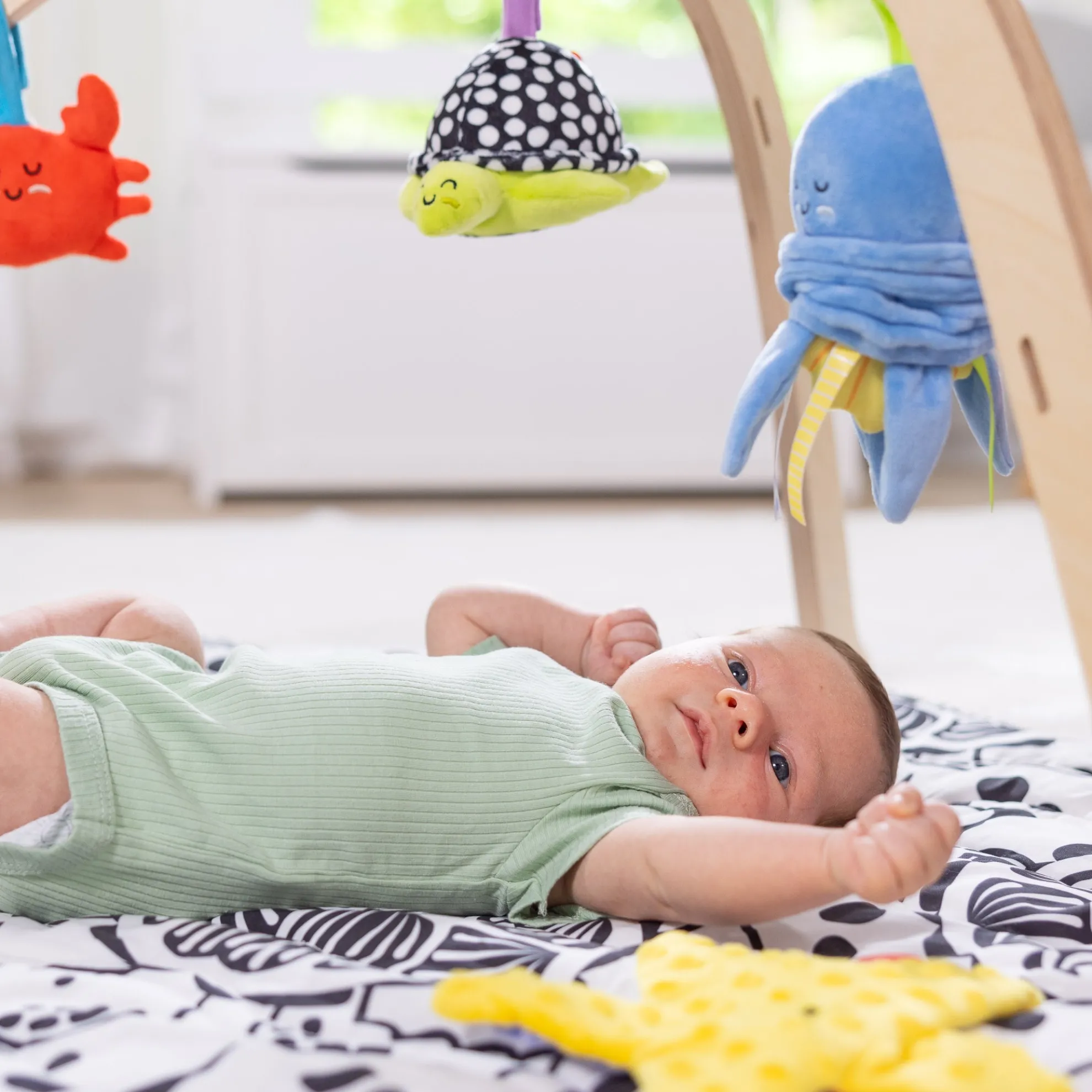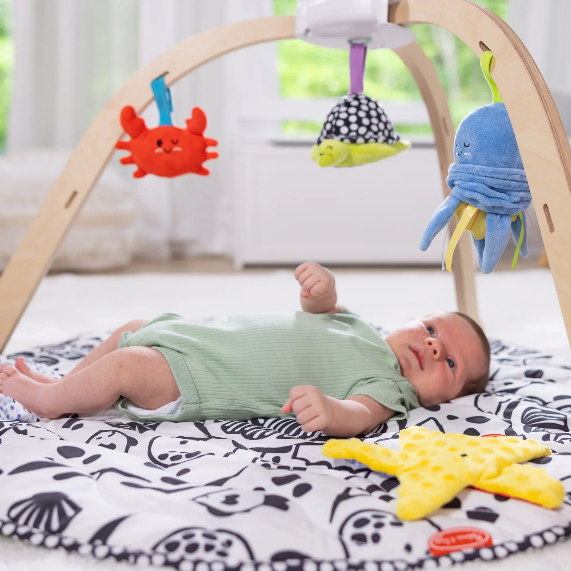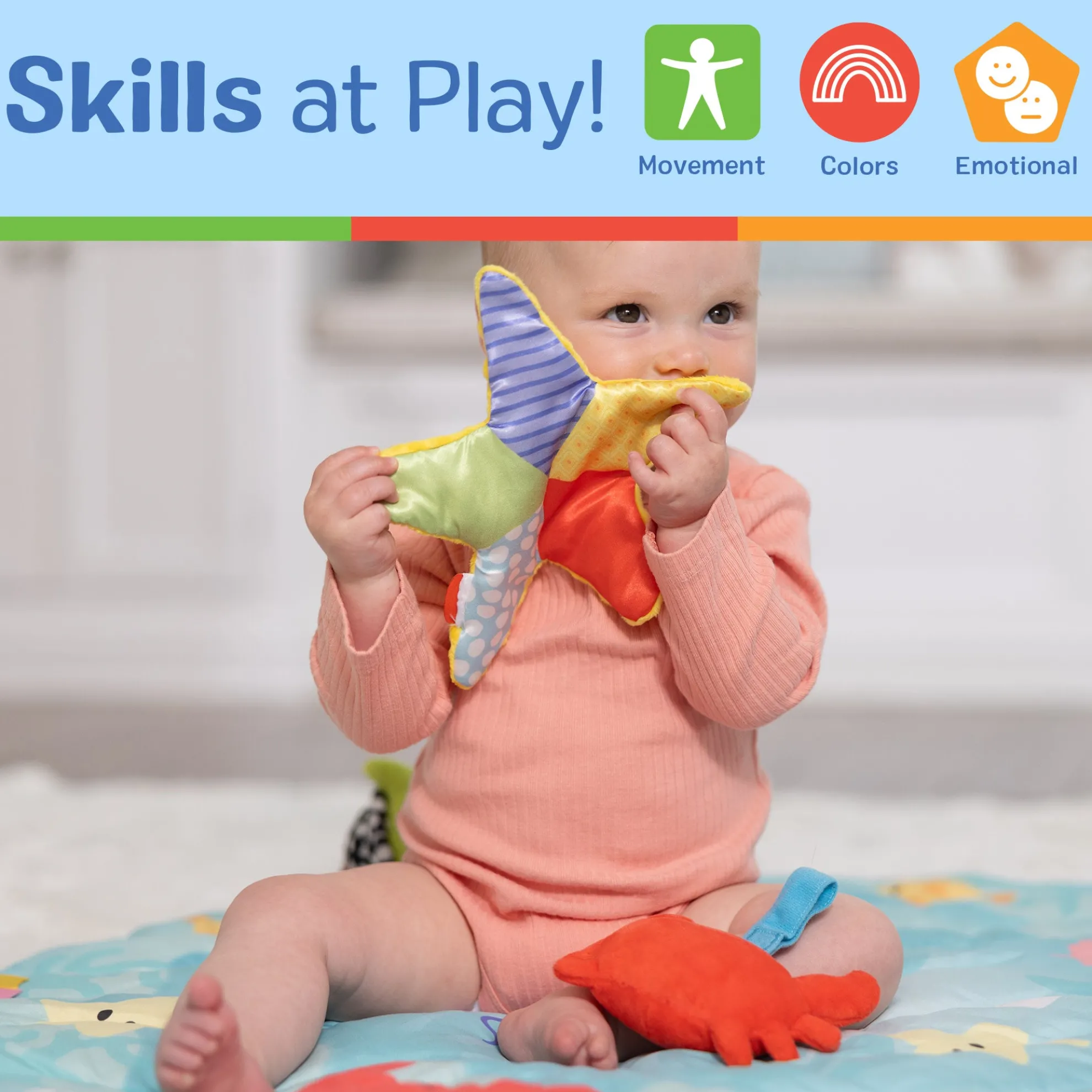 - Washable toys include a vibrating wiggly octopus, a chiming high-contrast turtle with built-in safety mirror, a double-sided, multi-textured crinkling sea star, a bright squeaking crab, and a chiming and rattling manta ray kicker