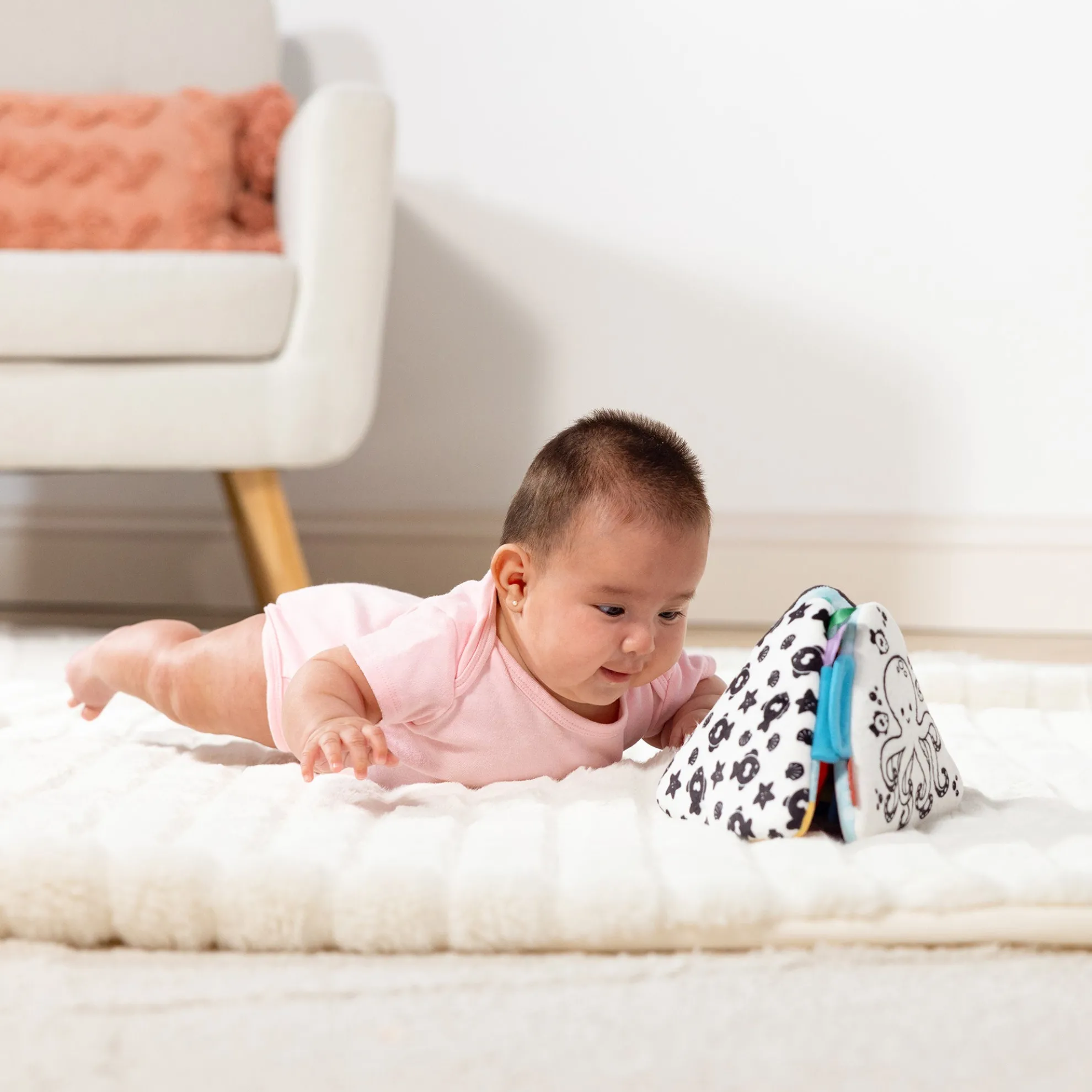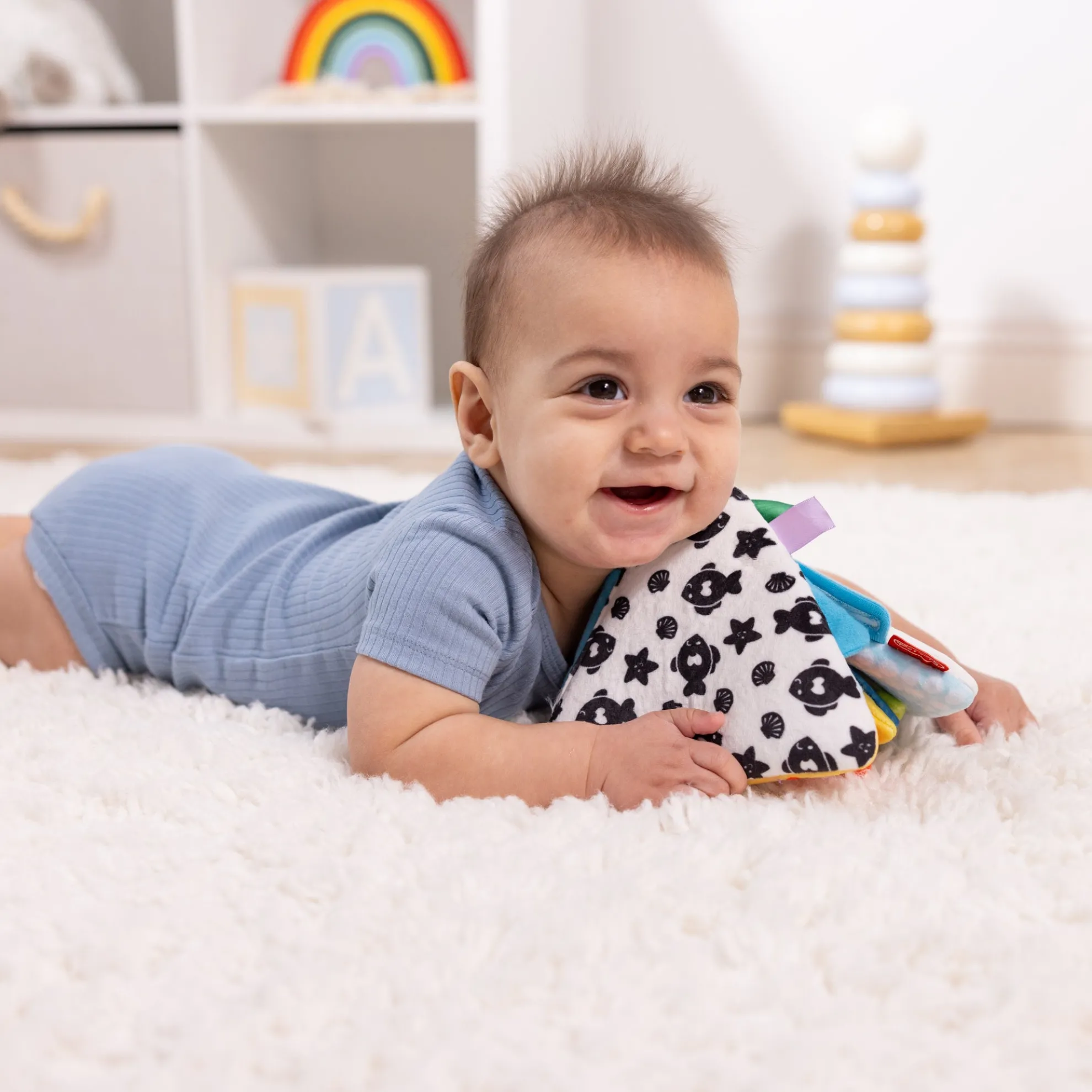 Make baby’s tummy time extra special with this engaging, double-sided folding cloth triangle toy! Three fold-out panels with adorable ocean-themed graphics and friendly characters lie flat or fold and connect into an upright pyramid. One side features high-contrast black and white graphics, great for important visual stimulation during baby’s first months. The other side includes colorful sea creatures with developmentally appropriate features, like a crab with a peek-a-boo mirror and squeaker, sensory tabs and ribbons on the jellyfish, and an attached tuck-away fish that stores in a pocket! The Tummy Time Triangle helps baby stay engaged and strengthen muscles during tummy play. It’s a great addition to registries and makes a great gift for newborns through six-month-olds for screen-free, hands-on interaction and skill-boosting play.