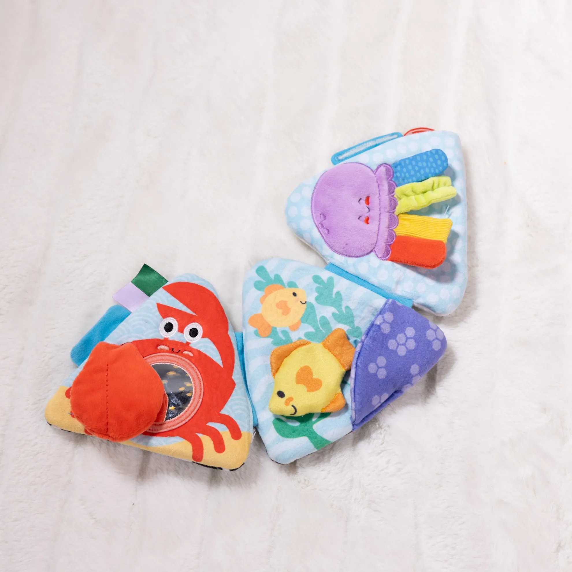 - A beautifully designed skill-booster — developmentally appropriate features include a crab with peek-a-boo mirror and squeaking claw, multi-textured tabs and ribbons on a jellyfish, and an attached tuck-away fish that stores in a pocket
