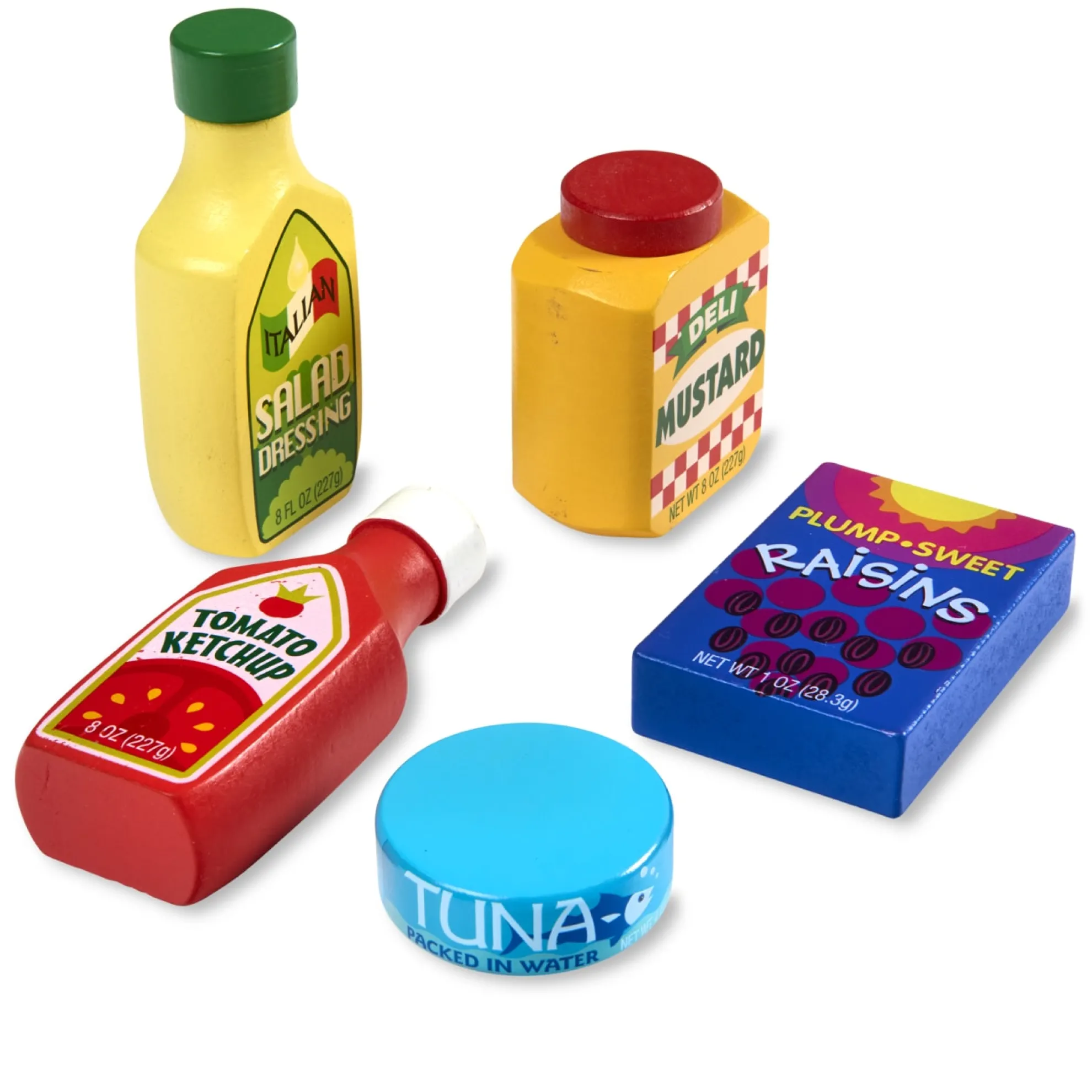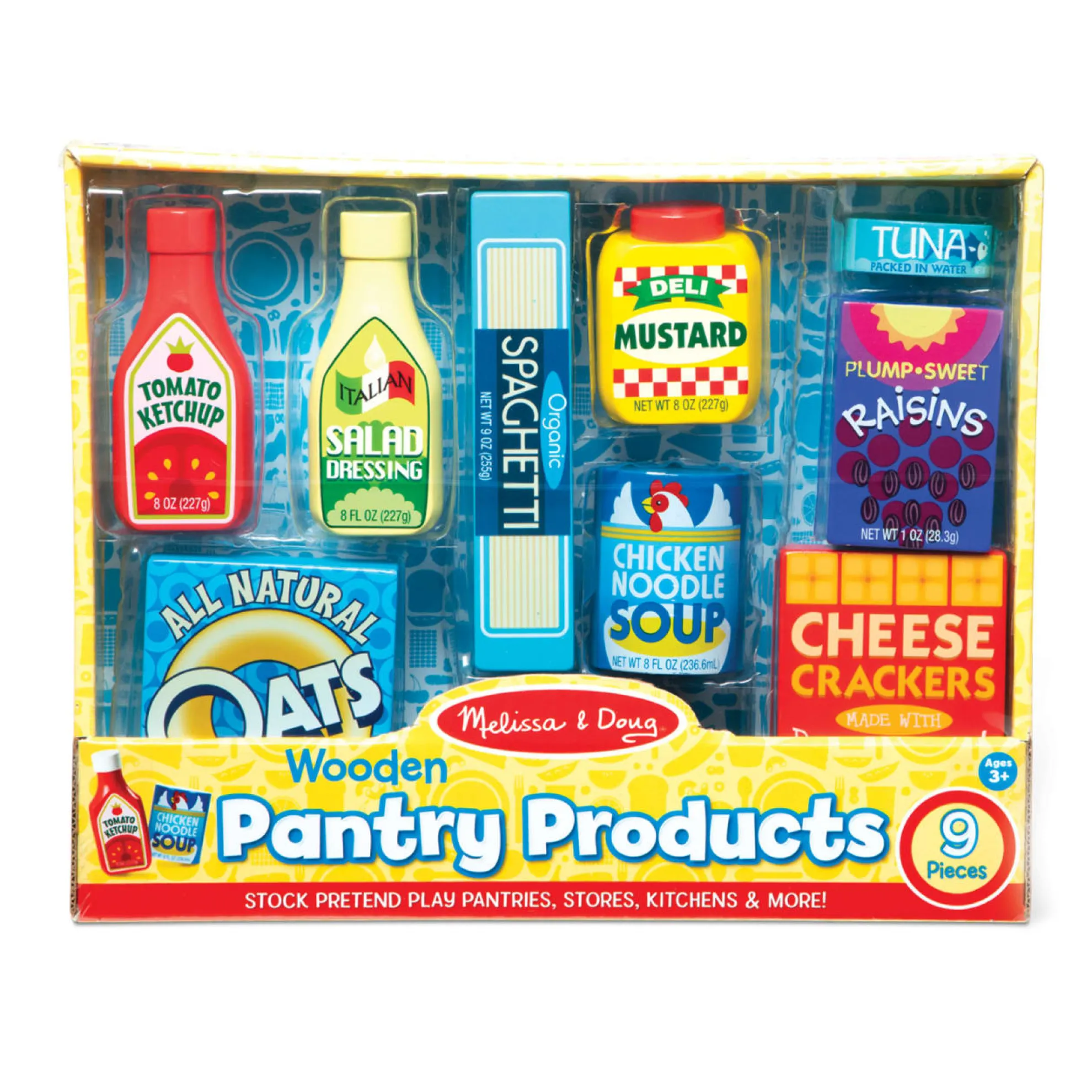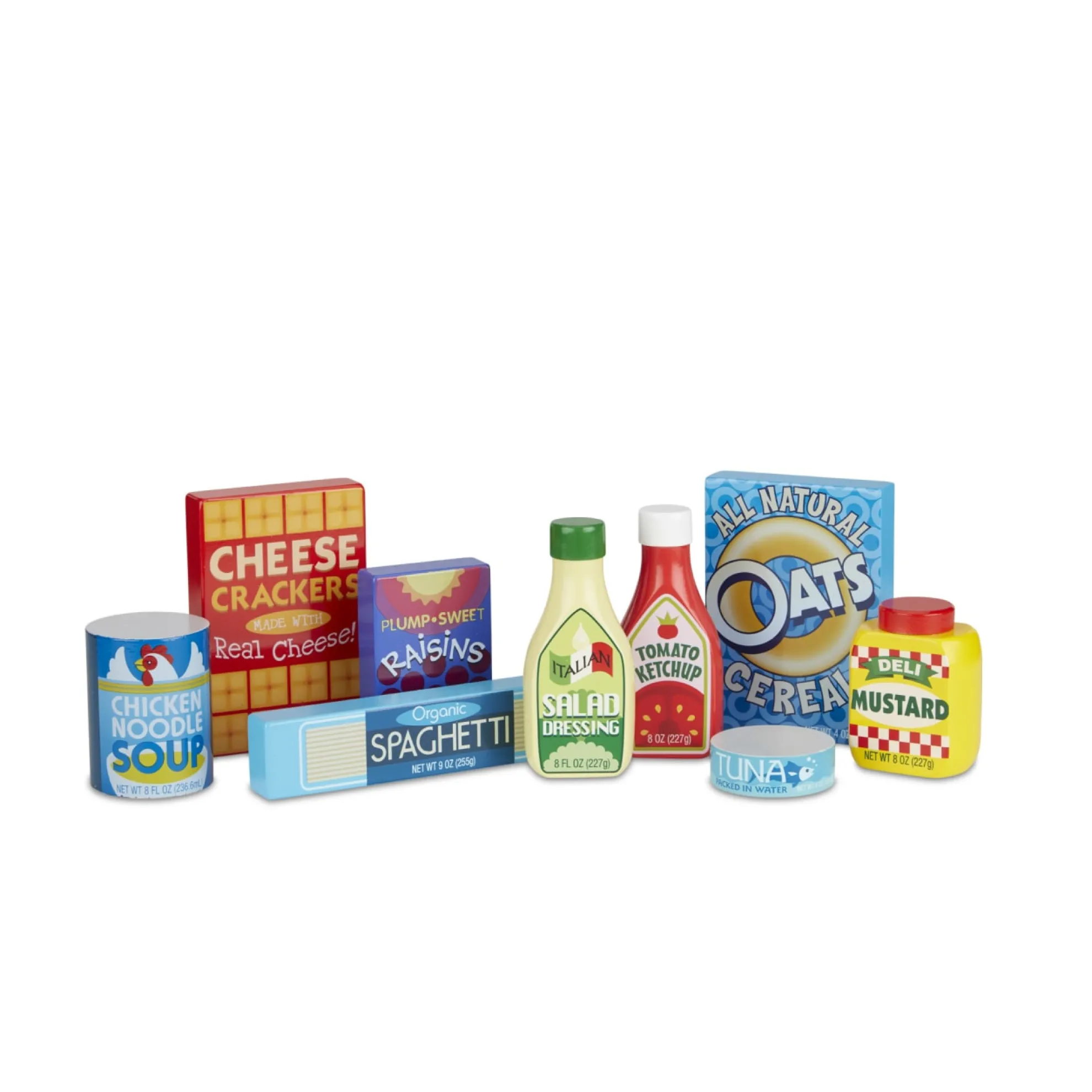 Here are some great staples every little chef needs to have in the pantry. This 9-piece wooden set of dry goods includes tuna, ketchup, spaghetti, soup, sugar, crackers, salad dressing, mustard and cereal.