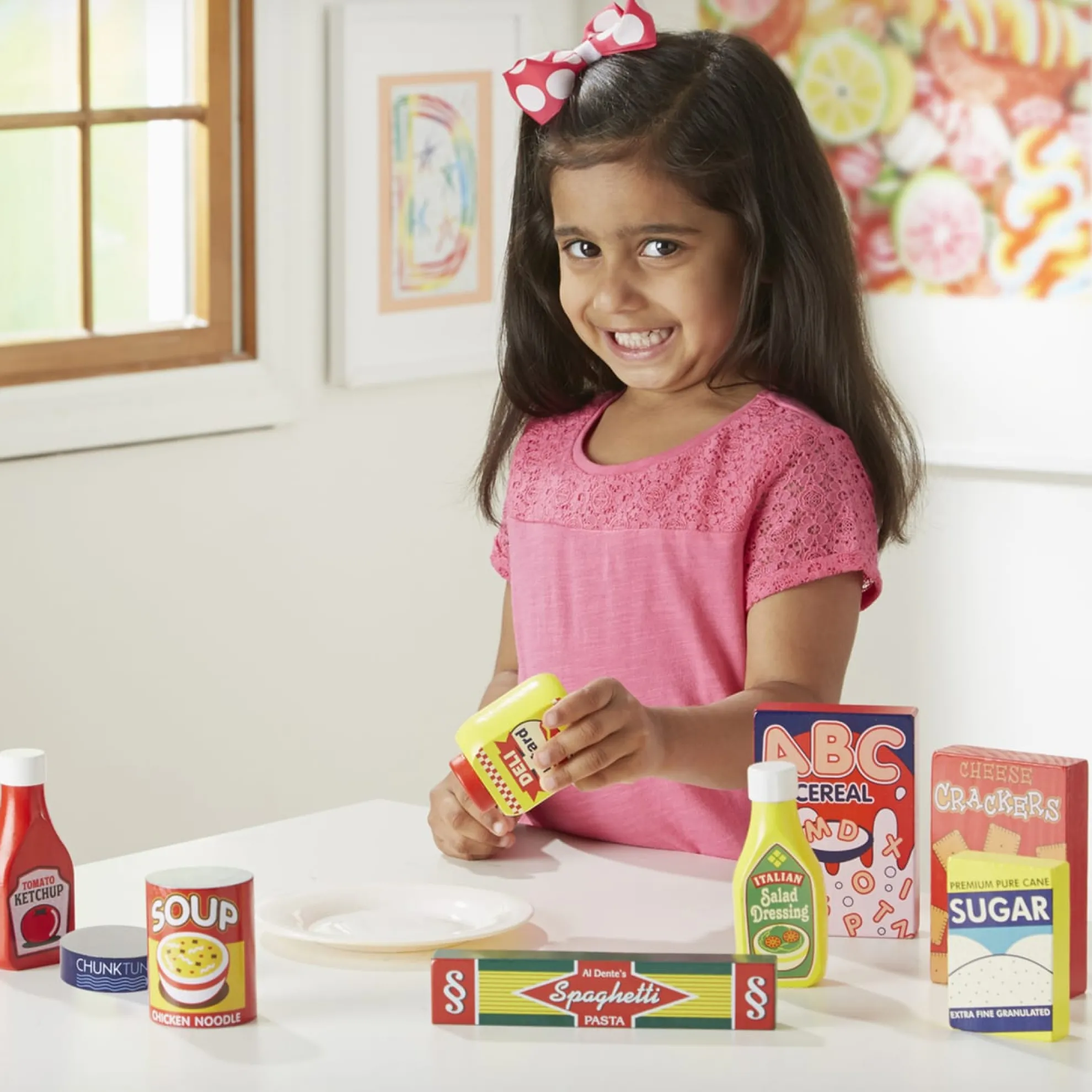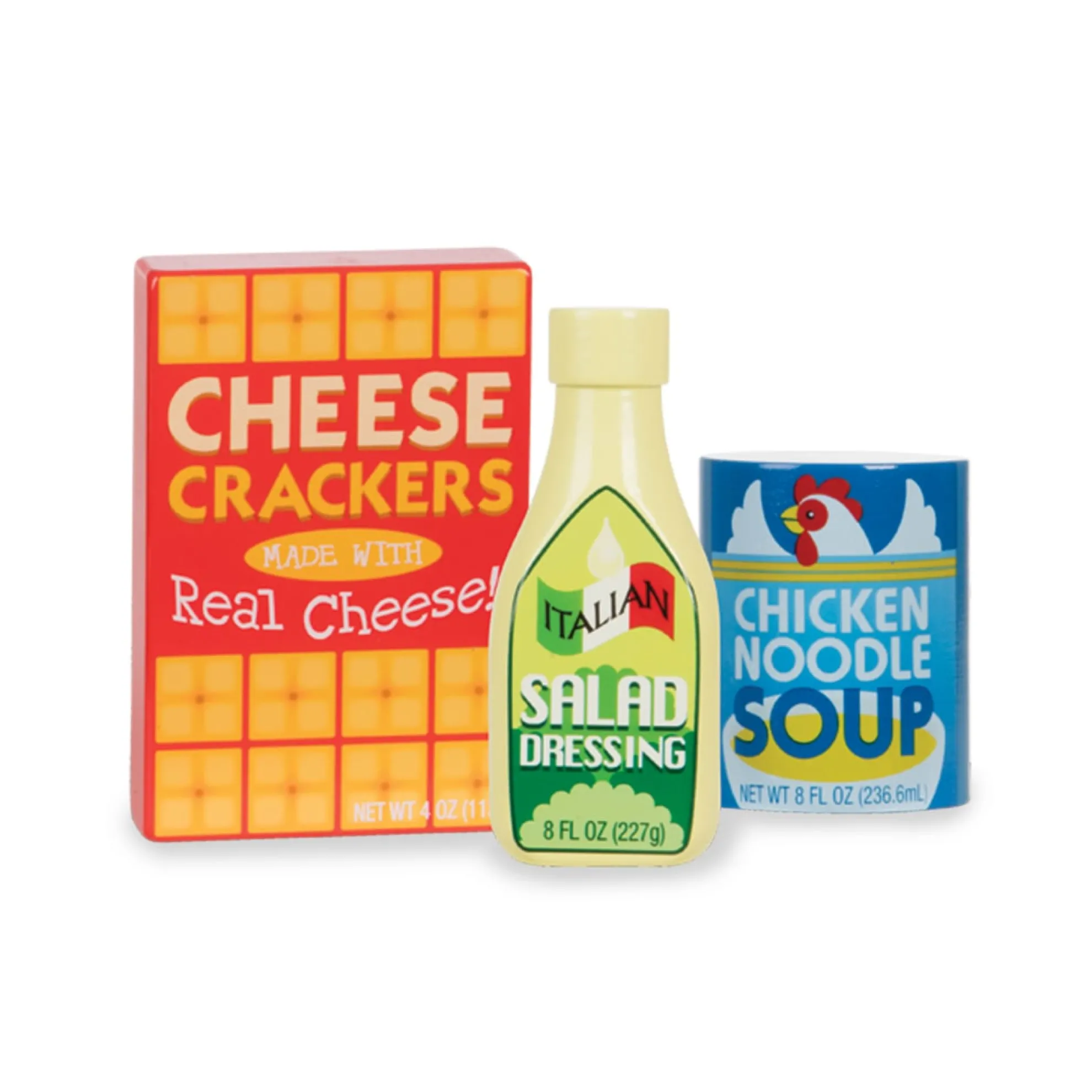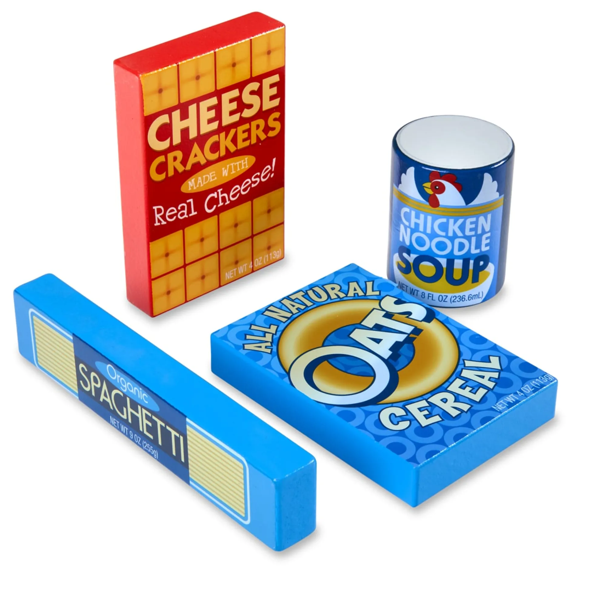 Here are some great staples every little chef needs to have in the pantry. This 9-piece wooden set of dry goods includes tuna, ketchup, spaghetti, soup, sugar, crackers, salad dressing, mustard and cereal.