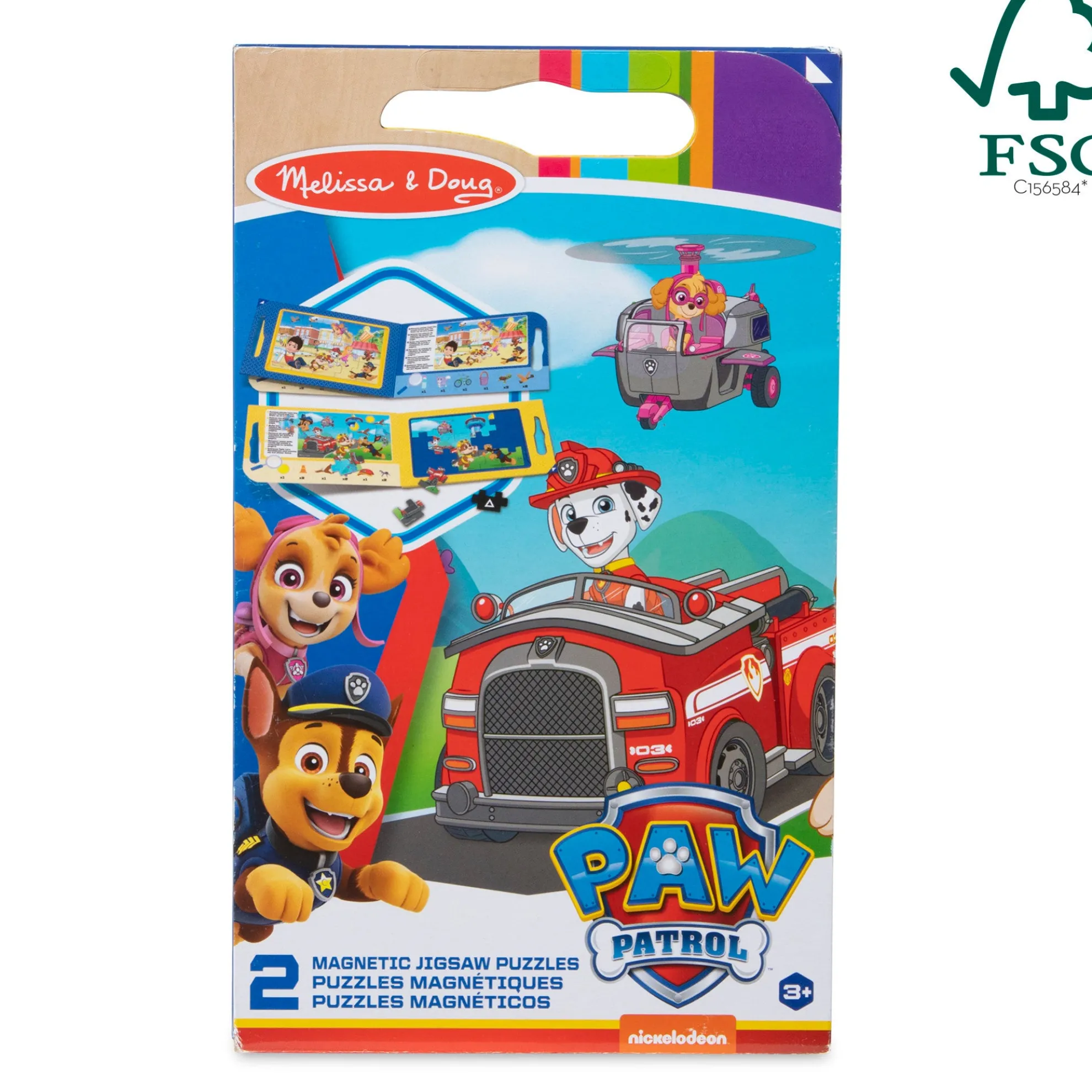 Now kids can put together puzzles anywhere, anytime! This portable play set includes two 15-piece magnetic puzzles with heroic PAW Patrol™ scenes in a compact, fold-out format with a built-in carrying handle! Pieces are shape-coded on the back for easy sorting, and cling to the inside surfaces to minimize mess, making this a terrific travel activity for kids three and older. The set includes search-and-find activities as an extra challenge once the puzzles are completed! Puzzle play is a great way to encourage logical thinking, goal setting, and patience. PAW Patrol™ is always ready to help, inspiring preschoolers with a blend of teamwork, adventure, and humor as they develop social, emotional, and developmental skills through play. This product is certified by the Forest Stewardship Council. FSC certification ensures that products come from responsibly managed forests that provide environmental, social, and economic benefits, and that forests are protected for future generations. Please note that FSC certification applies to new inventory only (FSC C156584)