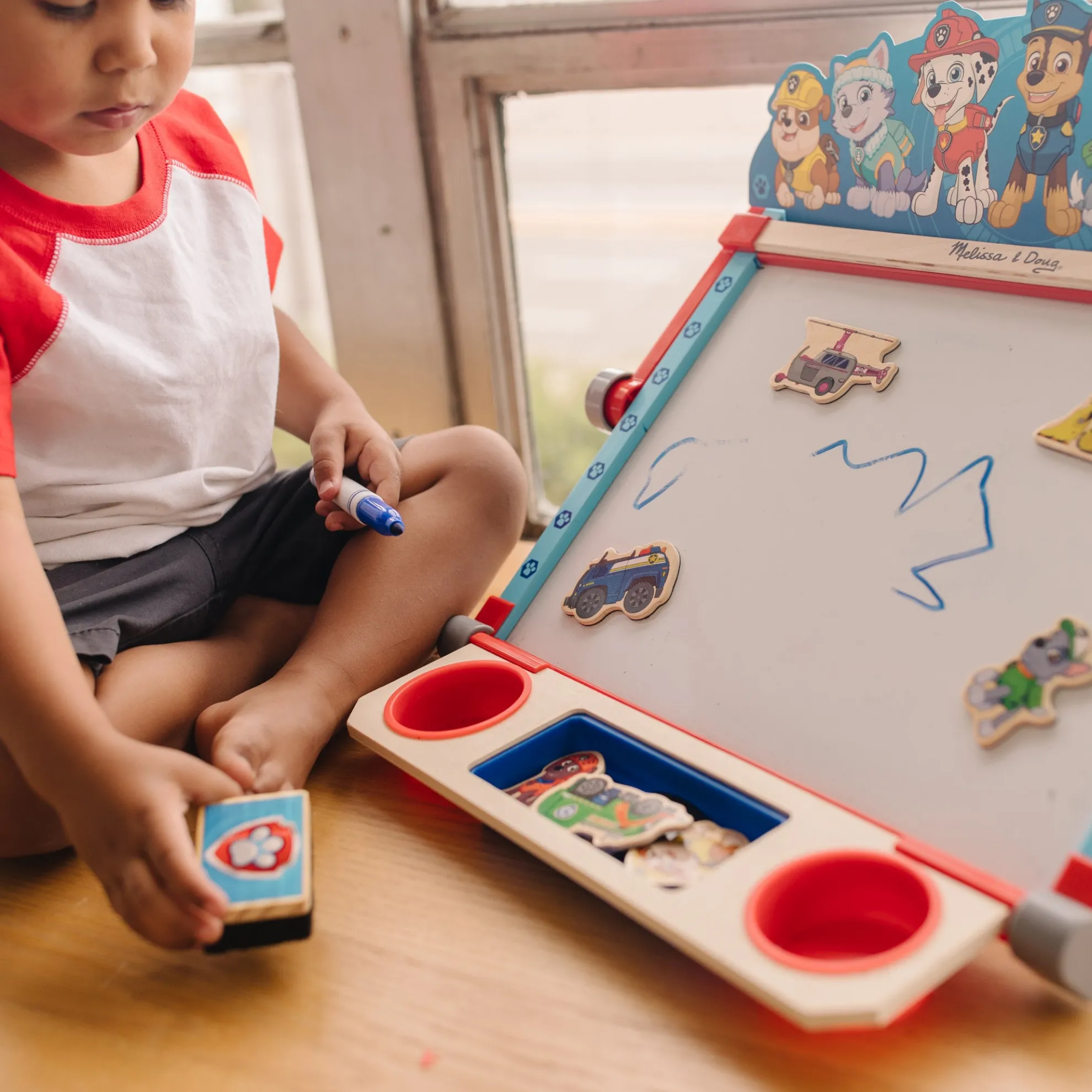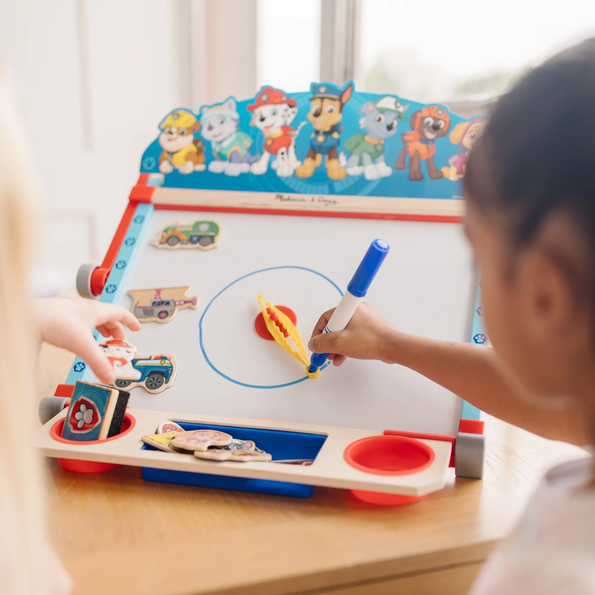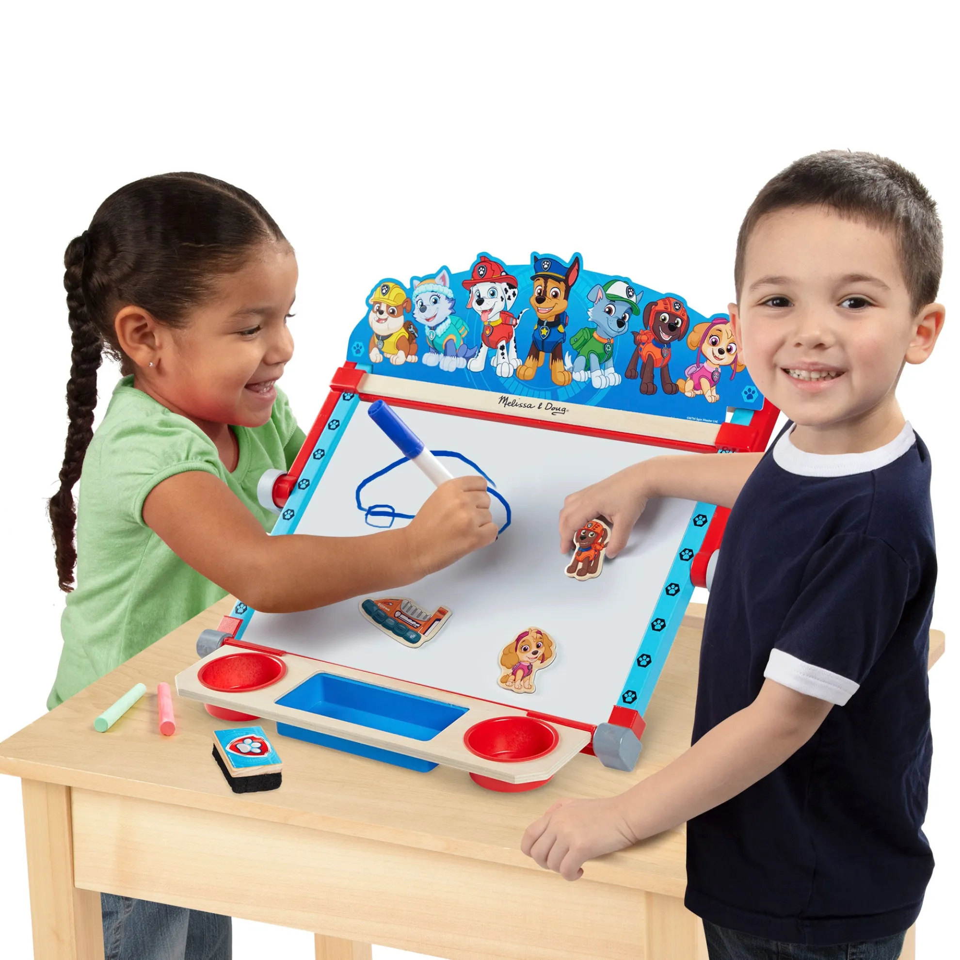 - Includes dry-erase marker, drawing compass, 5 colored chalk sticks, eraser, 50-foot-long paper roll (12 inches wide), 10 activity sheets, 12 wooden pup and vehicle magnets, pup header card