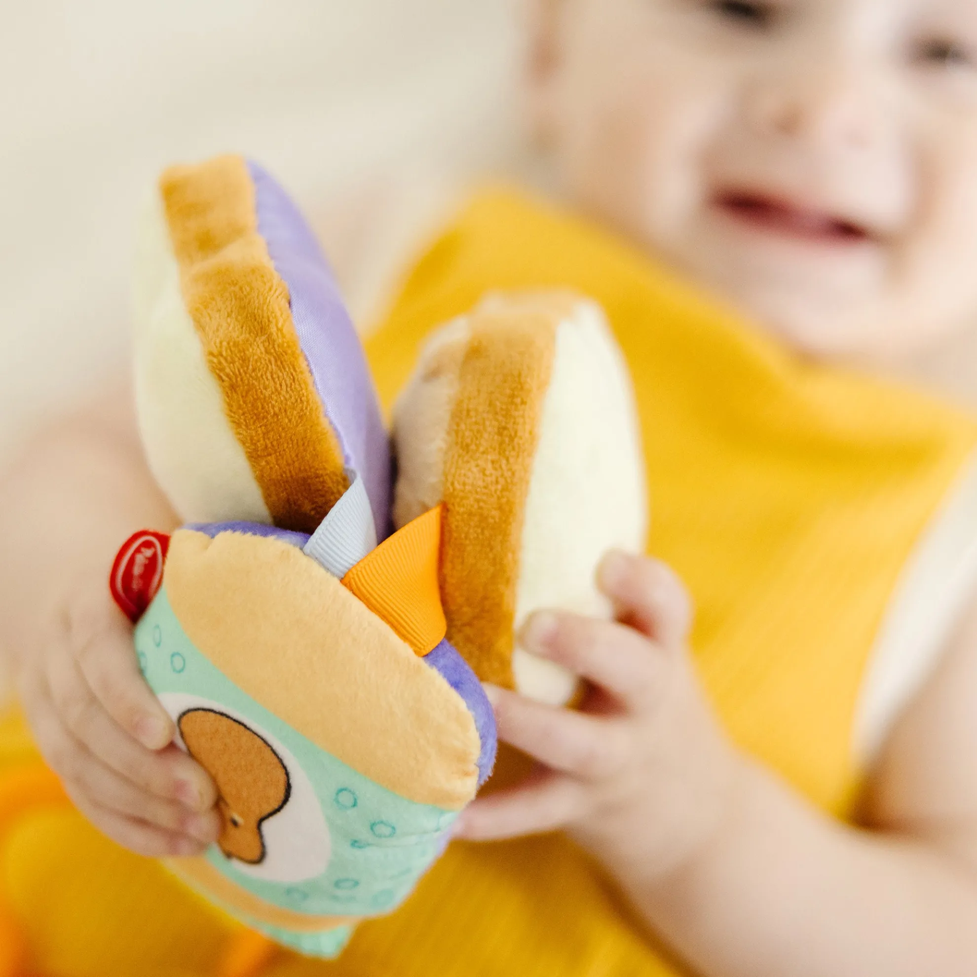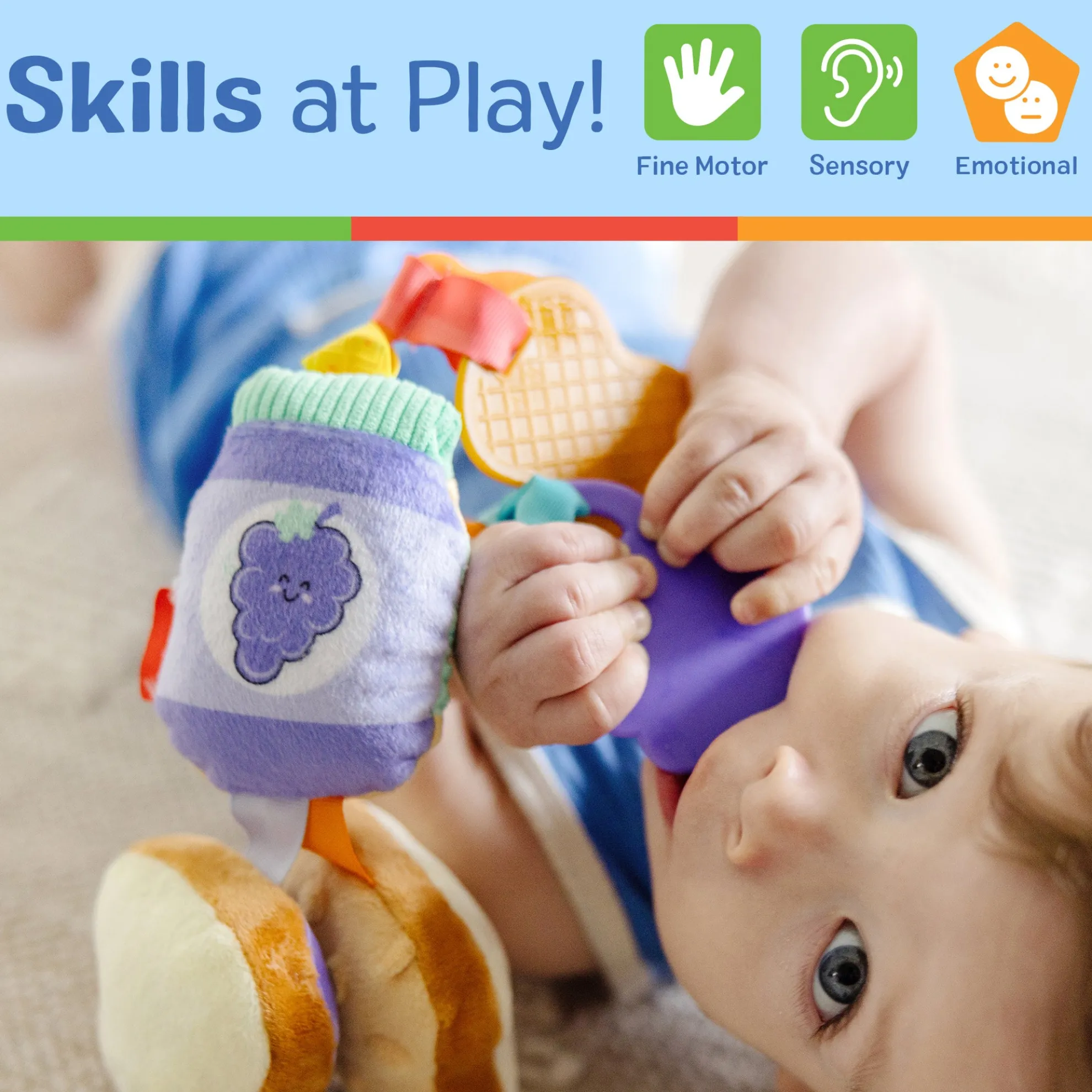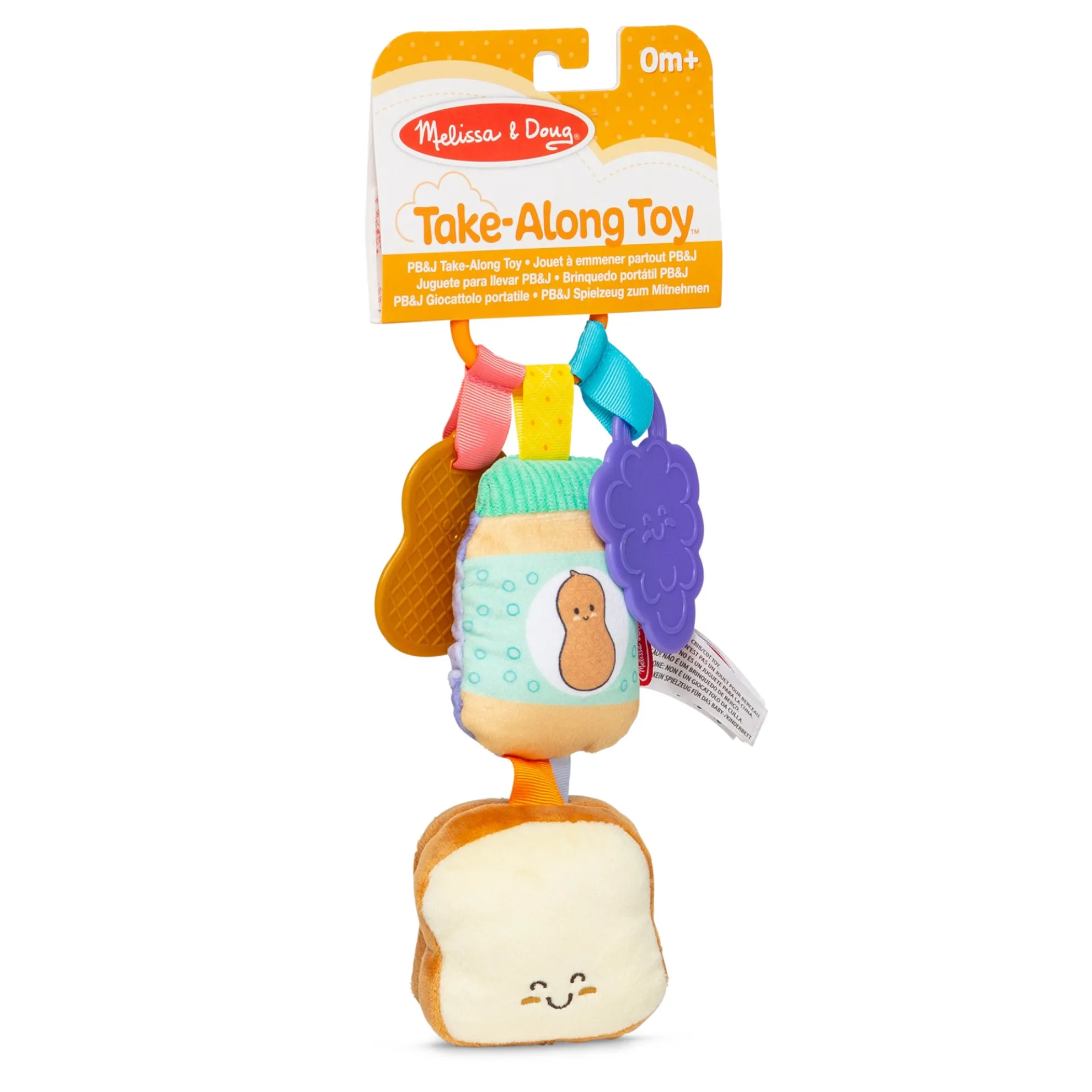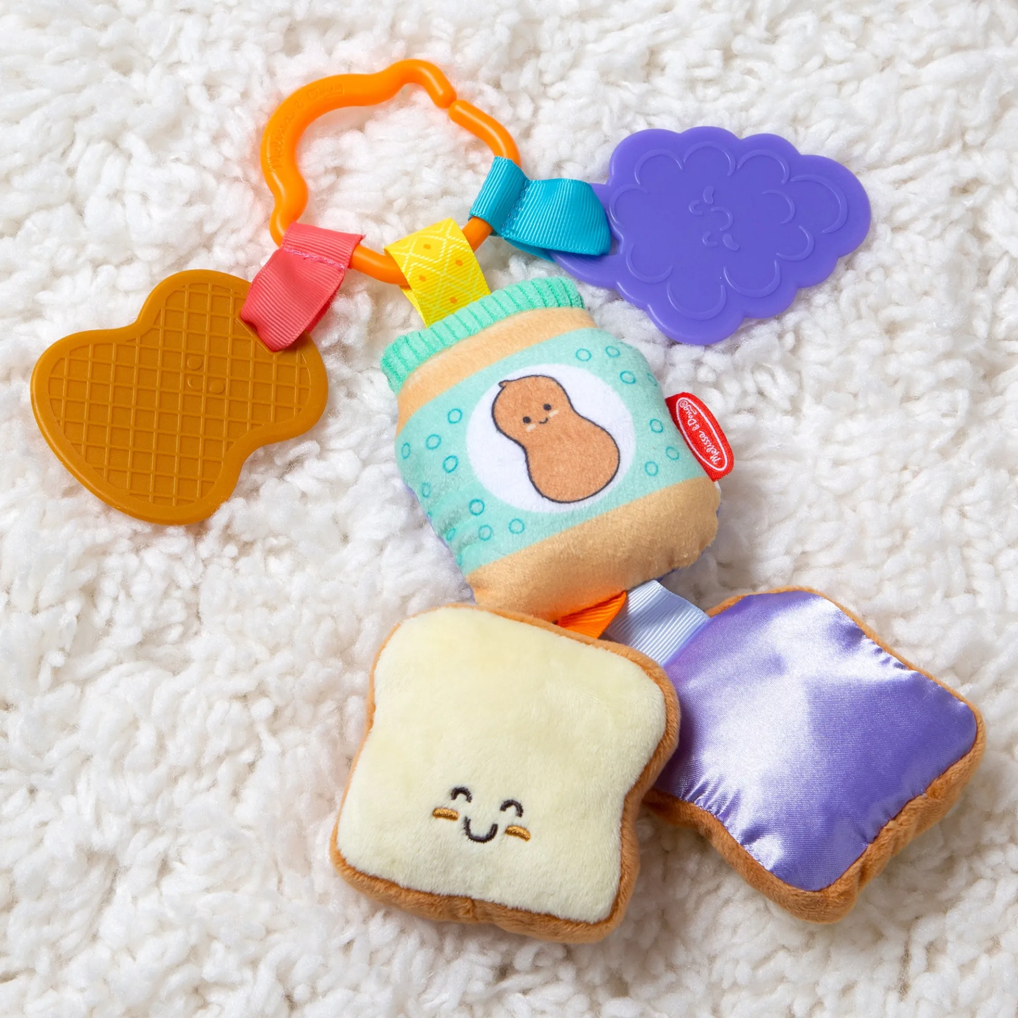 This adorable clip-on toy is a delicious way to entertain babies while stimulating their senses! Two plush bread slices feature corduroy peanut butter on one and satiny jelly on the other to delight baby’s sense of touch. The soft, rattling, double-sided jar is easy to grasp, and firm plastic peanut and grape pieces are textured to temp tiny fingers to touch! Bring the fun wherever baby goes—easily clip the six-piece, multi-textured toy onto a stroller, car seat, diaper bag, or high chair to keep it close at hand. Melissa & Doug infant and toddler toys inspire “a-ha!” moments of discovery. Adorable, diverse characters and a variety of fun shapes and textures encourage exploratory, skill-building play.