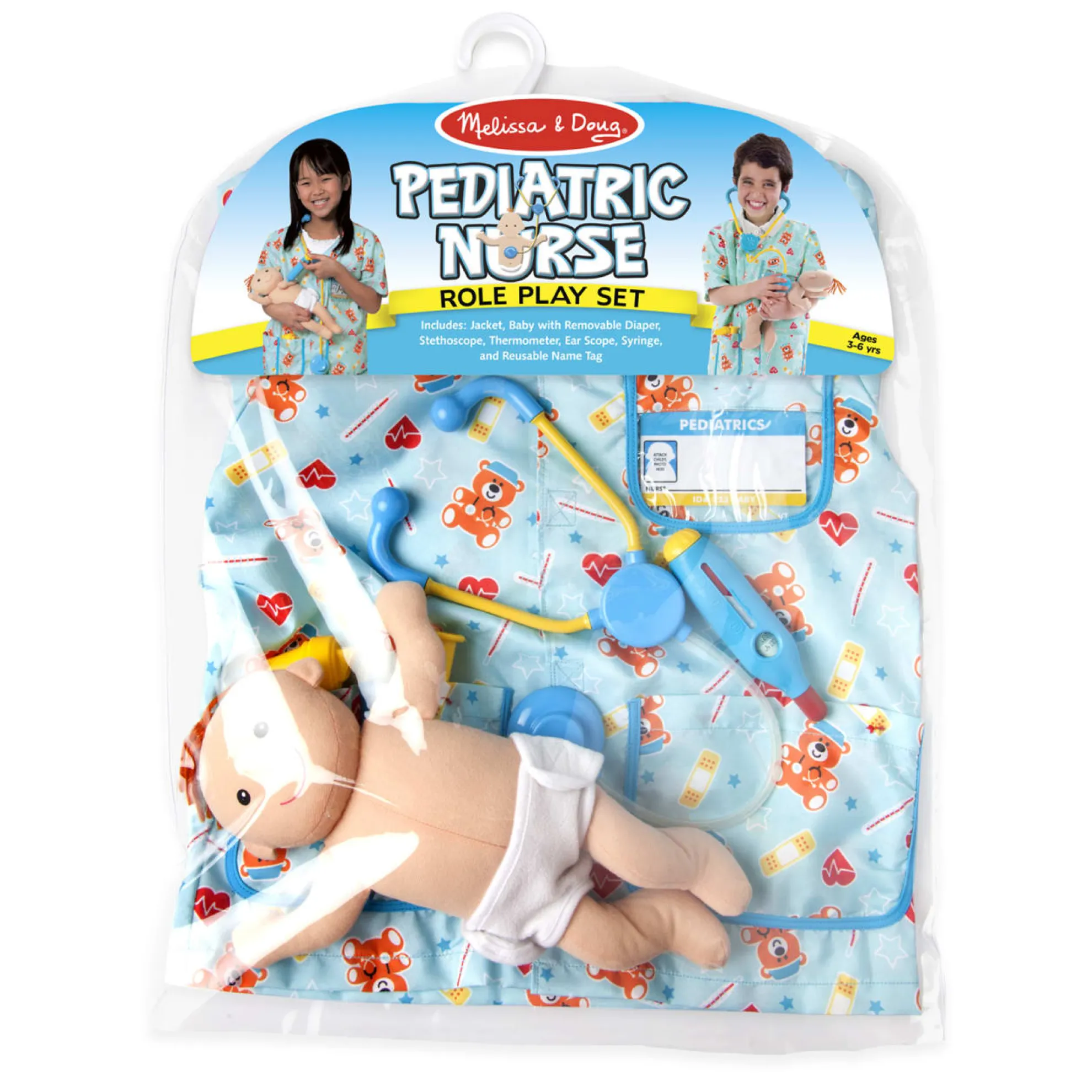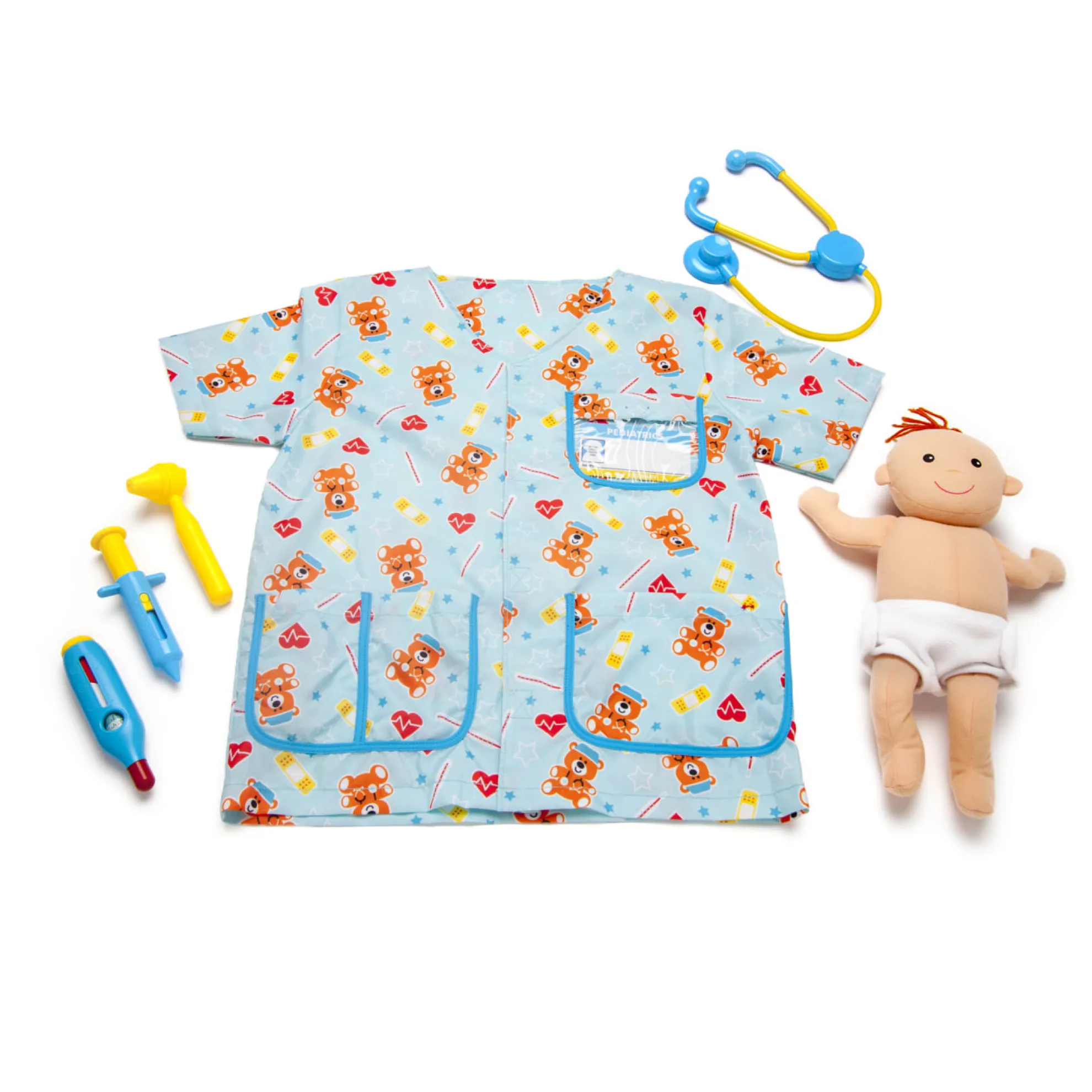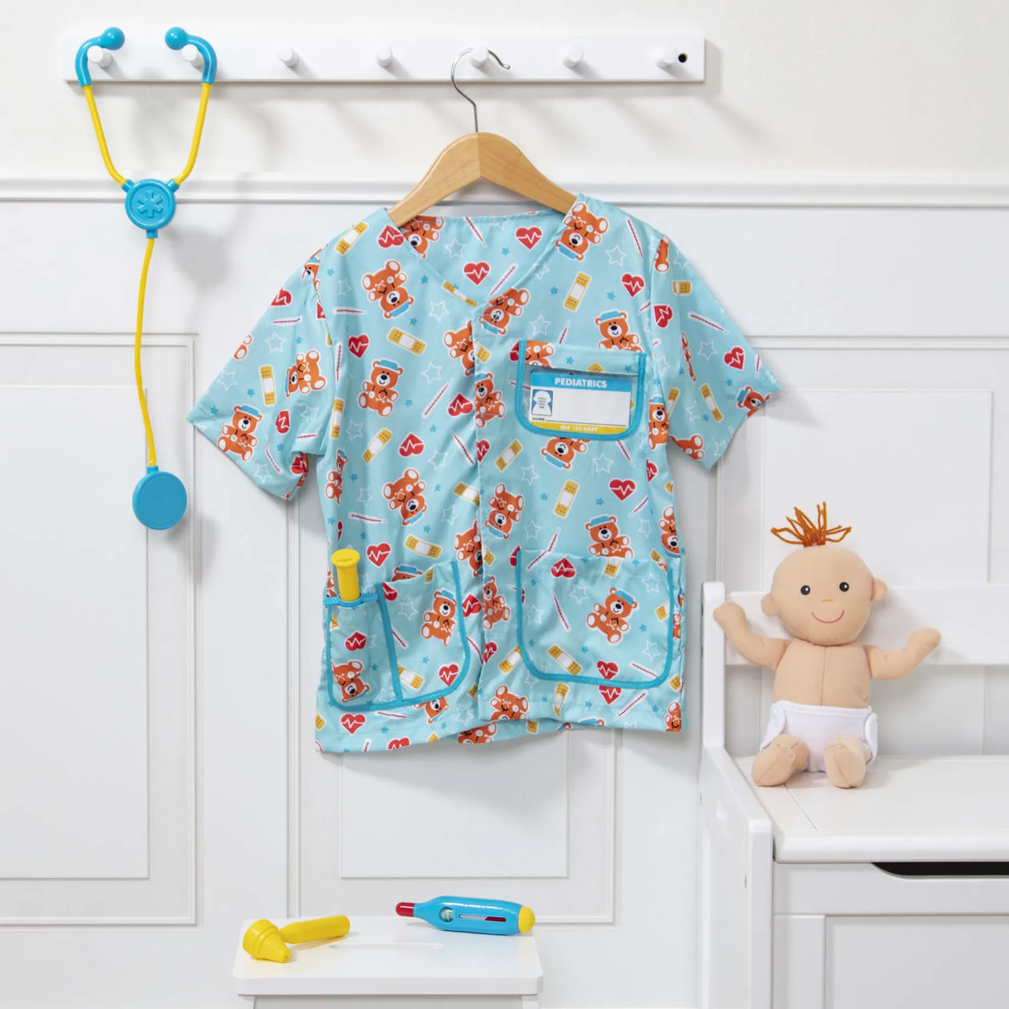 - This pediatric nurse costume and play set has everything little nurses need to take care of a newborn baby–including the baby! Nurses-in-training can slip on the cheerful, gender-neutral uniform (complete with customizable hospital ID tag), then fill the pockets with tools for a pretend-play checkup. The included stethoscope, ear scope, thermometer, and syringe help make sure all is well with the cuddly newborn–or help patch up any imaginary booboos and sniffles. The plush baby doll has a removable cloth diaper with self-stick closures for easy changes before or after the checkup, and a sweet smiling face to encourage emotional connection and communication.