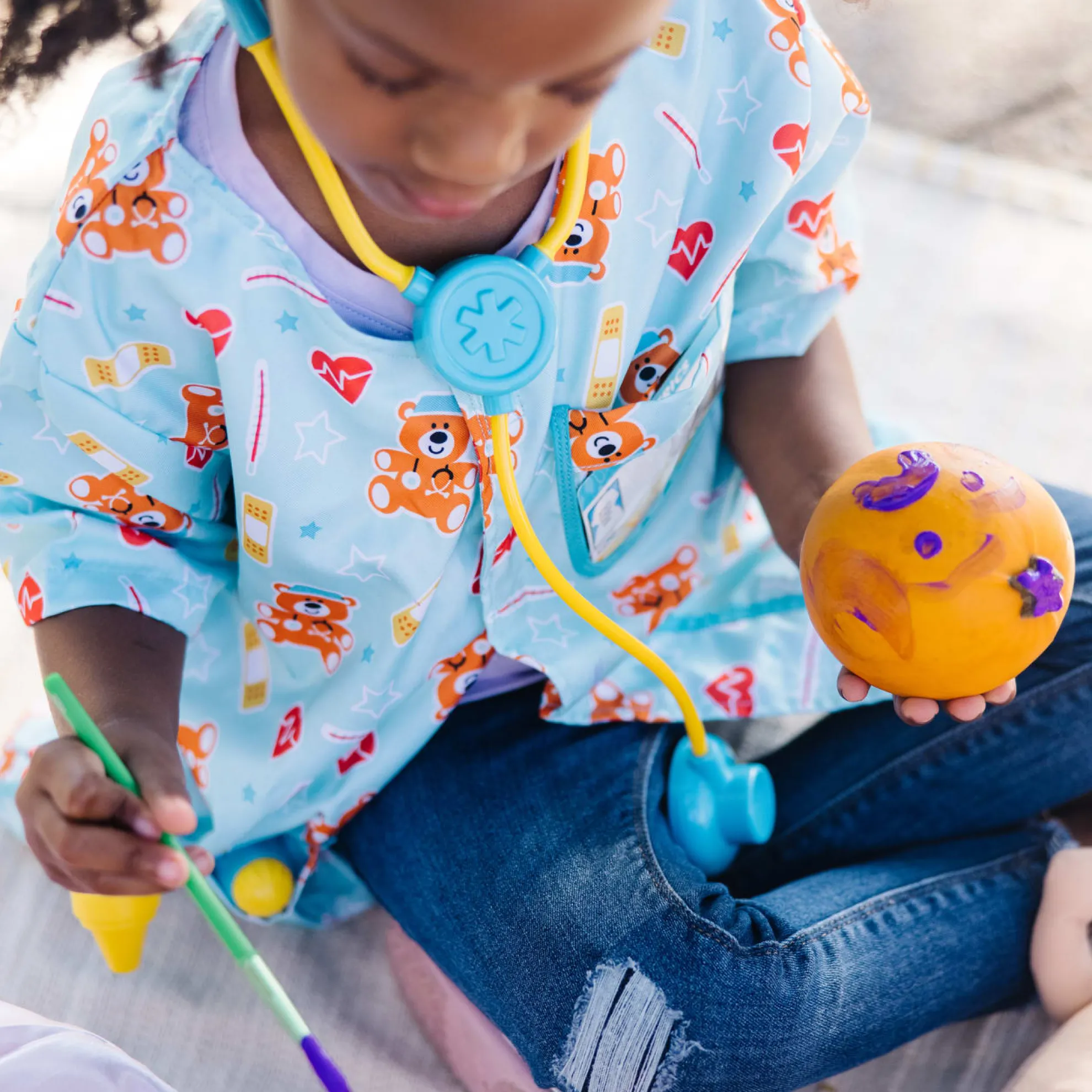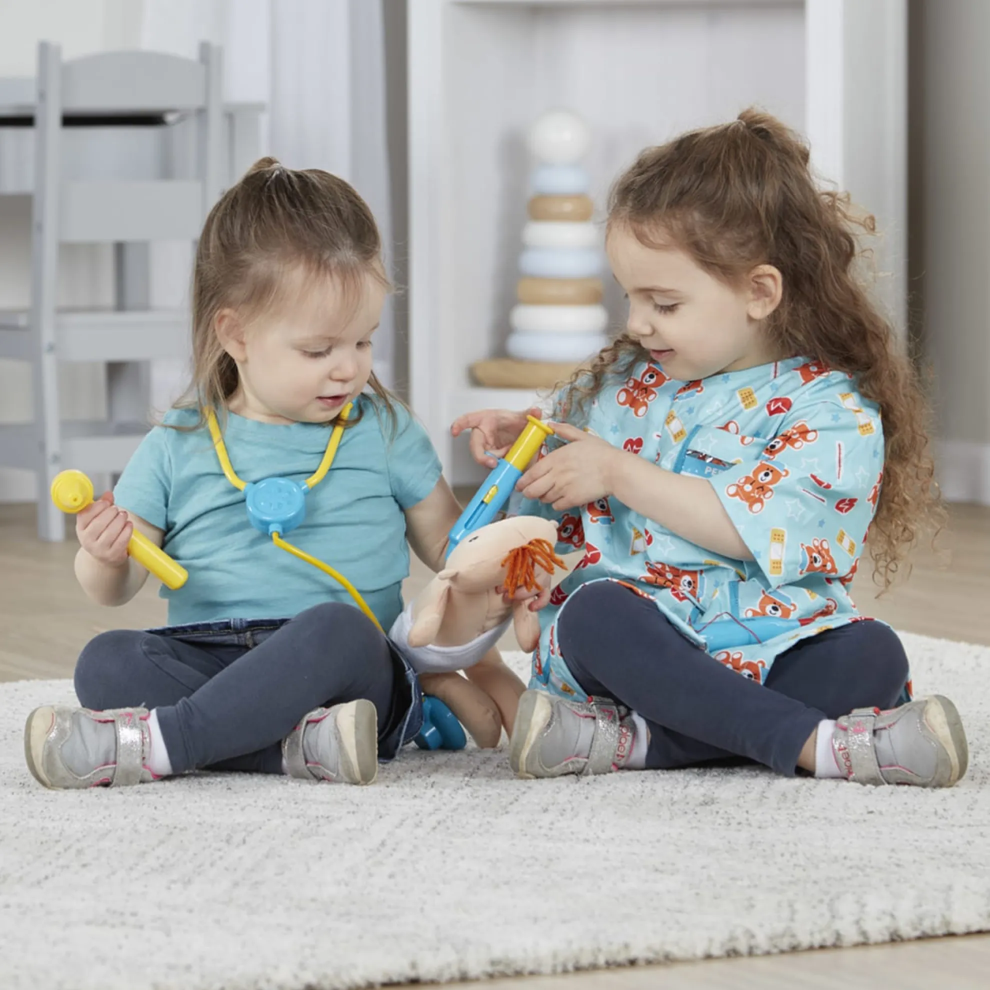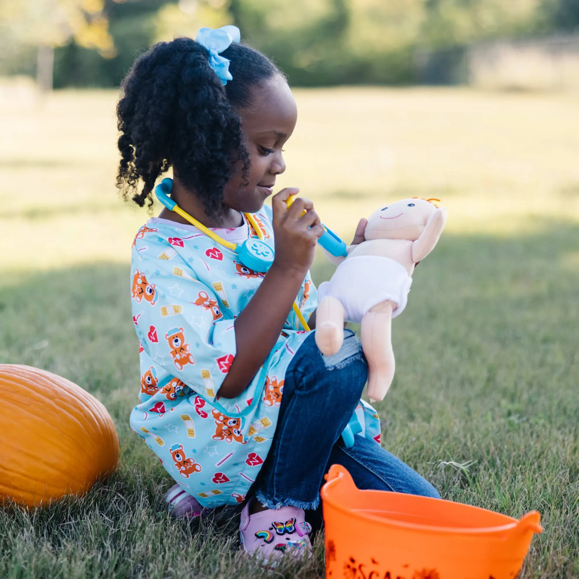 - This pediatric nurse costume and play set has everything little nurses need to take care of a newborn baby–including the baby! Nurses-in-training can slip on the cheerful, gender-neutral uniform (complete with customizable hospital ID tag), then fill the pockets with tools for a pretend-play checkup. The included stethoscope, ear scope, thermometer, and syringe help make sure all is well with the cuddly newborn–or help patch up any imaginary booboos and sniffles. The plush baby doll has a removable cloth diaper with self-stick closures for easy changes before or after the checkup, and a sweet smiling face to encourage emotional connection and communication.