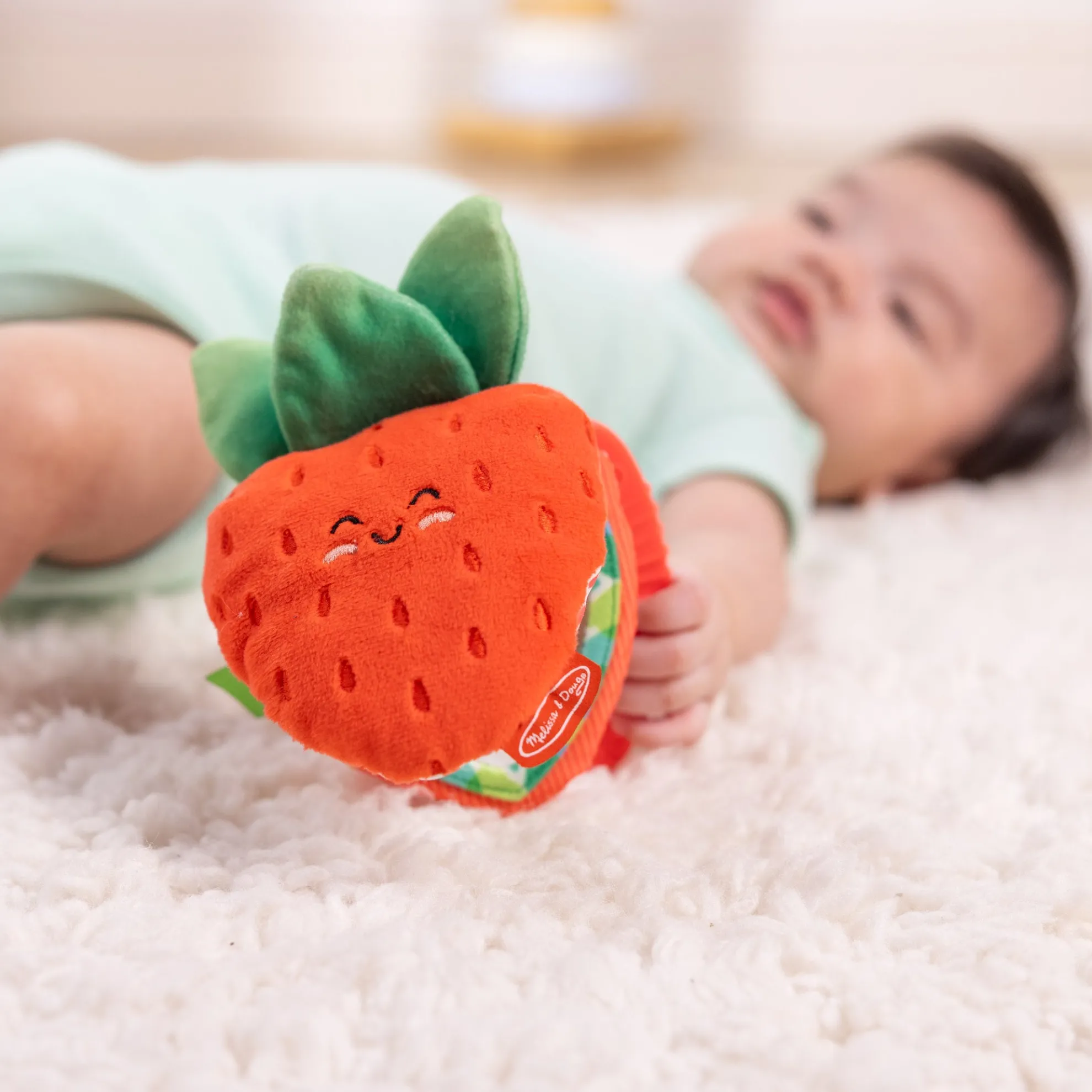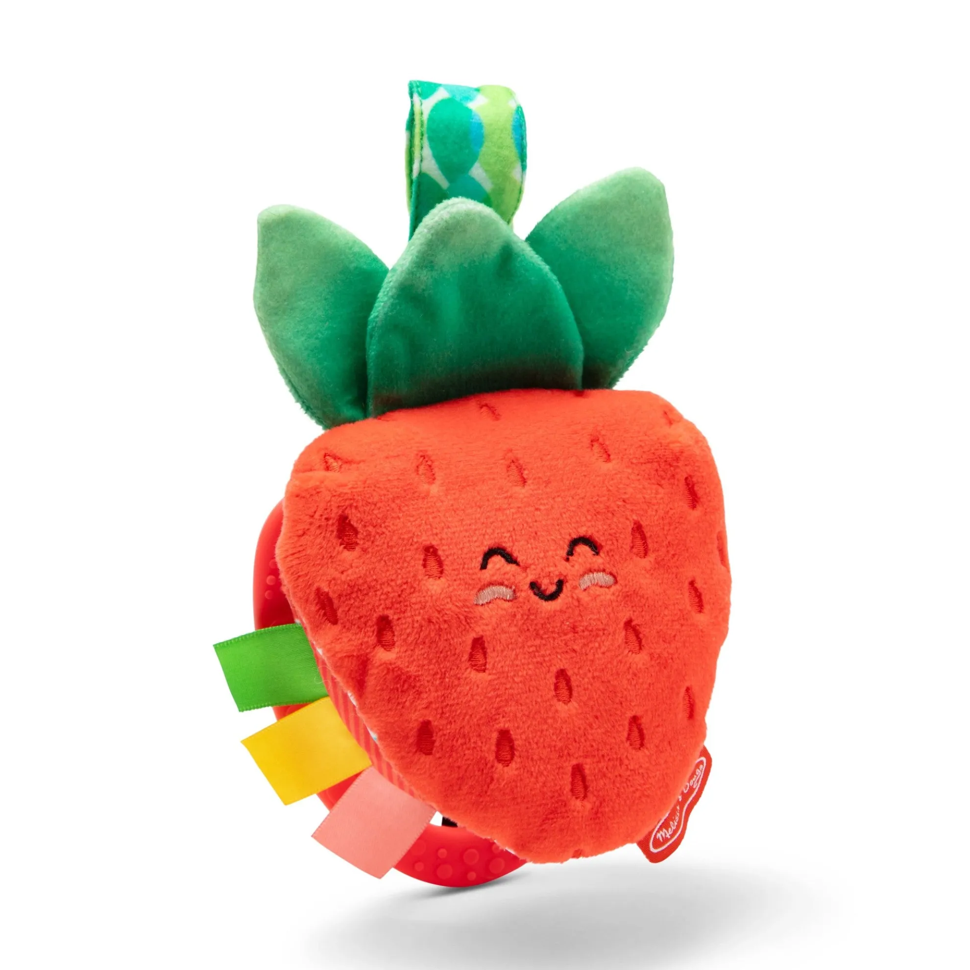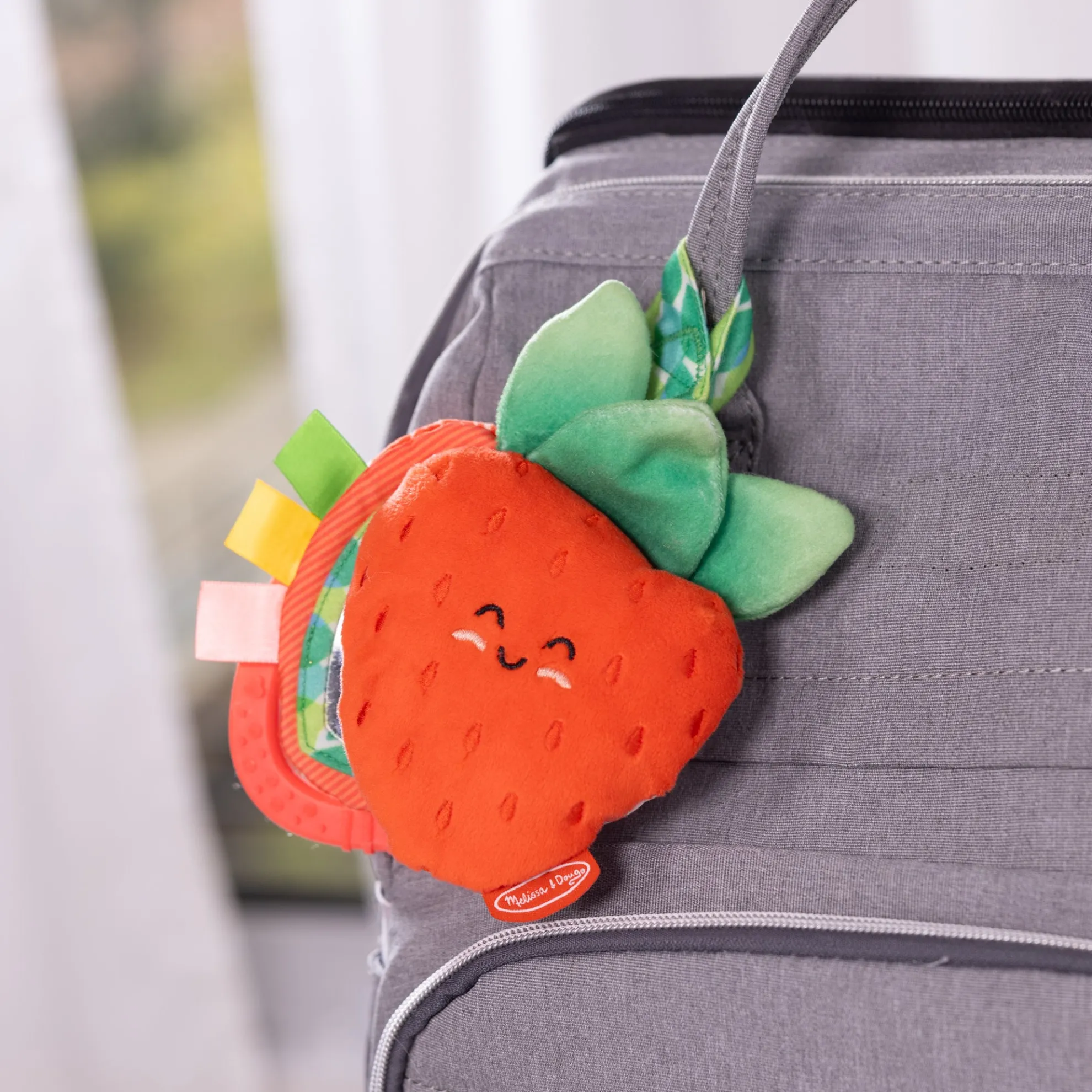 - Attach the 3-piece Melissa & Doug strawberry infant toy with peek-a-boo mirror and silicone teething ring to strollers, diaper bags, high chairs, car seats, and more to keep the fun close at hand