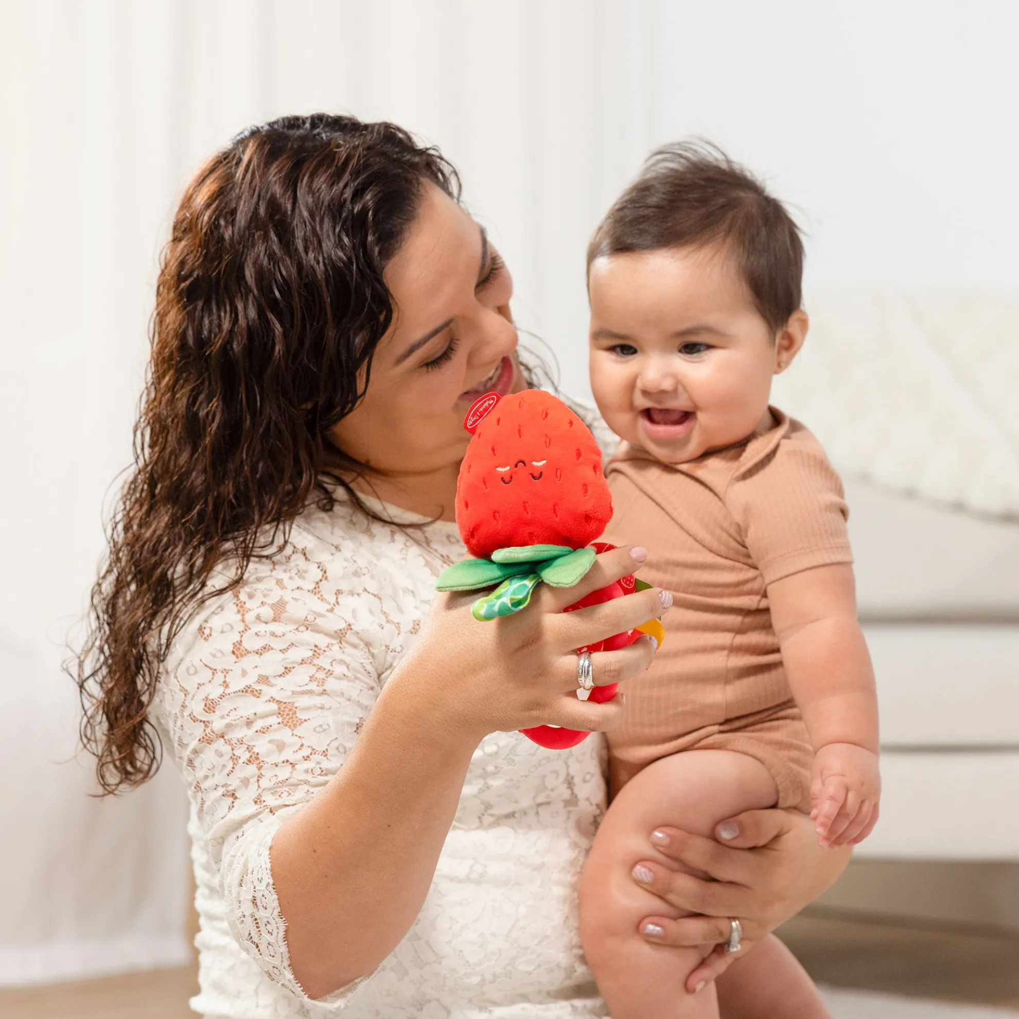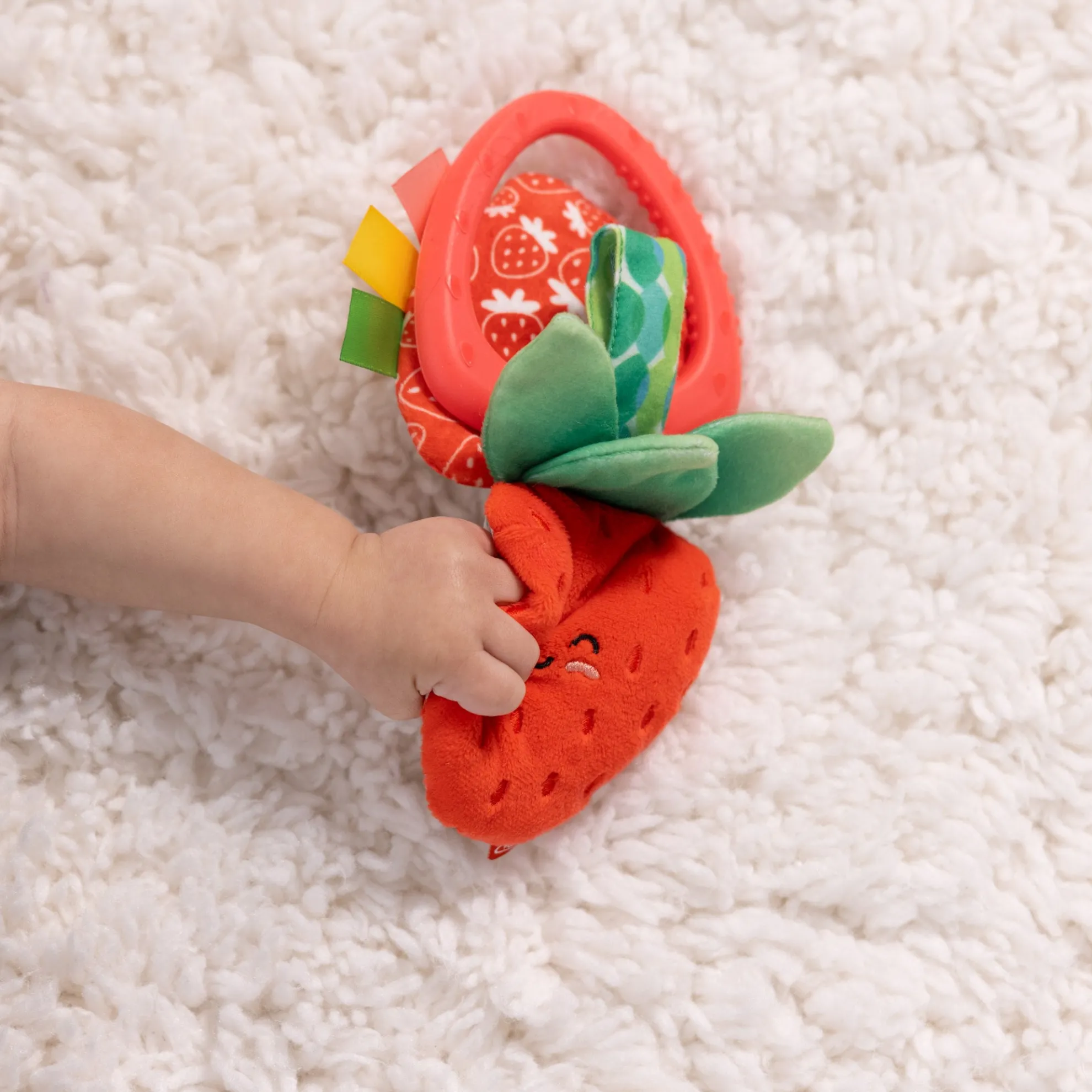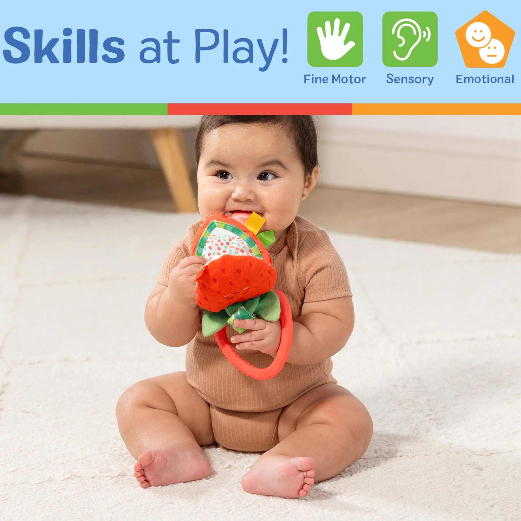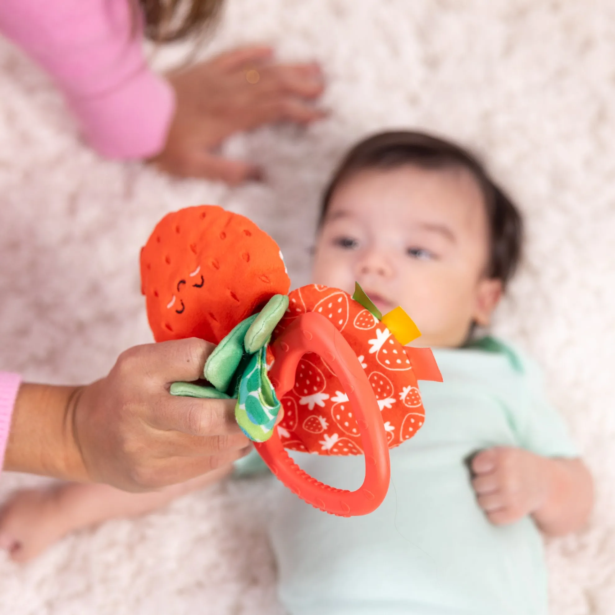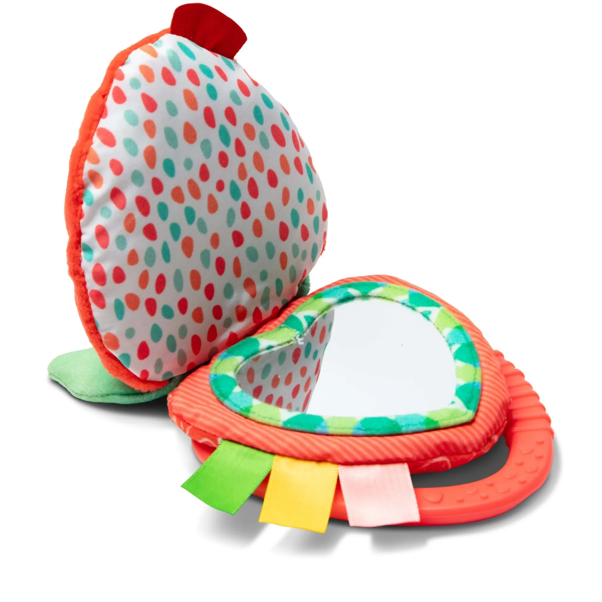 - Includes 3 strawberry multi-textured slices with crinkling leaves, a peek-a-boo mirror, satiny ribbons, and silicone teething ring<