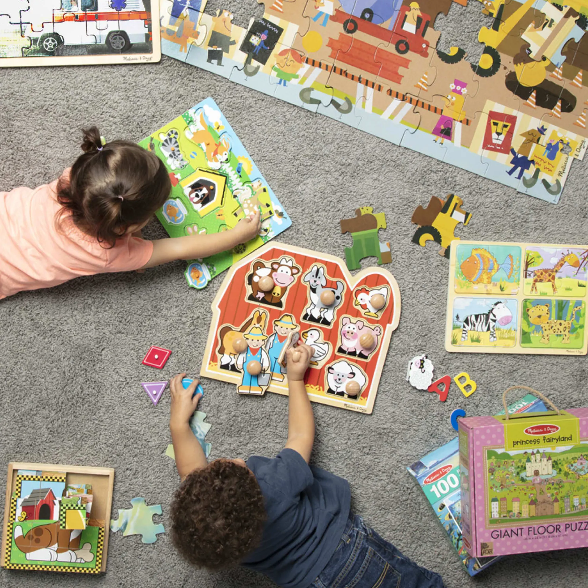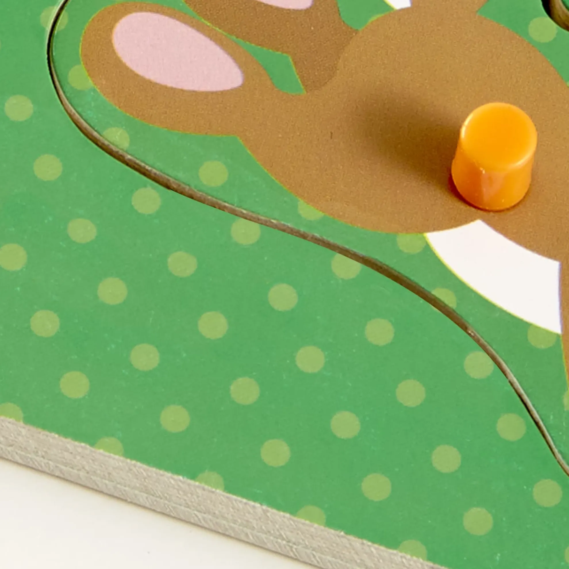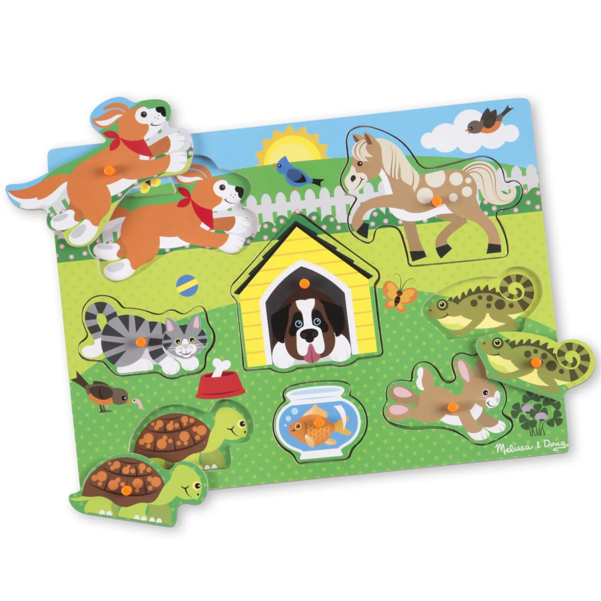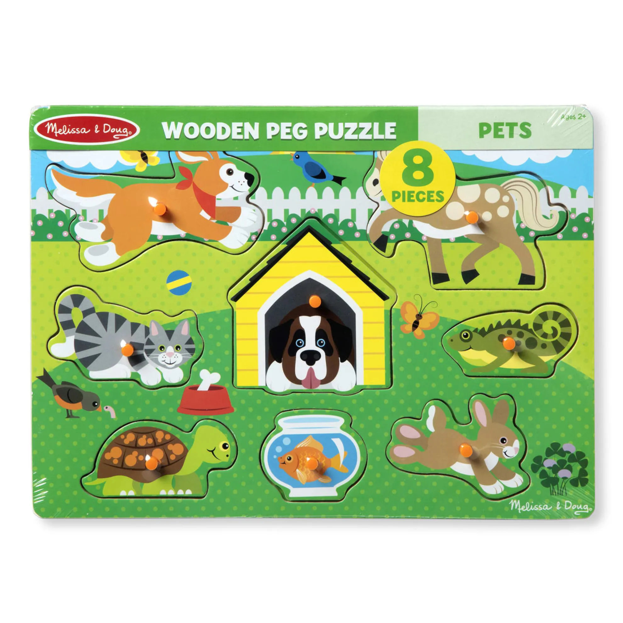 - Easy-grasp 8-piece peg puzzle with a pets theme