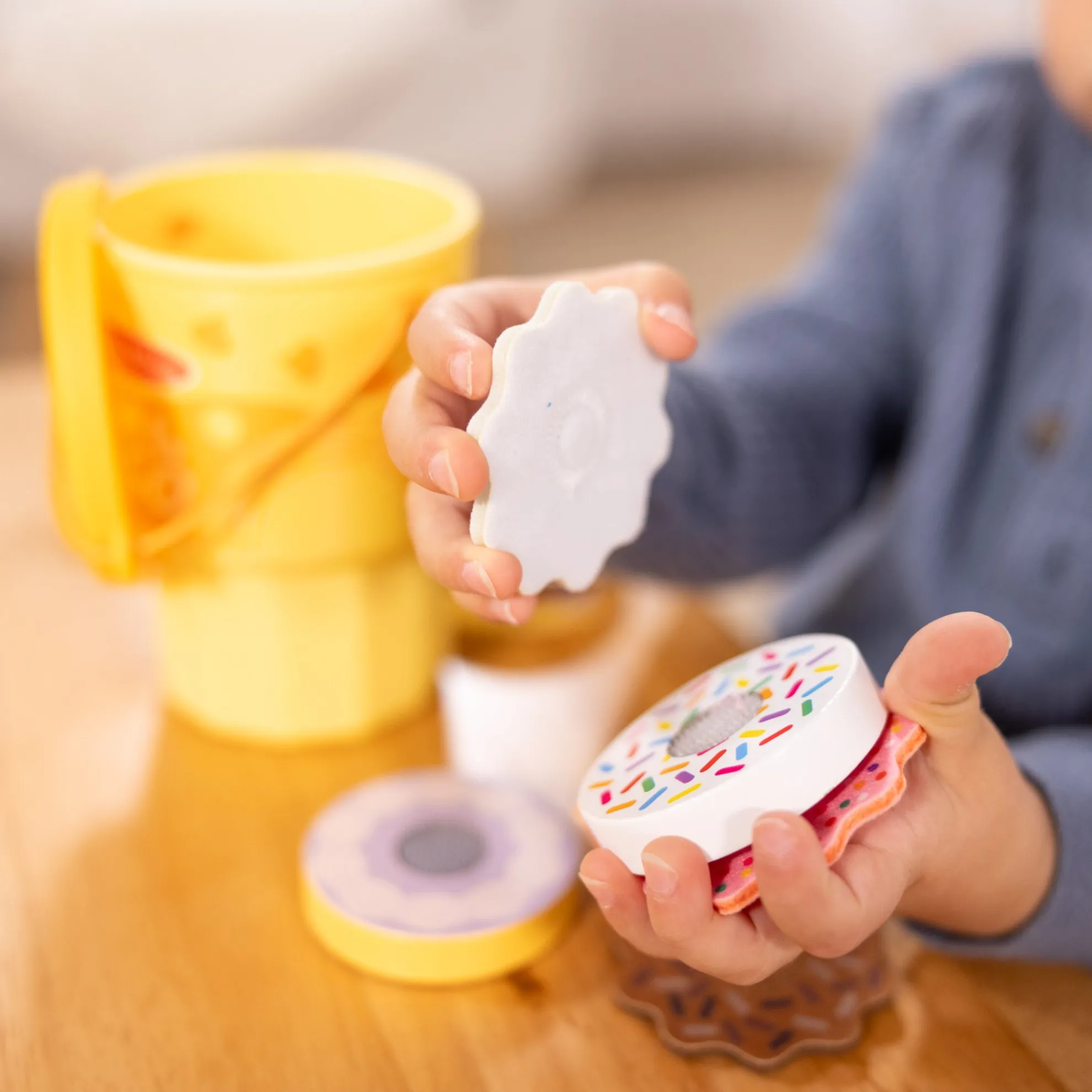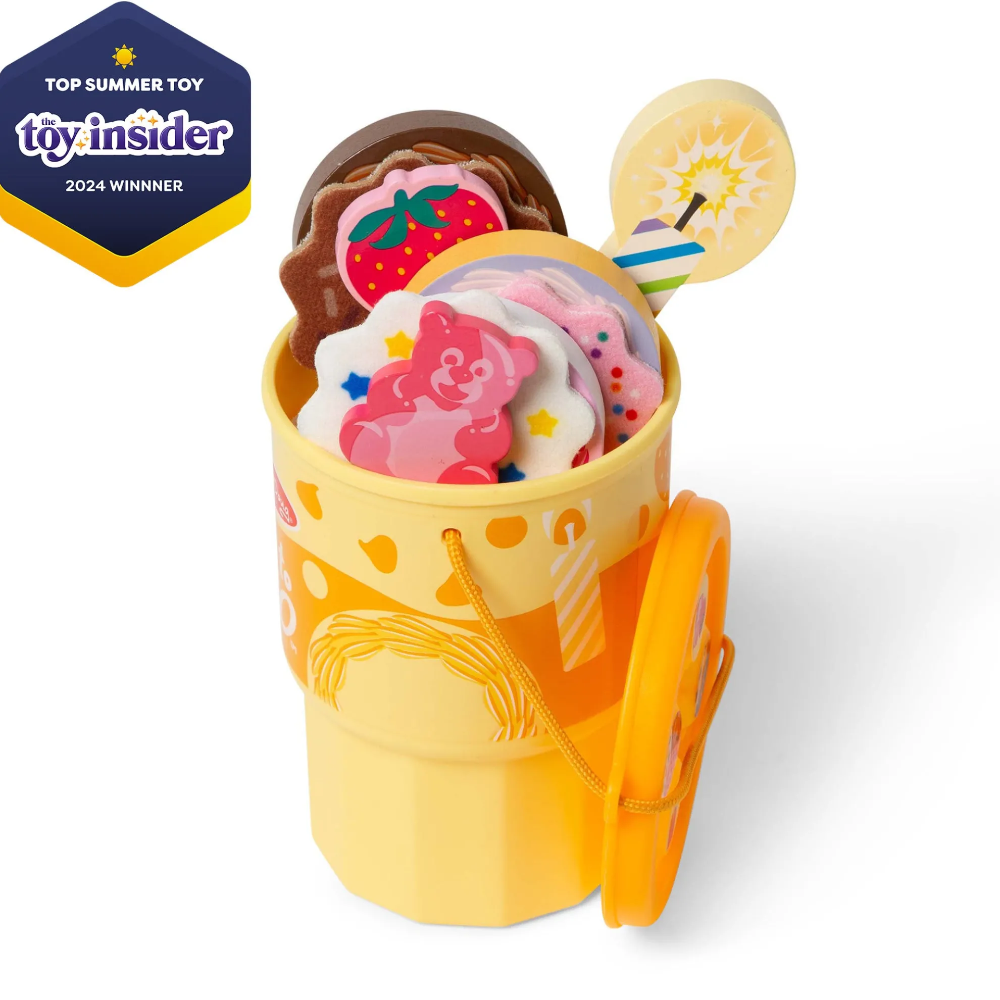 Take imagination on the go and create sweet play treats anywhere, any time! The durable cup with a handle and attached lid is filled to the brim with wooden and fabric play food for making decorated cookies, cupcakes, and layer cakes. Self-stick tabs keep felt icing layers and wooden candy decorations on wooden cookies. Stack them to create mini layer cakes, or fit layers in the pliable cupcake sleeve for individual cupcakes. Turn any treat into a celebration by topping creations with the wooden candle! Kids three and older will love placing their orders on the pop-button fidget lid, following the instructions on the activity card, and serving up “sweet” treats! All the pieces store in the take-along cup, made to fit in car seat, stroller, and vehicle cup holders, making Play to Go an innovative and easily portable travel toy for preschool boys and girls.
