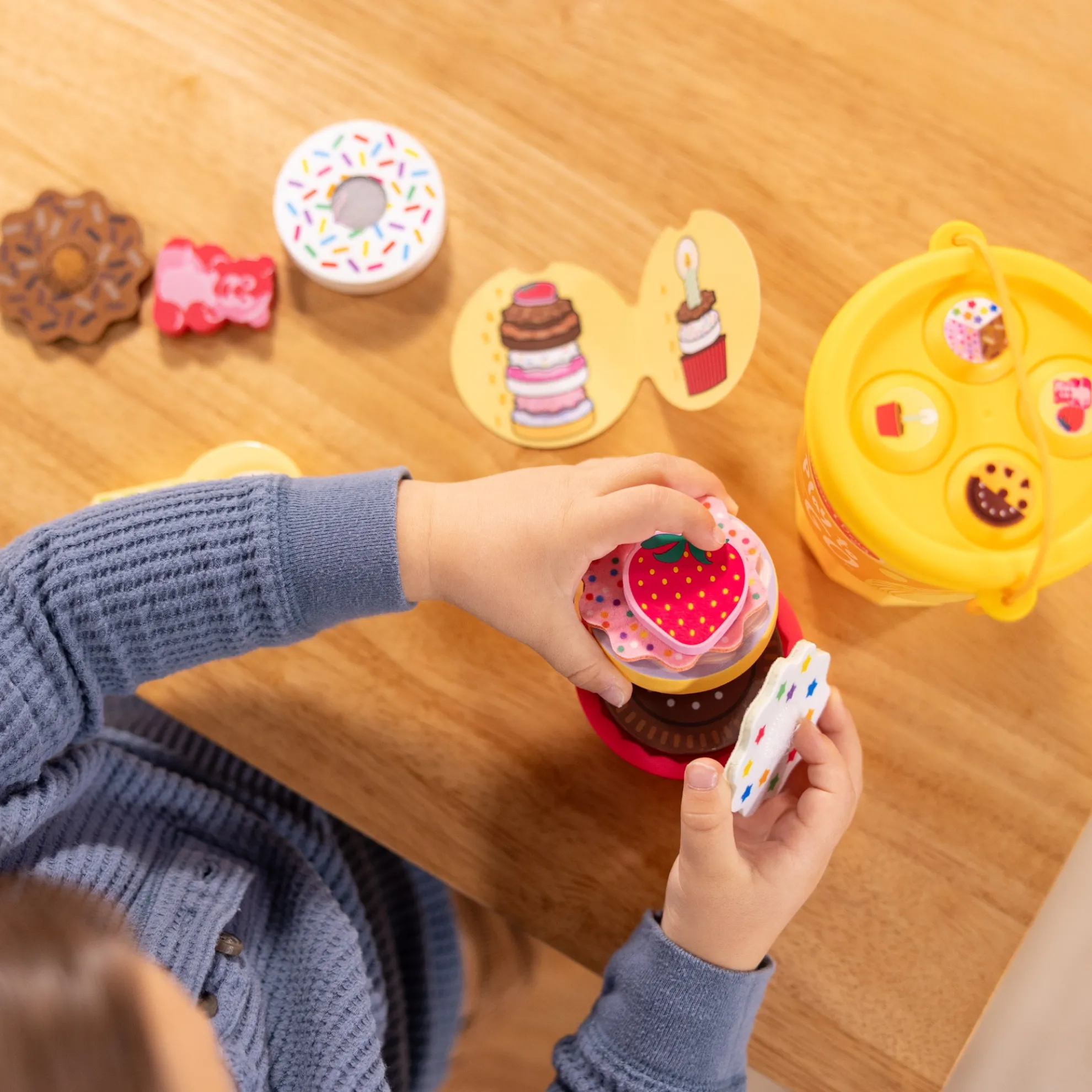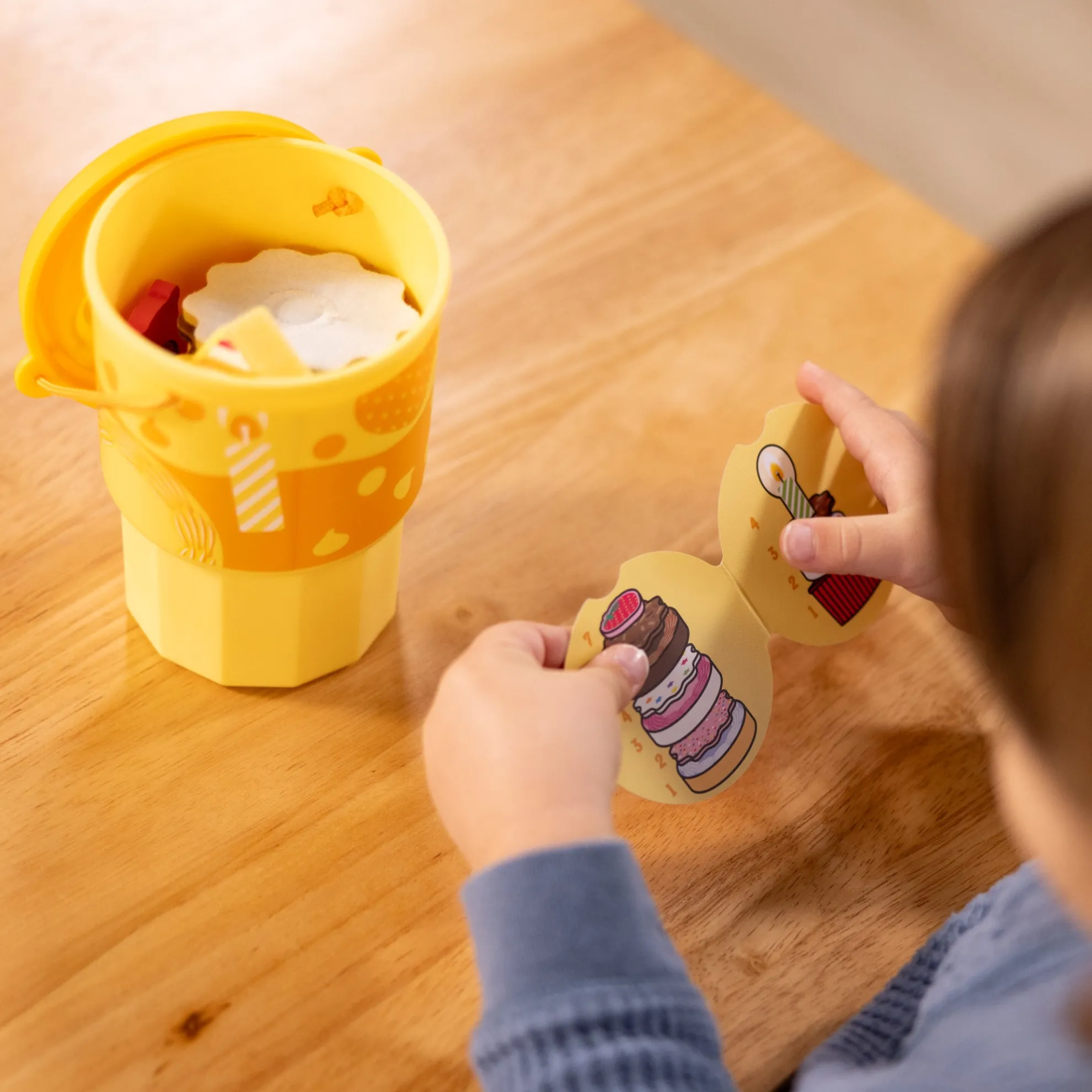 - 12-piece play set includes a durable take-along cup with a fidget lid for taking orders attached to a cord handle, 3 double-sided wooden cookies/cake layers with self-stick tabs, 3 felt icing layers, 2 wooden candy toppings, cupcake sleeve, wooden celebration candle, and an activity/instruction card