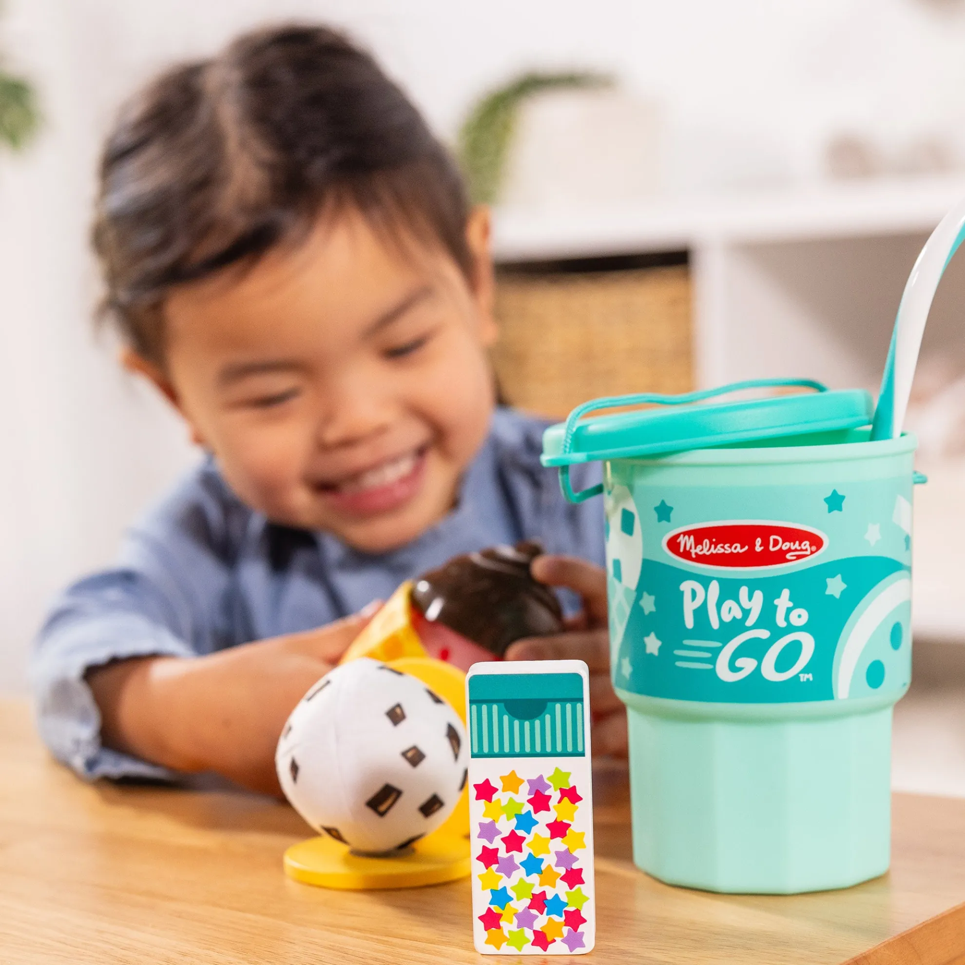 Take imagination on the go and create deliciously fun ice cream treats anywhere, any time! The durable cup with a handle and attached lid is chock full of wooden and fabric play food for making ice cream cones, ice cream sandwiches, and fun milkshakes. There are two soft plush ice cream scoop balls, a felt waffle cone with self-stick tab, and swirls of play chocolate sauce for creating chocolate chip or strawberry ice cream cones. Put the scoops between two wooden chocolate candy cookies to make ice cream sandwiches, or drop the scoops into the cup, pretend to shake the double-sided wooden sprinkles jar, and add a straw for yummy play shakes! Kids three and older will love placing their orders on the pop-button fidget lid, following the instructions on the activity card, and serving up “cool” treats! All the pieces store in the take-along cup, made to fit in car seat, stroller, and vehicle cup holders, making Play to Go an innovative and easily portable travel toy for preschool girls and boys.