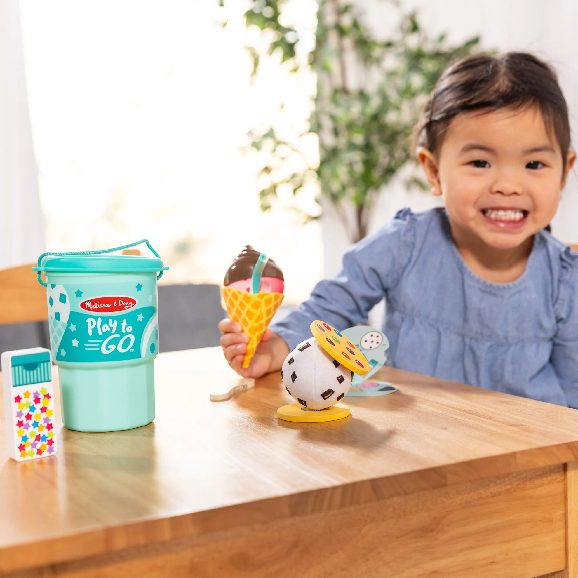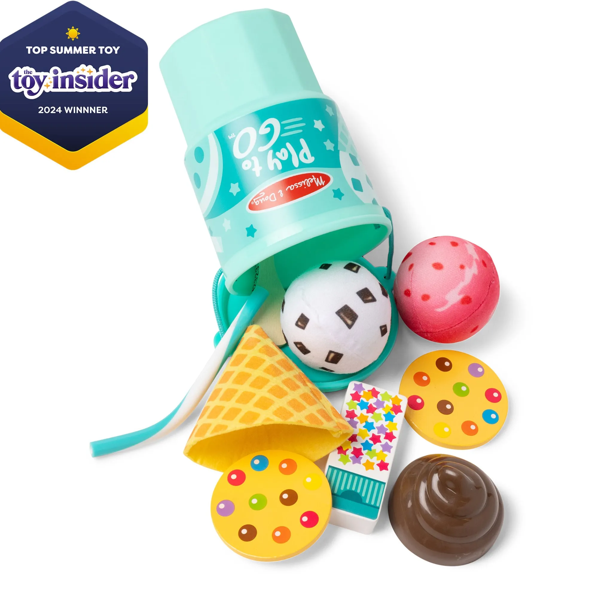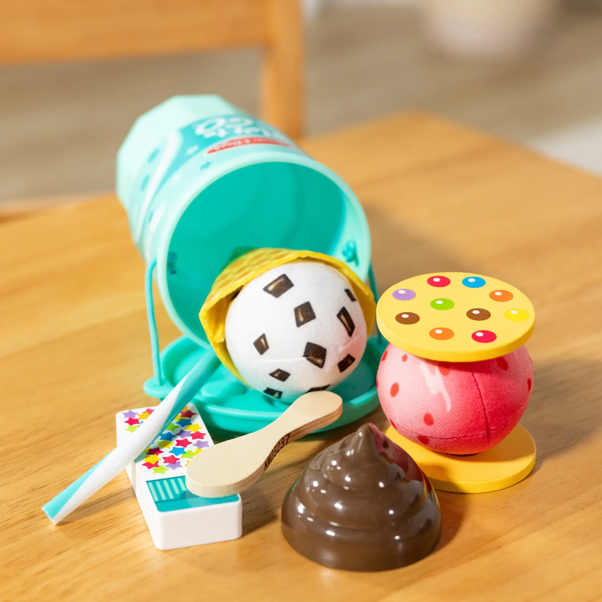 - 11-piece play set includes a durable take-along cup with a fidget lid for taking orders attached to a cord handle, 2 plush ice cream scoops, chocolate sauce, felt waffle cone, 2 wooden cookies, double-sided wooden sprinkles jar, wooden spoon, straw, and an activity/instruction card