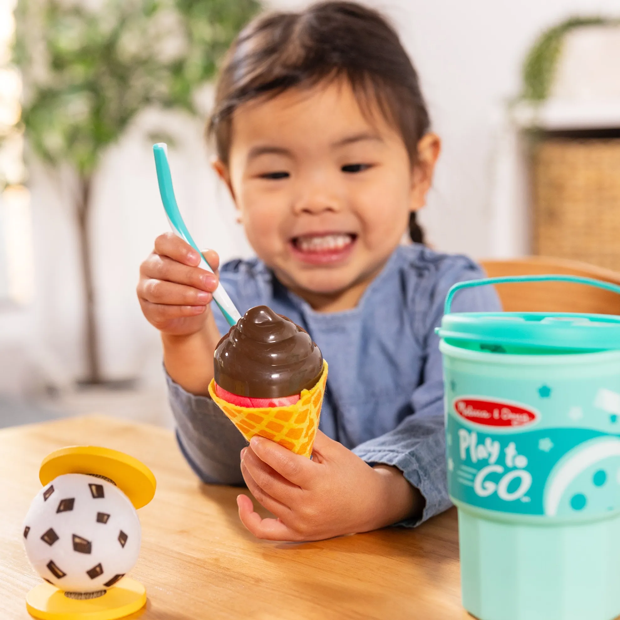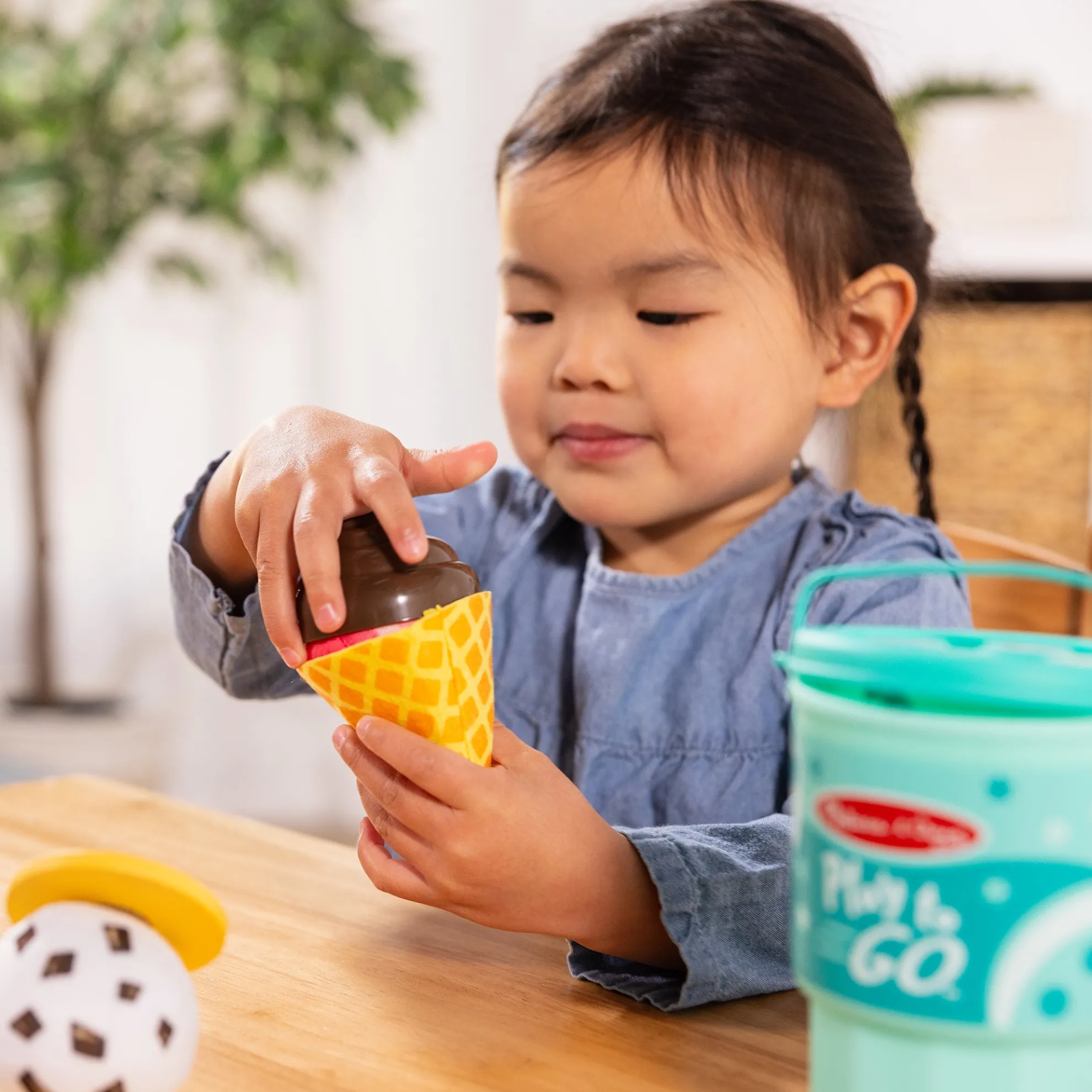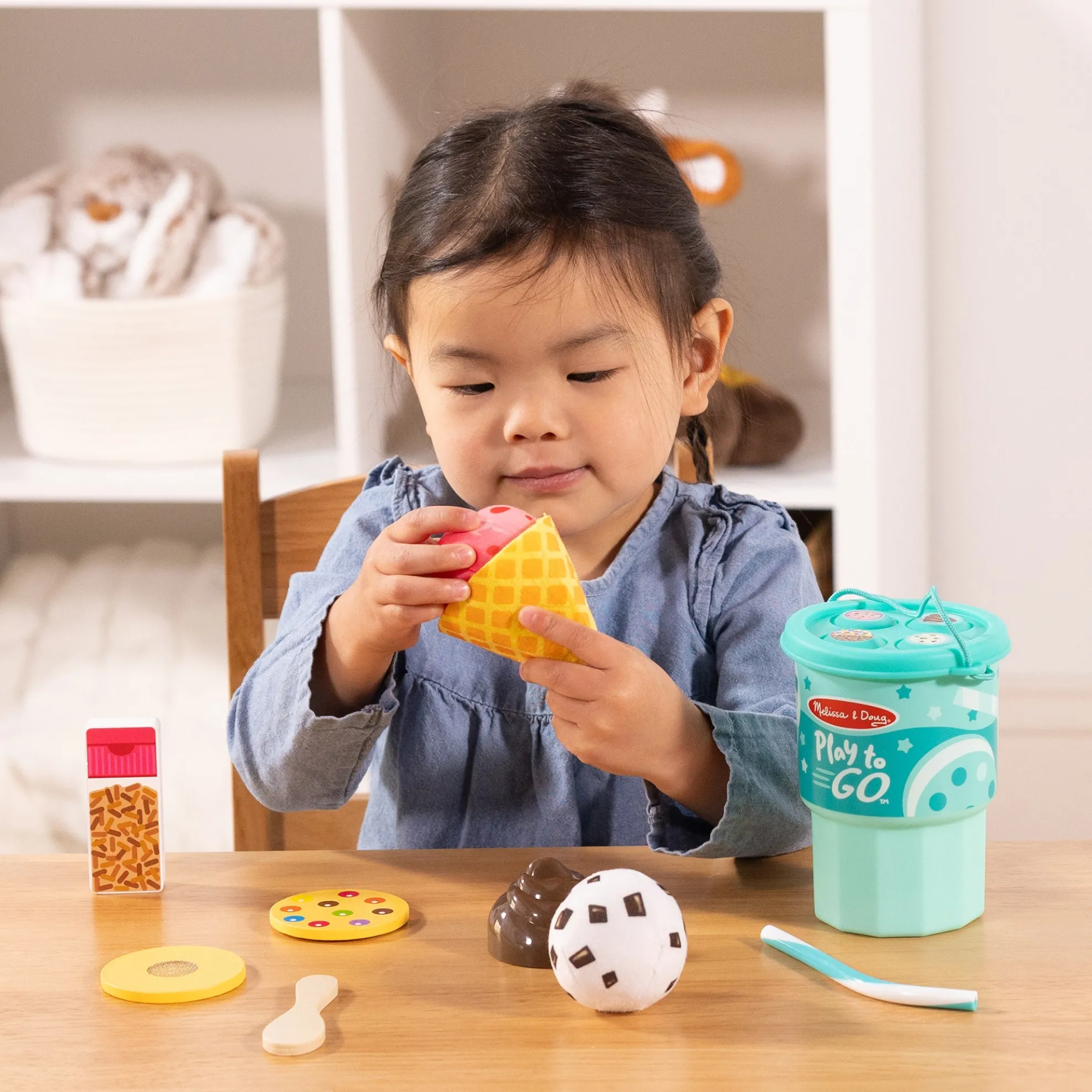 - 11-piece play set includes a durable take-along cup with a fidget lid for taking orders attached to a cord handle, 2 plush ice cream scoops, chocolate sauce, felt waffle cone, 2 wooden cookies, double-sided wooden sprinkles jar, wooden spoon, straw, and an activity/instruction card