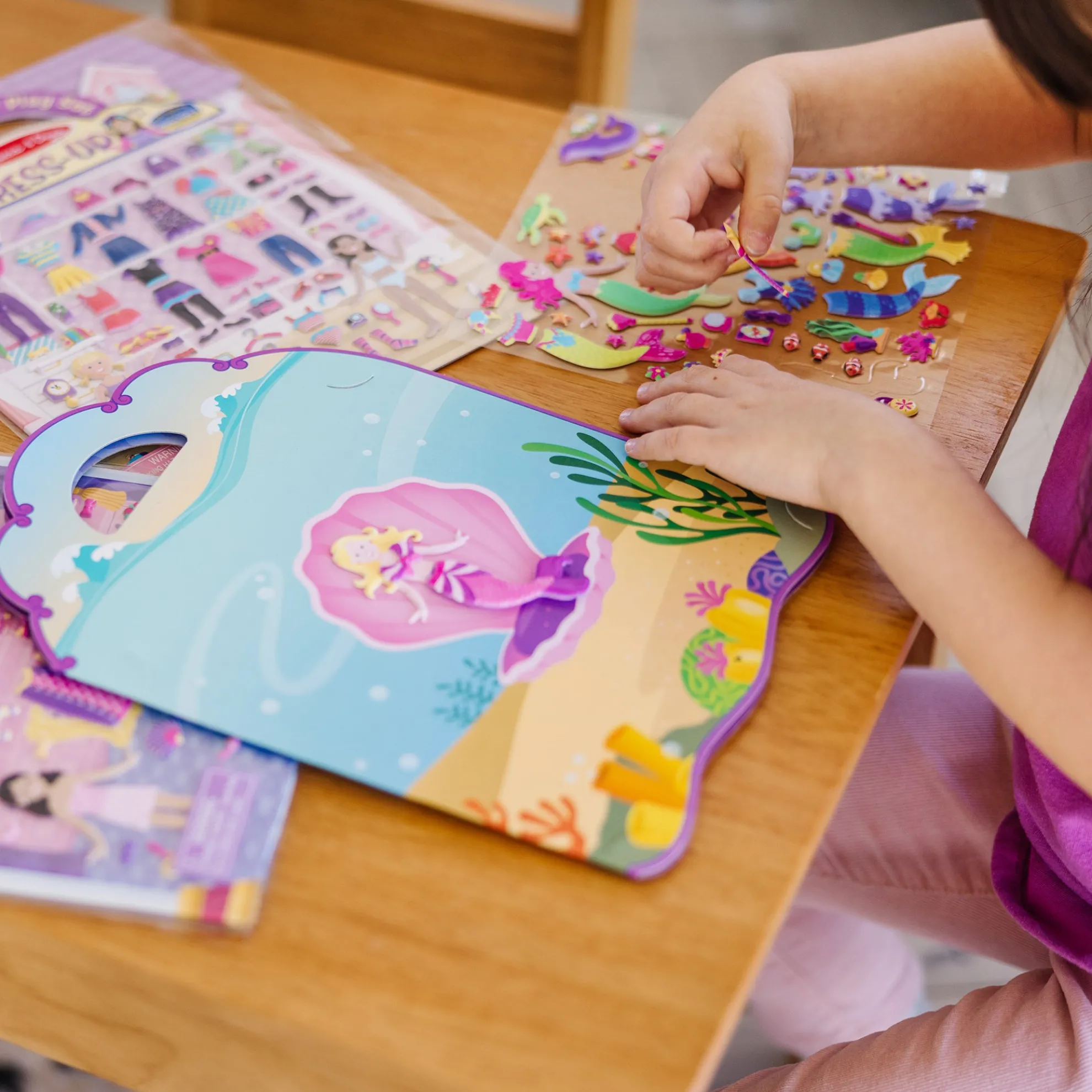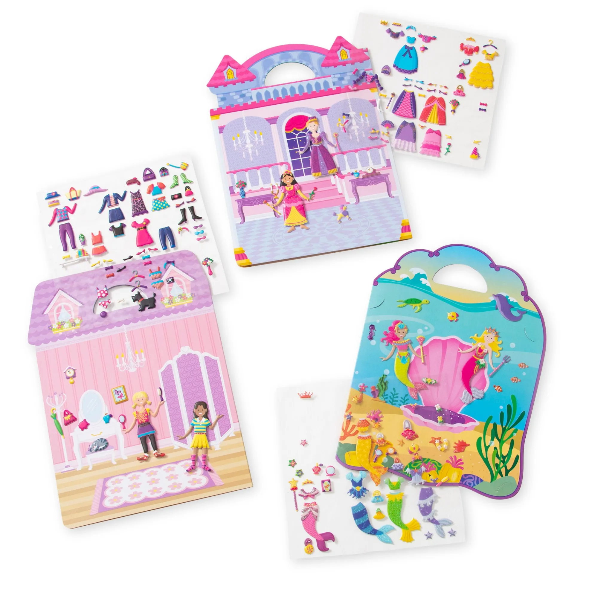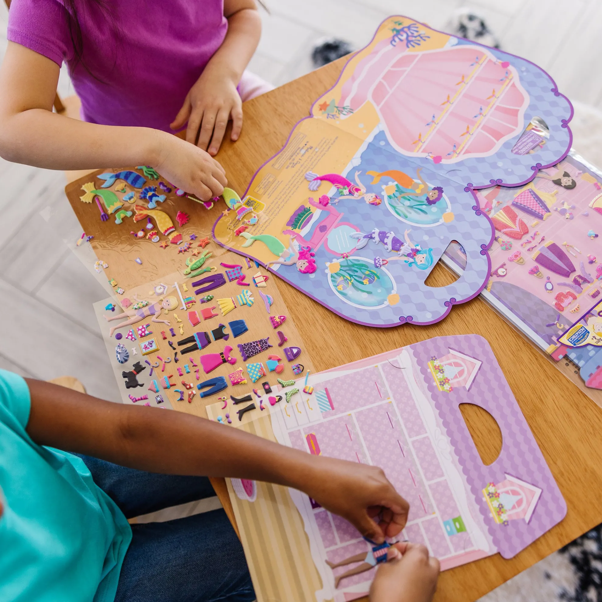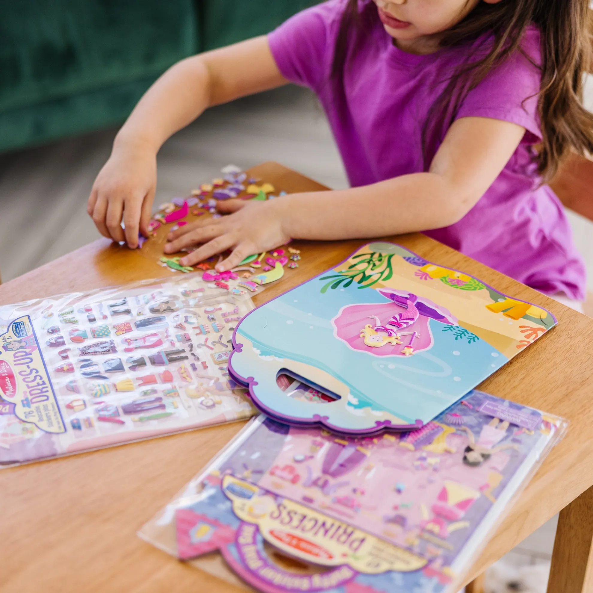 Tell a puffy-sticker story on reusable background scenes! Each set comes with a folding double-sided background card and 65+ reusable puffy stickers to outfit sticker models, fill an enchanting castle, decorate an undersea treasure trove, and more. Reusable backgrounds fill both sides of the sturdy, stand-up cards, so kids can build a multi-page story to “read” or just have fun rearranging the pieces for endless sticker fun. The puffy stickers mix, match, and layer in any combination! Bonus: The sturdy background board folds to neatly store it all away, and a diecut handle makes these fold-and-go play sets great for travel. Bundle includes three sets in three pretty themes: mermaid, princess, and dress-up. This product is certified by the Forest Stewardship Council. FSC certification ensures that products come from responsibly managed forests that provide environmental, social, and economic benefits, and that forests are protected for future generations. Please note that FSC certification applies to new inventory only (FSC C156584).
