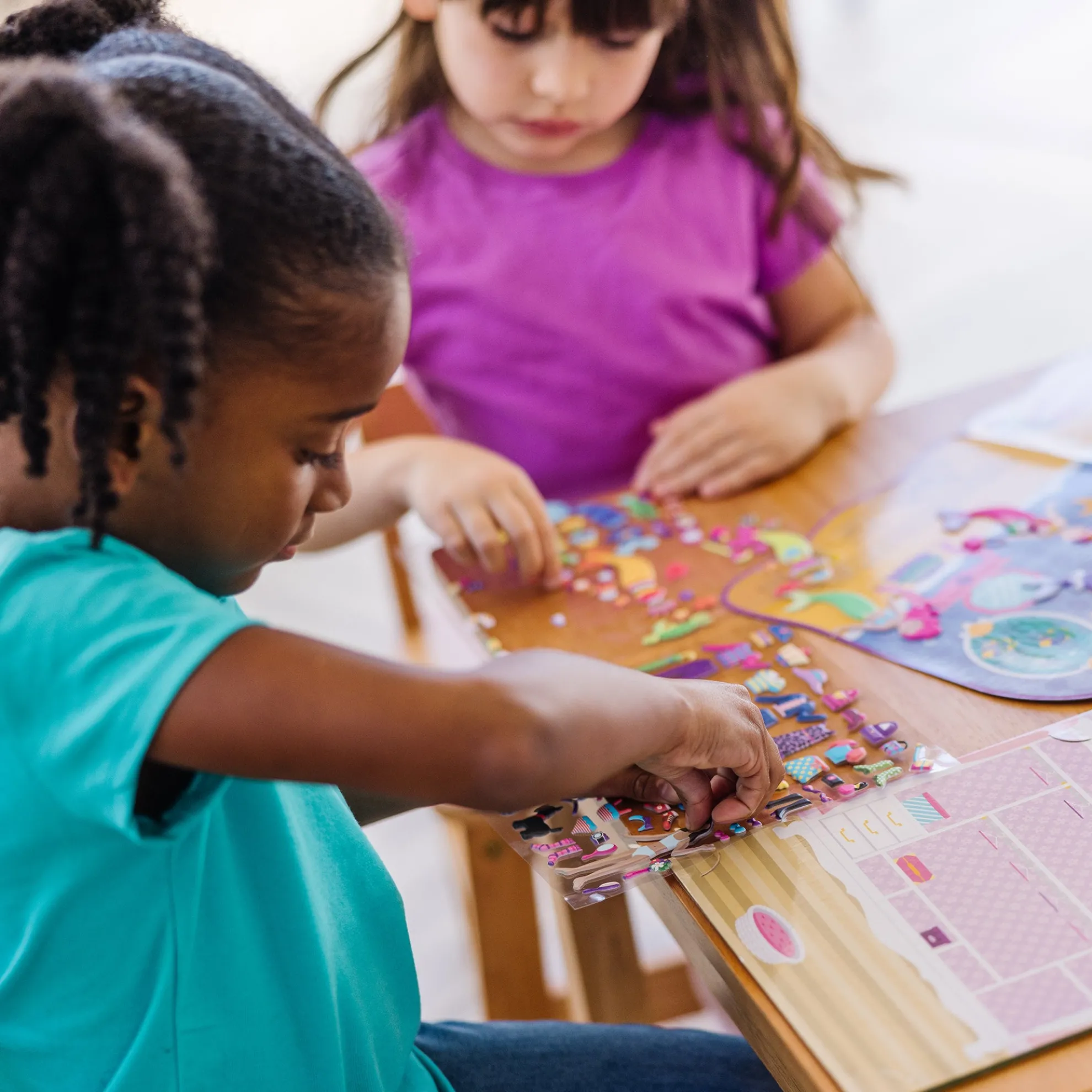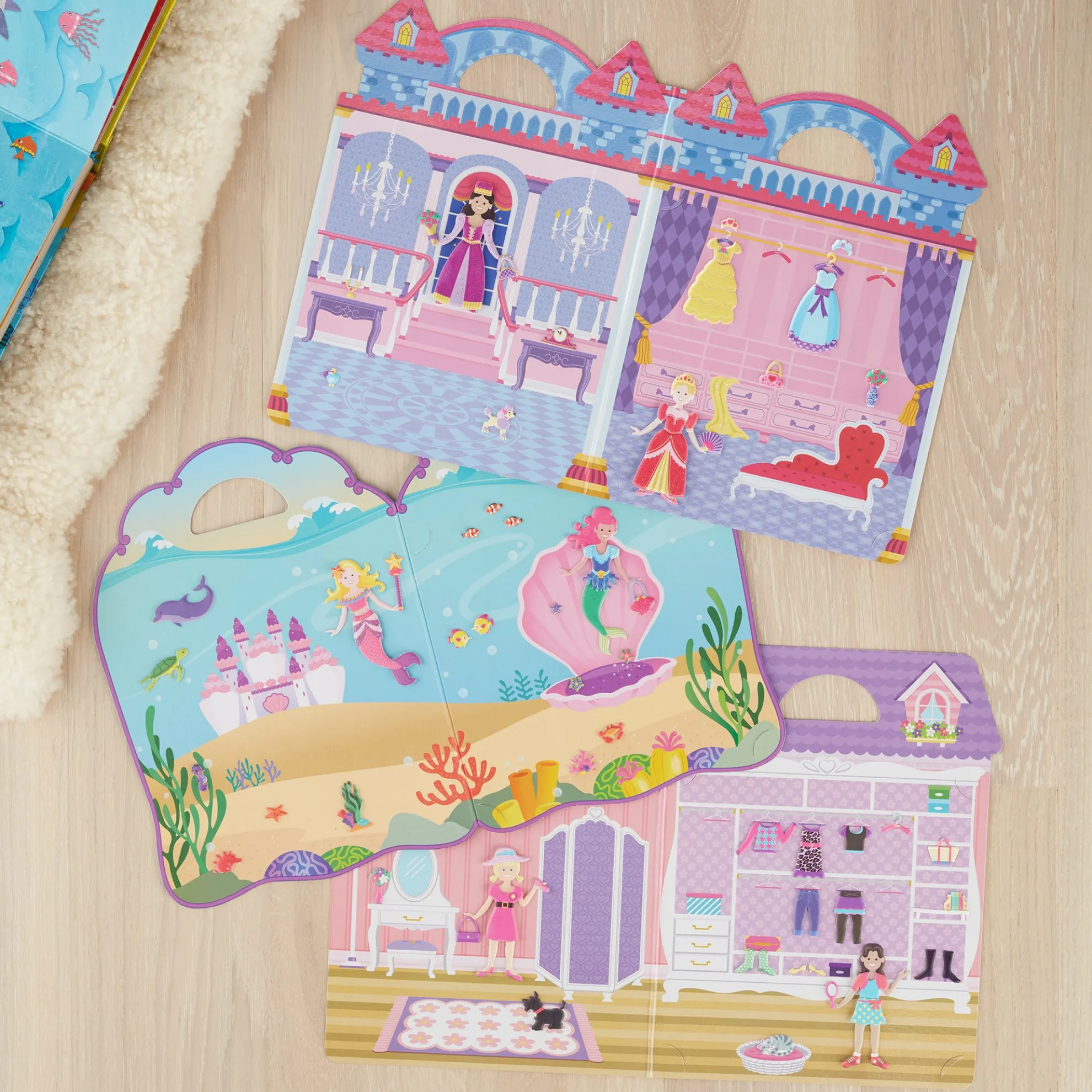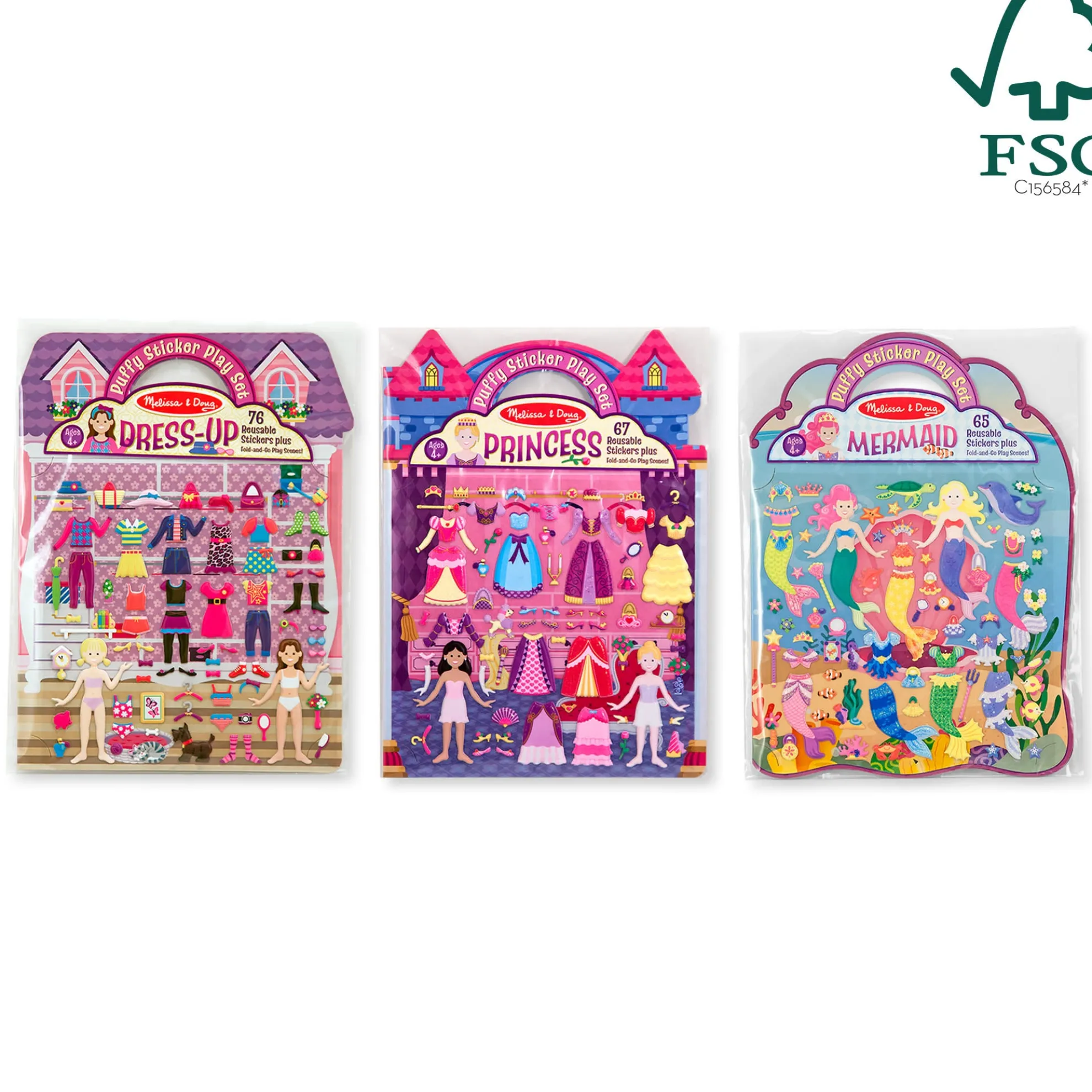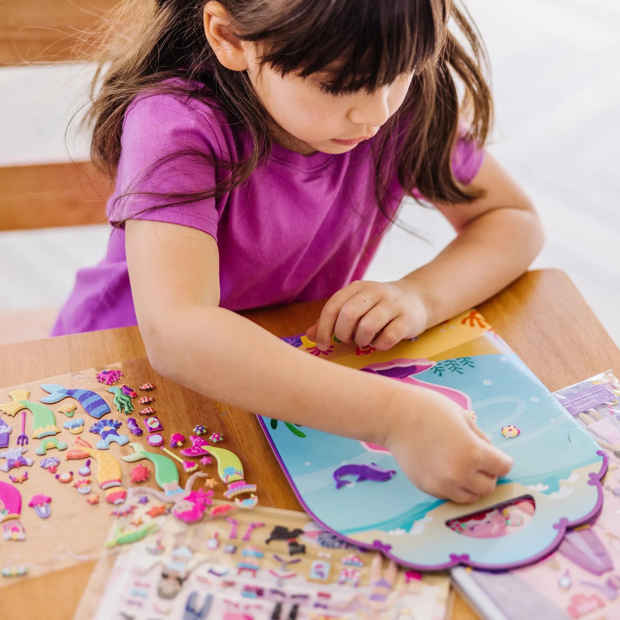 Tell a puffy-sticker story on reusable background scenes! Each set comes with a folding double-sided background card and 65+ reusable puffy stickers to outfit sticker models, fill an enchanting castle, decorate an undersea treasure trove, and more. Reusable backgrounds fill both sides of the sturdy, stand-up cards, so kids can build a multi-page story to “read” or just have fun rearranging the pieces for endless sticker fun. The puffy stickers mix, match, and layer in any combination! Bonus: The sturdy background board folds to neatly store it all away, and a diecut handle makes these fold-and-go play sets great for travel. Bundle includes three sets in three pretty themes: mermaid, princess, and dress-up. This product is certified by the Forest Stewardship Council. FSC certification ensures that products come from responsibly managed forests that provide environmental, social, and economic benefits, and that forests are protected for future generations. Please note that FSC certification applies to new inventory only (FSC C156584).