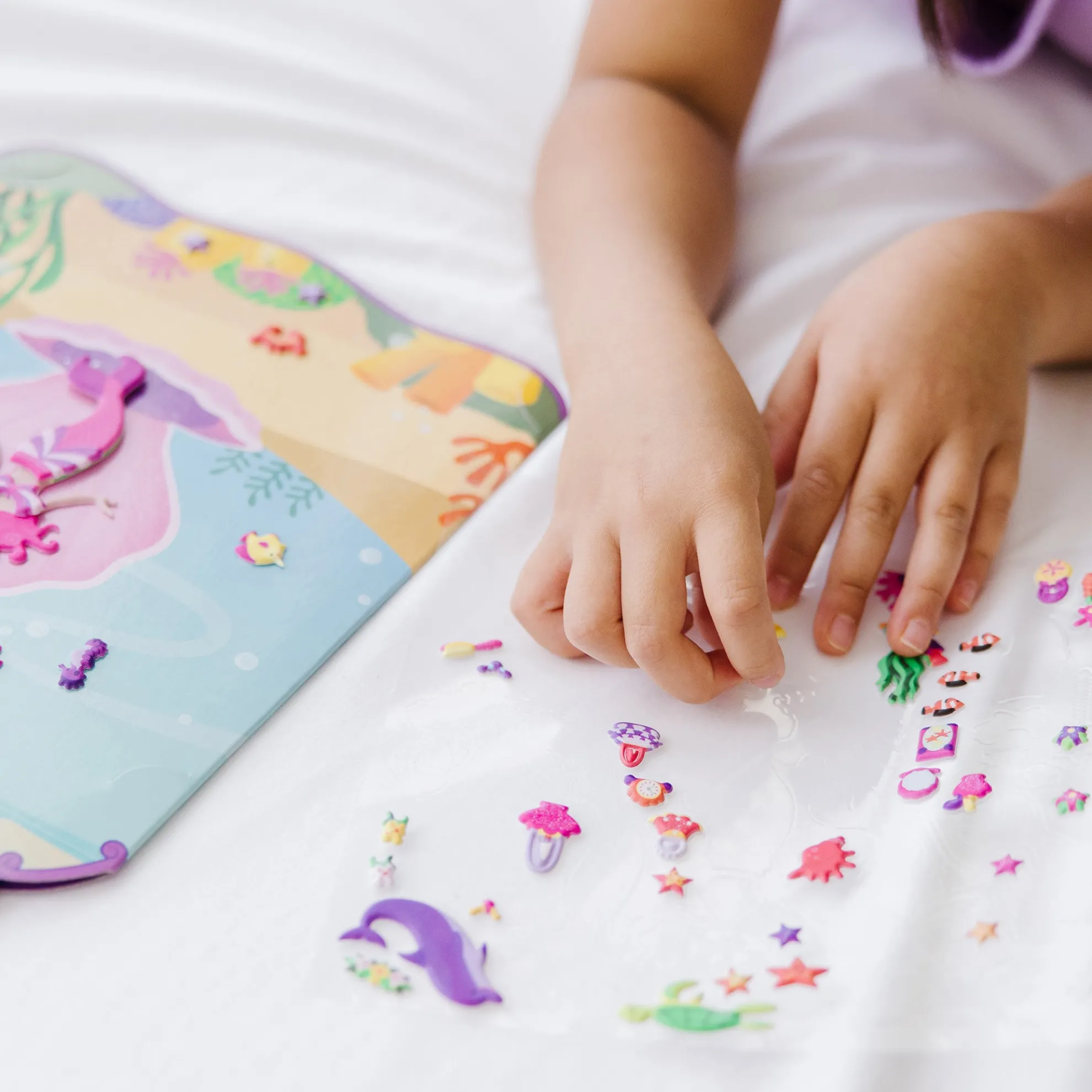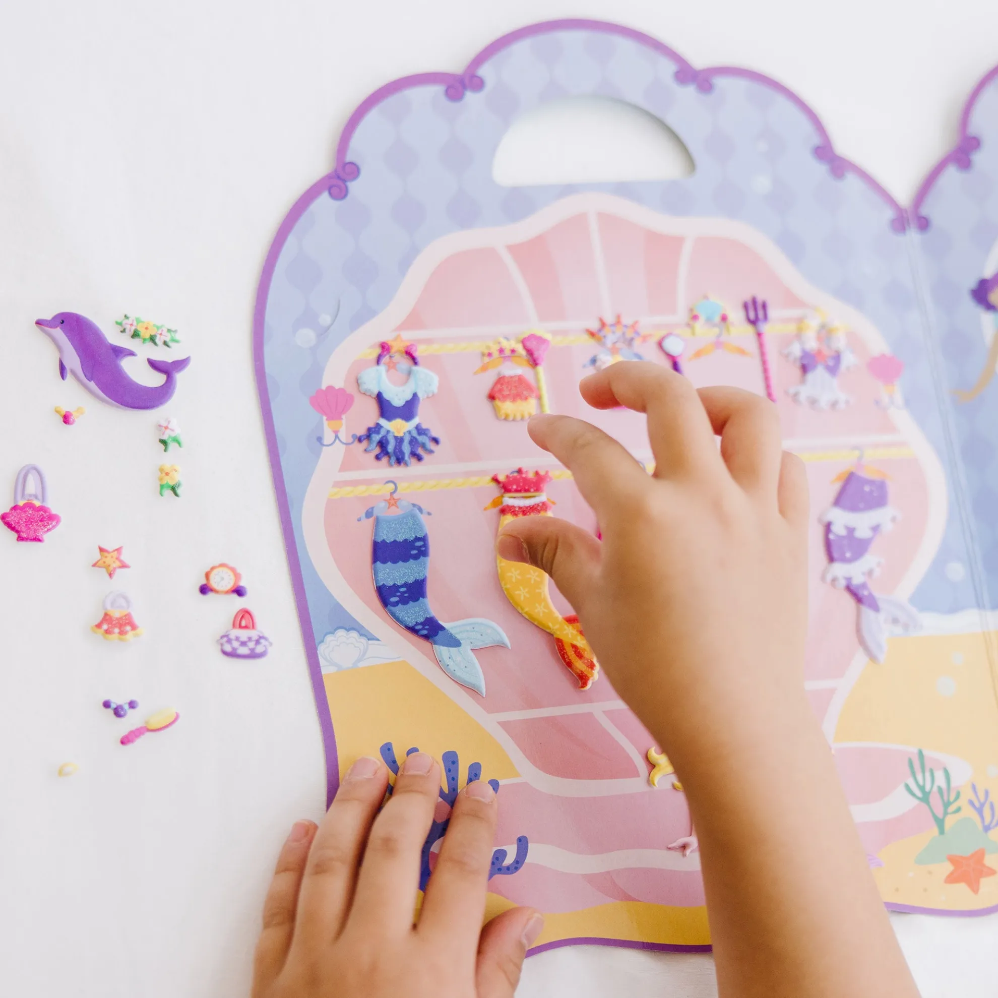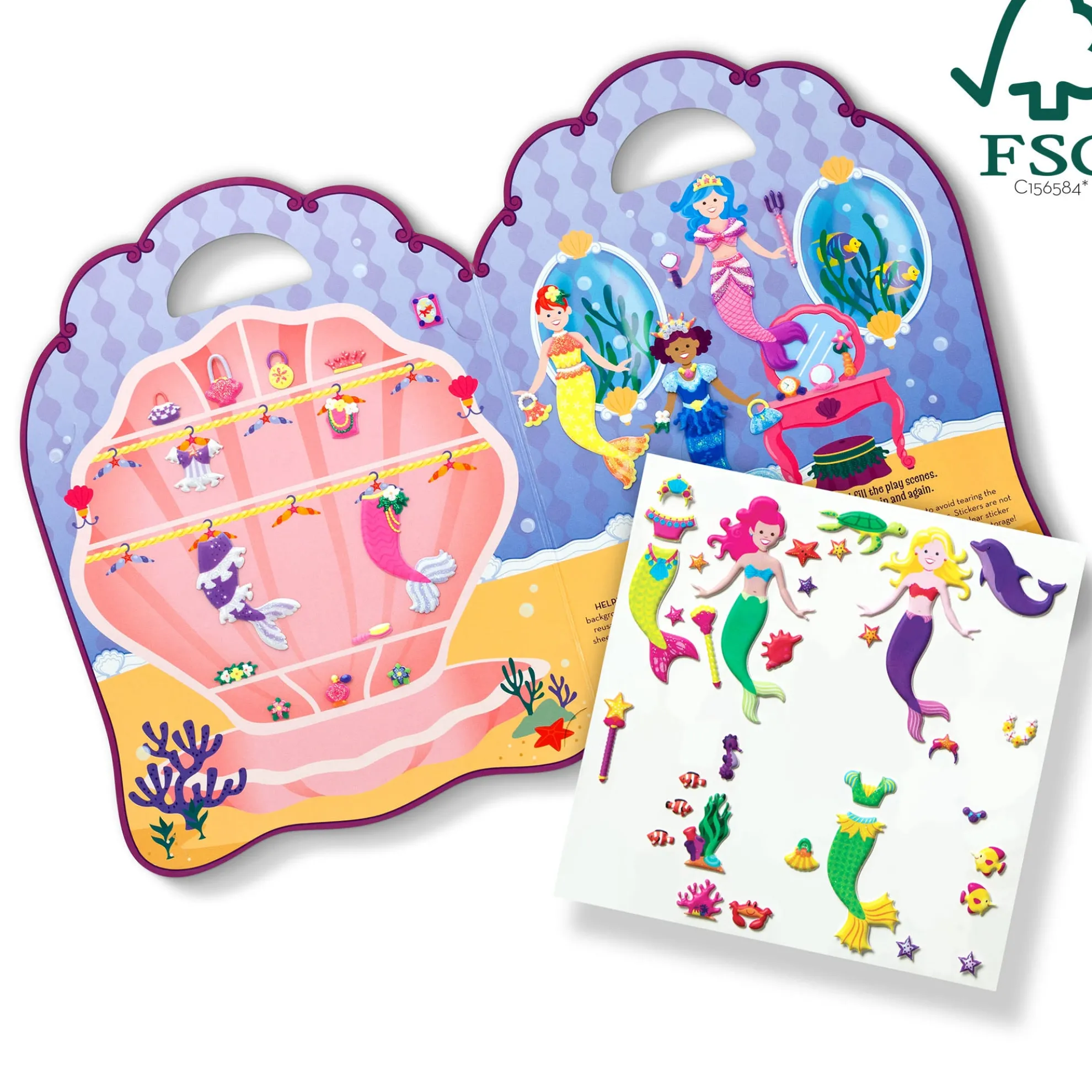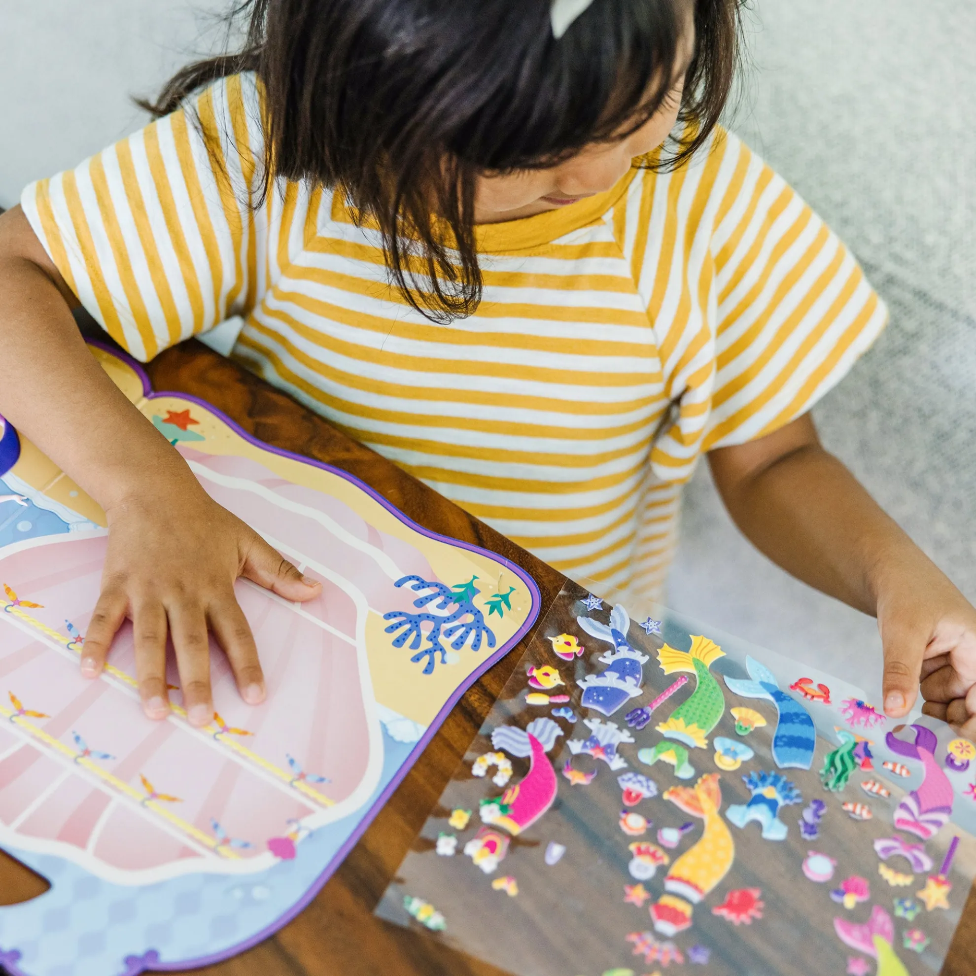 Imagine a glittery mermaid grotto–then bring it to life with this enchanting sticker set! A double-sided, glossy background board offers lots of space to layer and arrange the 65 reusable puffy stickers: A seashell closet has room for 10 glittering outfits; a trio of dress-up mermaids is ready for a makeover in the pretty purple dressing room; and a panoramic sandy seafloor sets the stage for unlimited undersea fun. Just add the shimmering puffy stickers to fill in the backgrounds, dress the mermaids, and create an original scene! The 65 stickers are easy to place, layer, and rearrange, so the storytelling possibilities are endless. And the gorgeous dress-up stickers mix, match, and layer in any combination, and fit all five of the dress-up mermaids. When playtime is over, simply fold up the sturdy background board store it all away–then just grab the diecut handle and take this fantastical sticker set to go. This product is certified by the Forest Stewardship Council. FSC certification ensures that products come from responsibly managed forests that provide environmental, social, and economic benefits, and that forests are protected for future generations. Please note that FSC certification applies to new inventory only (FSC C156584)