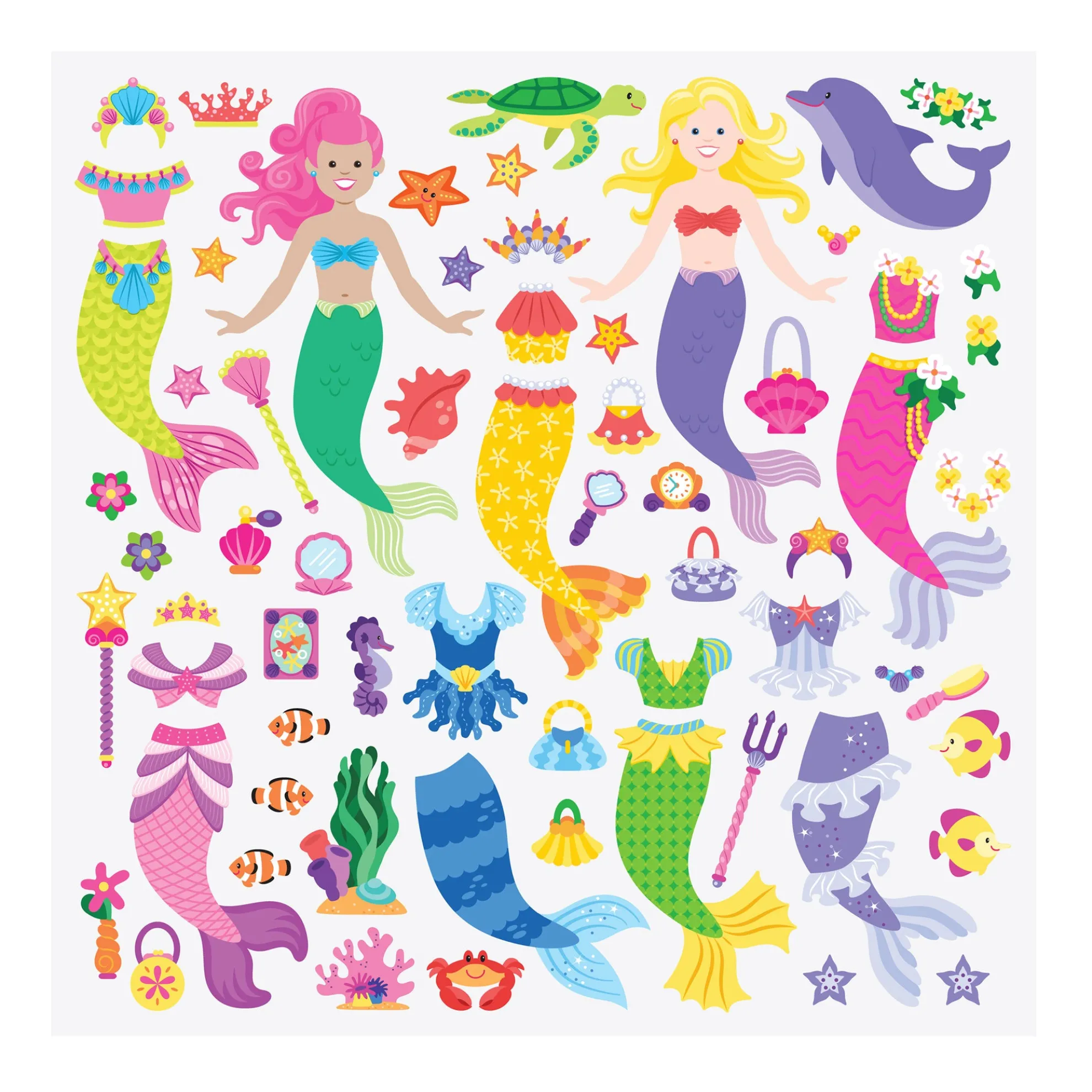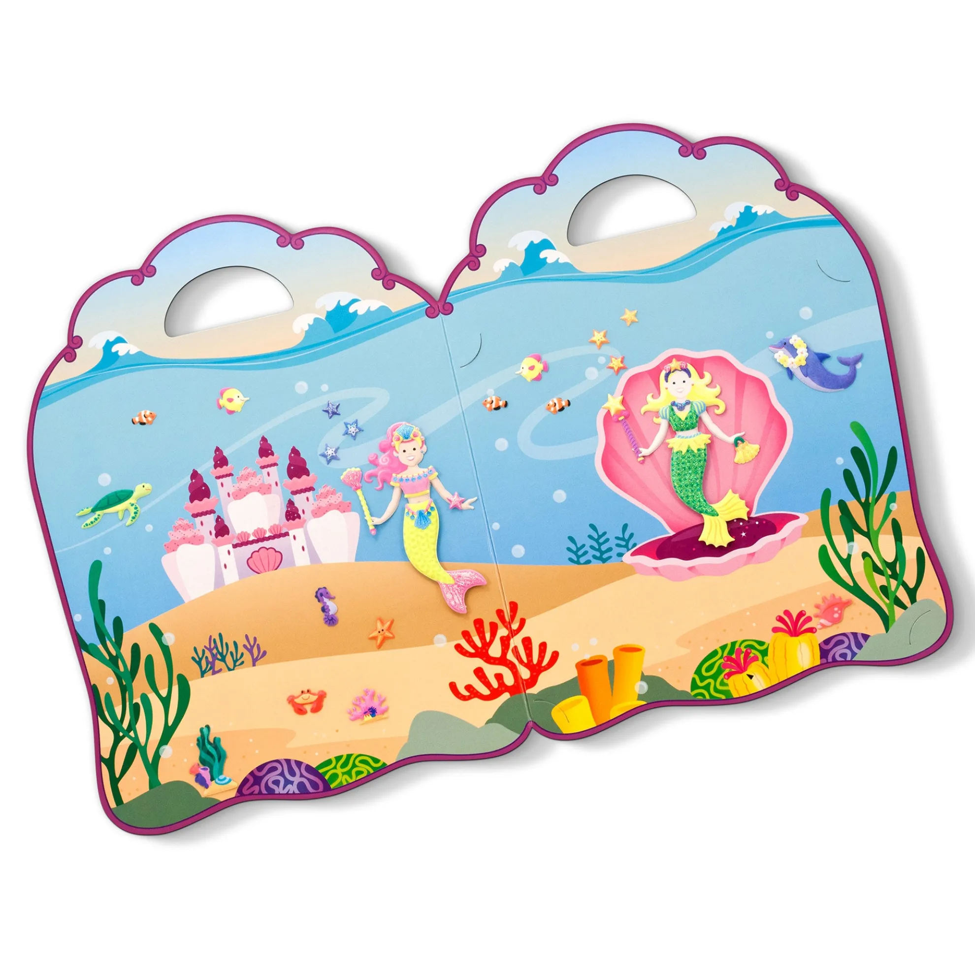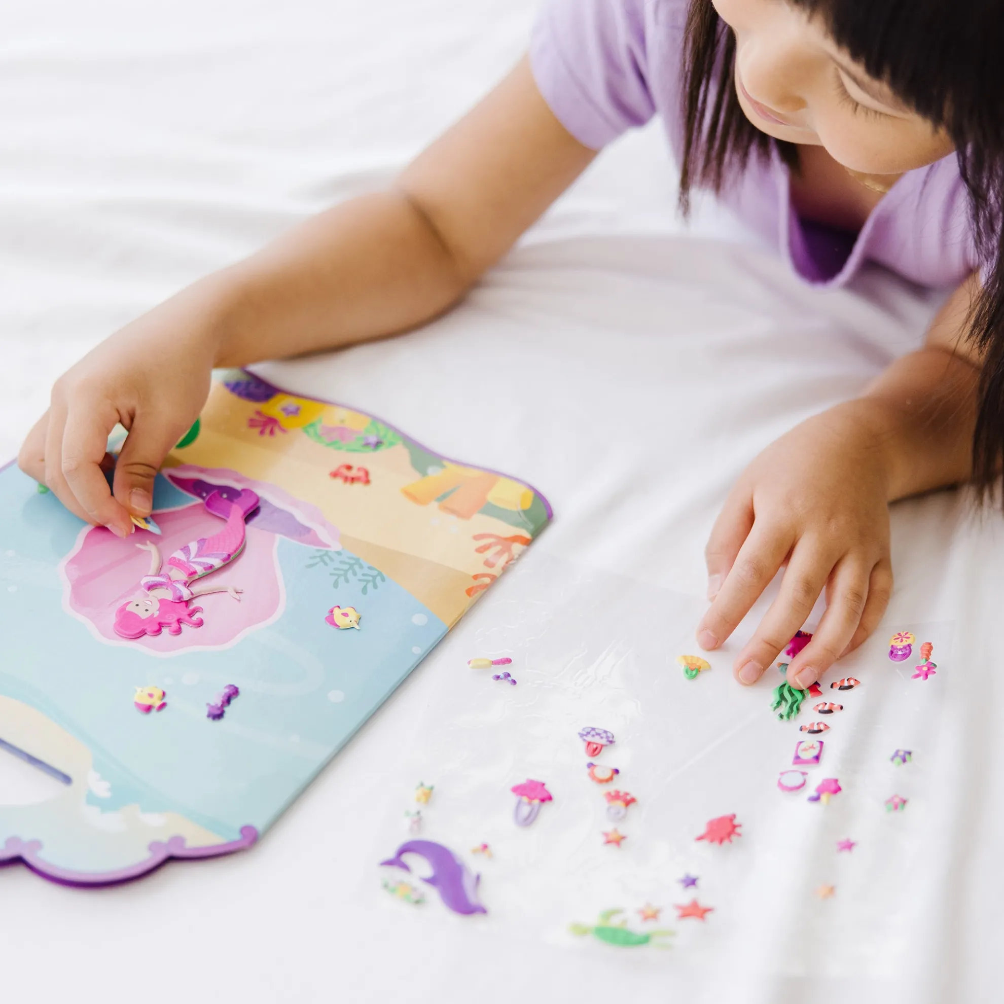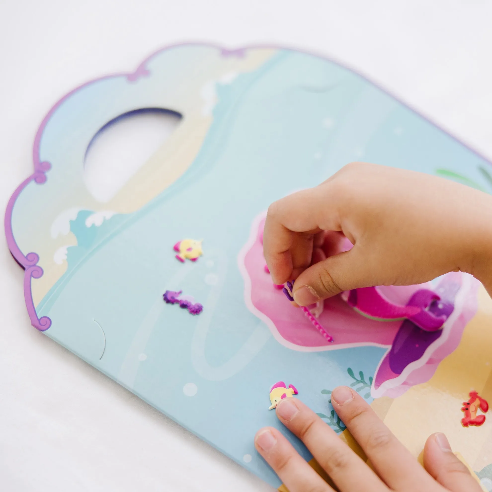 Imagine a glittery mermaid grotto–then bring it to life with this enchanting sticker set! A double-sided, glossy background board offers lots of space to layer and arrange the 65 reusable puffy stickers: A seashell closet has room for 10 glittering outfits; a trio of dress-up mermaids is ready for a makeover in the pretty purple dressing room; and a panoramic sandy seafloor sets the stage for unlimited undersea fun. Just add the shimmering puffy stickers to fill in the backgrounds, dress the mermaids, and create an original scene! The 65 stickers are easy to place, layer, and rearrange, so the storytelling possibilities are endless. And the gorgeous dress-up stickers mix, match, and layer in any combination, and fit all five of the dress-up mermaids. When playtime is over, simply fold up the sturdy background board store it all away–then just grab the diecut handle and take this fantastical sticker set to go. This product is certified by the Forest Stewardship Council. FSC certification ensures that products come from responsibly managed forests that provide environmental, social, and economic benefits, and that forests are protected for future generations. Please note that FSC certification applies to new inventory only (FSC C156584)