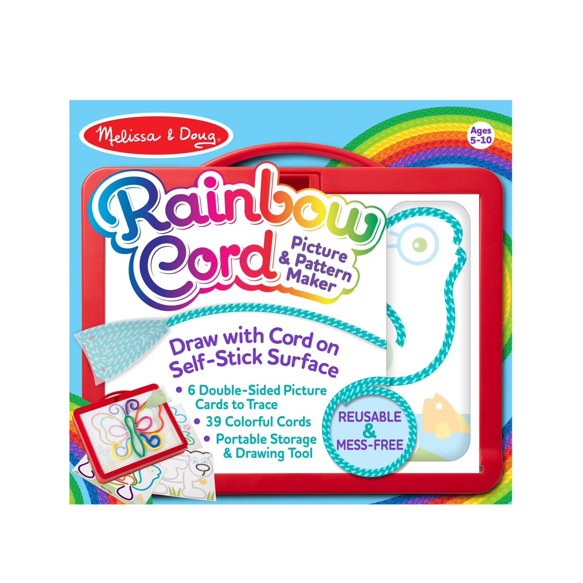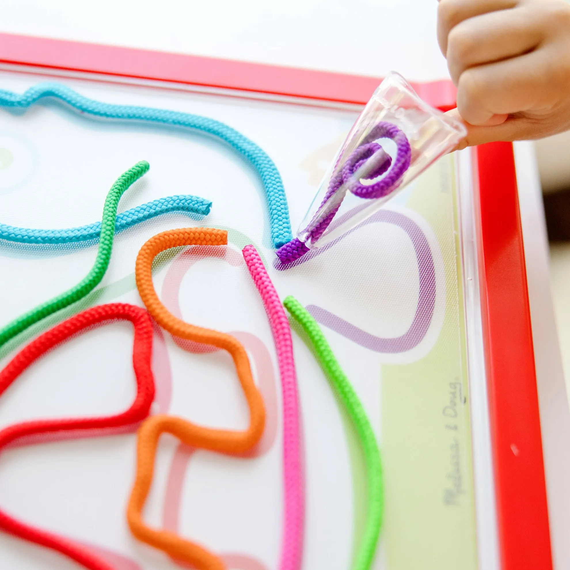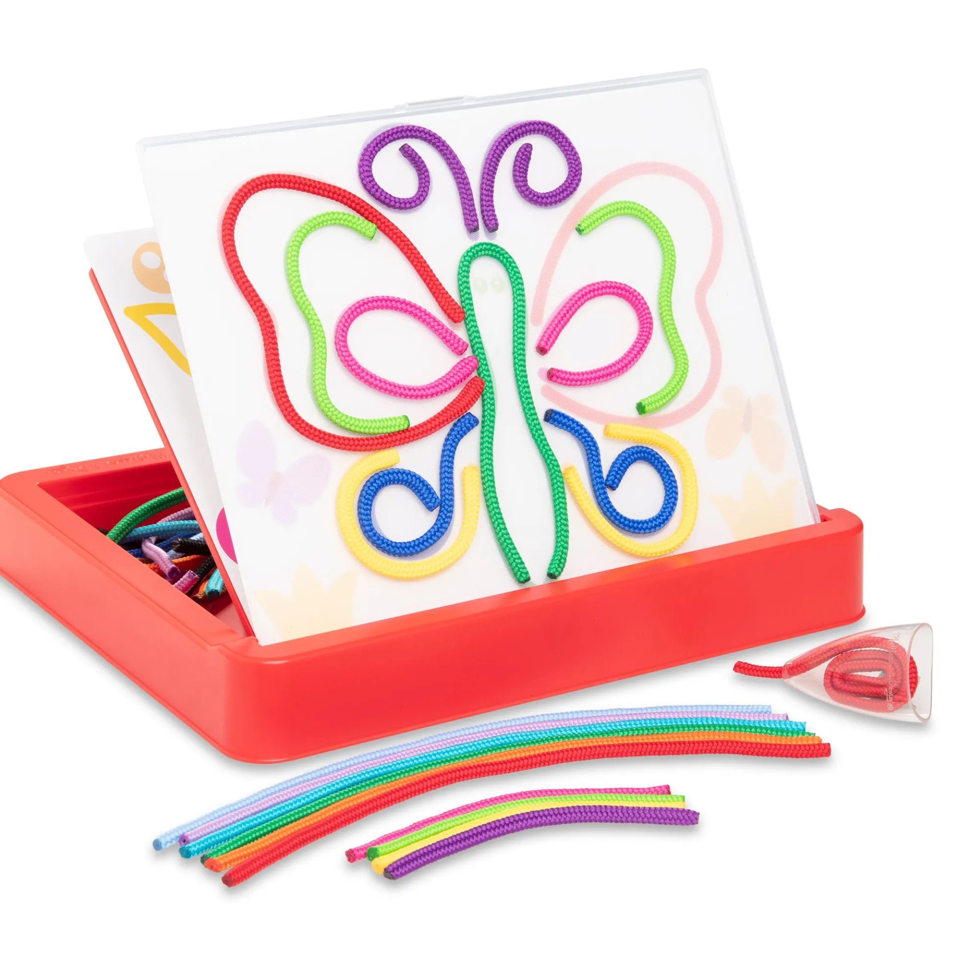 - Draw pictures and patterns with a rainbow of colored cords again and again — mess-free, portable, and reusable art activity