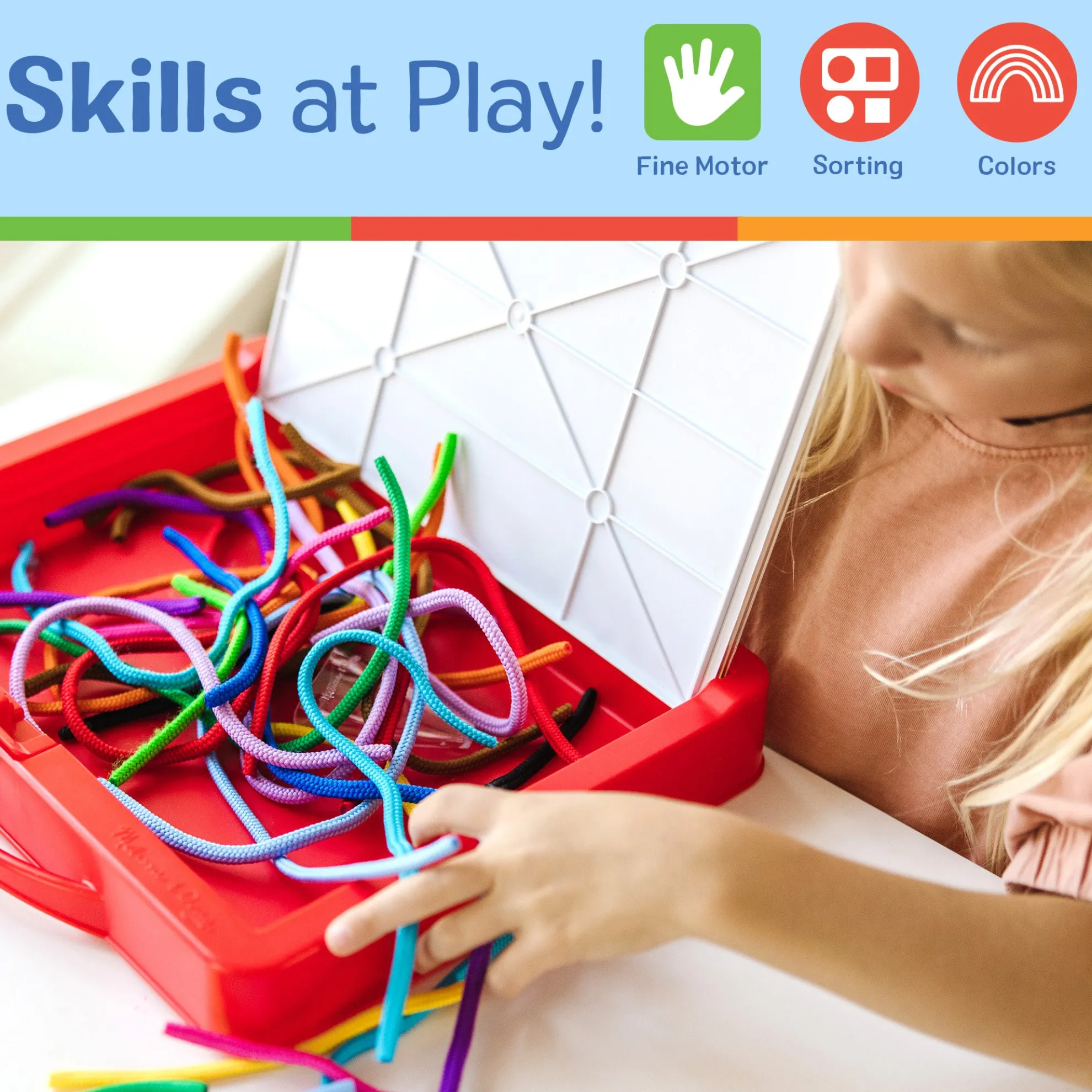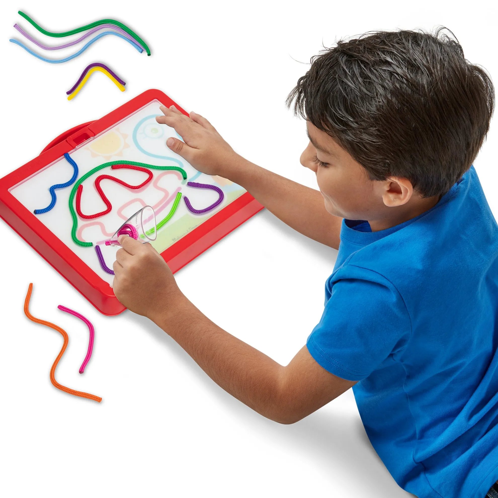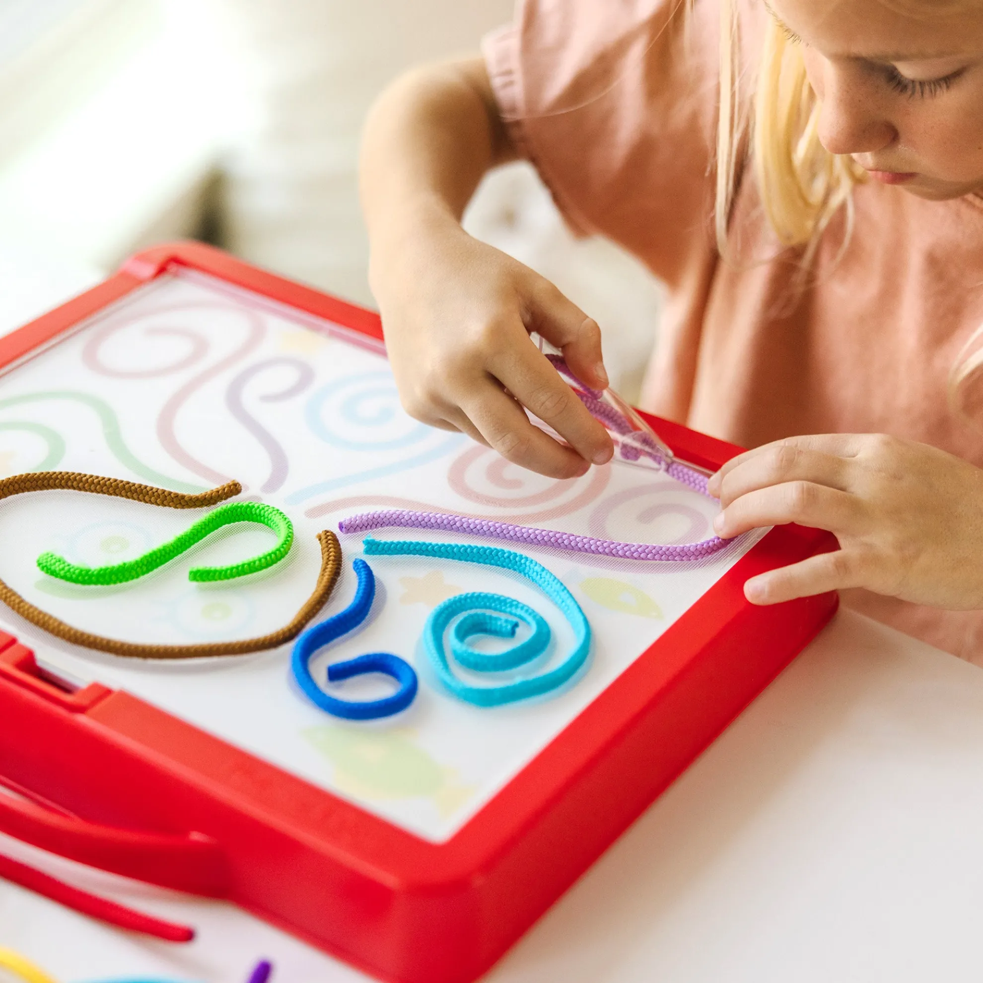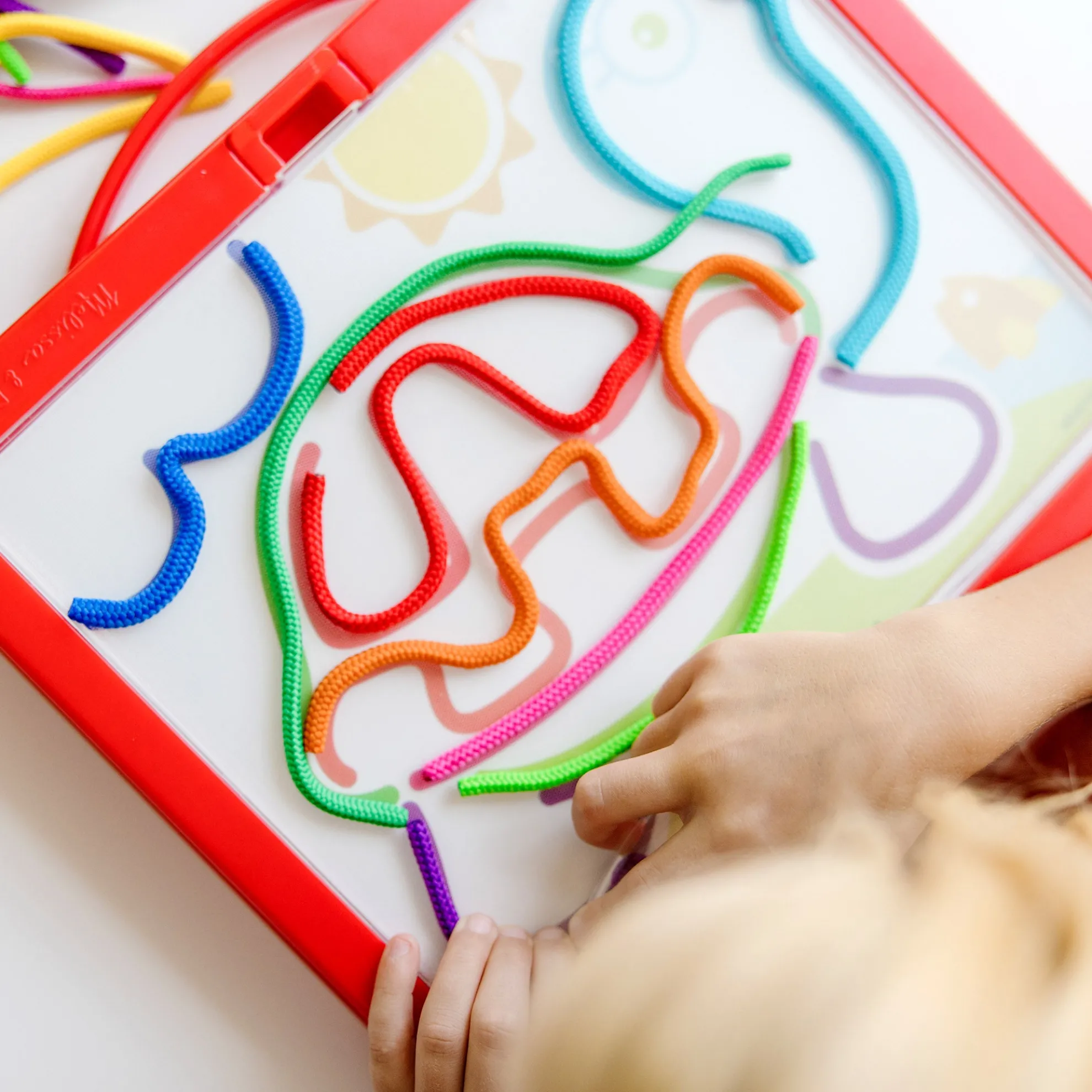 - Draw pictures and patterns with a rainbow of colored cords again and again — mess-free, portable, and reusable art activity