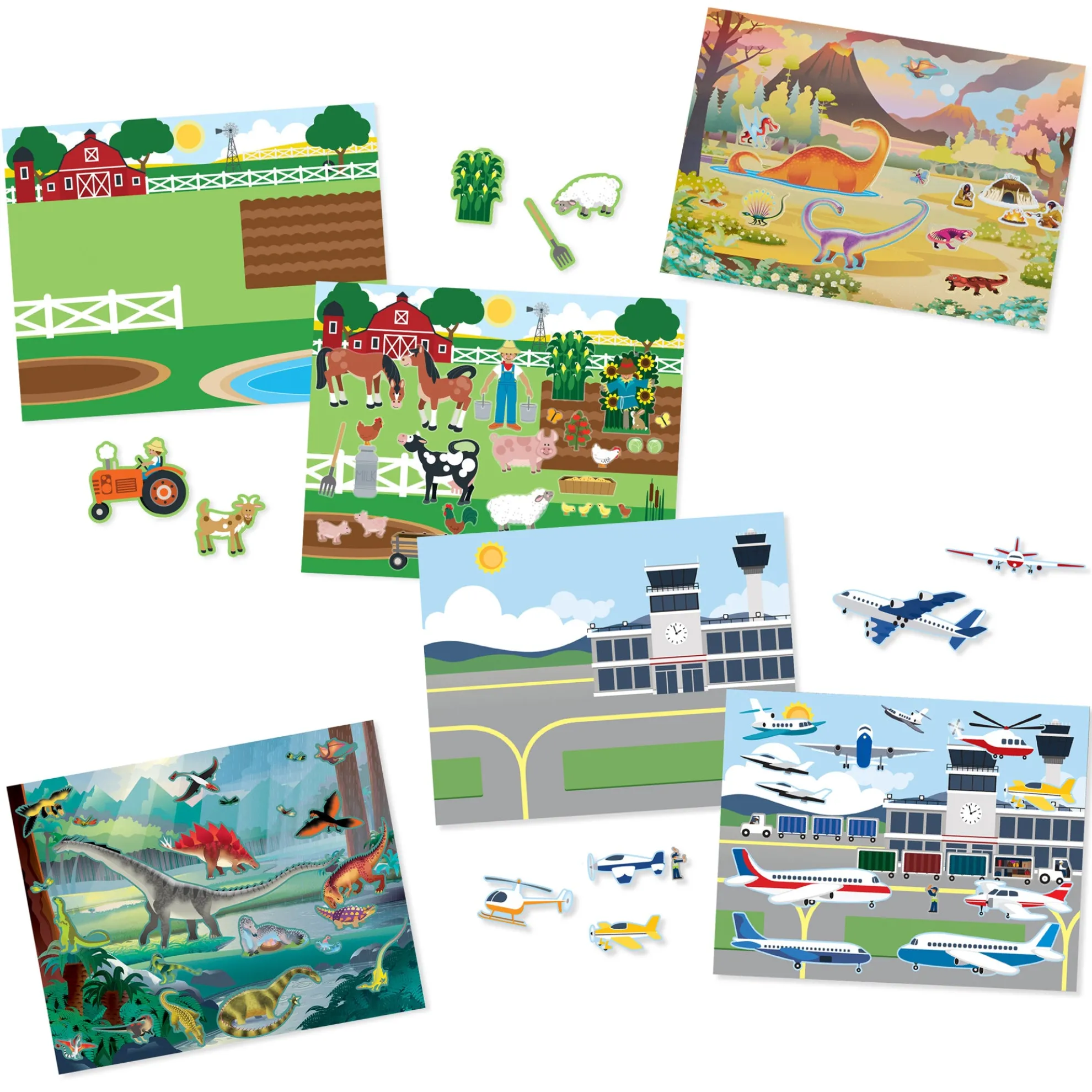 Fill the reusable scenes with hundreds of cling-style stickers to create adventures galore with this assortment of three jumbo activity pads with five glossy, full-color background scenes in each. Vehicle scenes include an airport, train tracks, harbor, construction site, and roadway; Habitats includes a farm, prehistoric landscape, desert oasis, jungle, and ocean; Prehistoric features a prehistoric ocean, Triassic, Jurassic, Cretaceous, and Ice Age scenes. The colorful, kid-friendly stickers, which are organized by theme, stick easily, pull up cleanly, and can be used again and again to keep the action and adventure coming.
