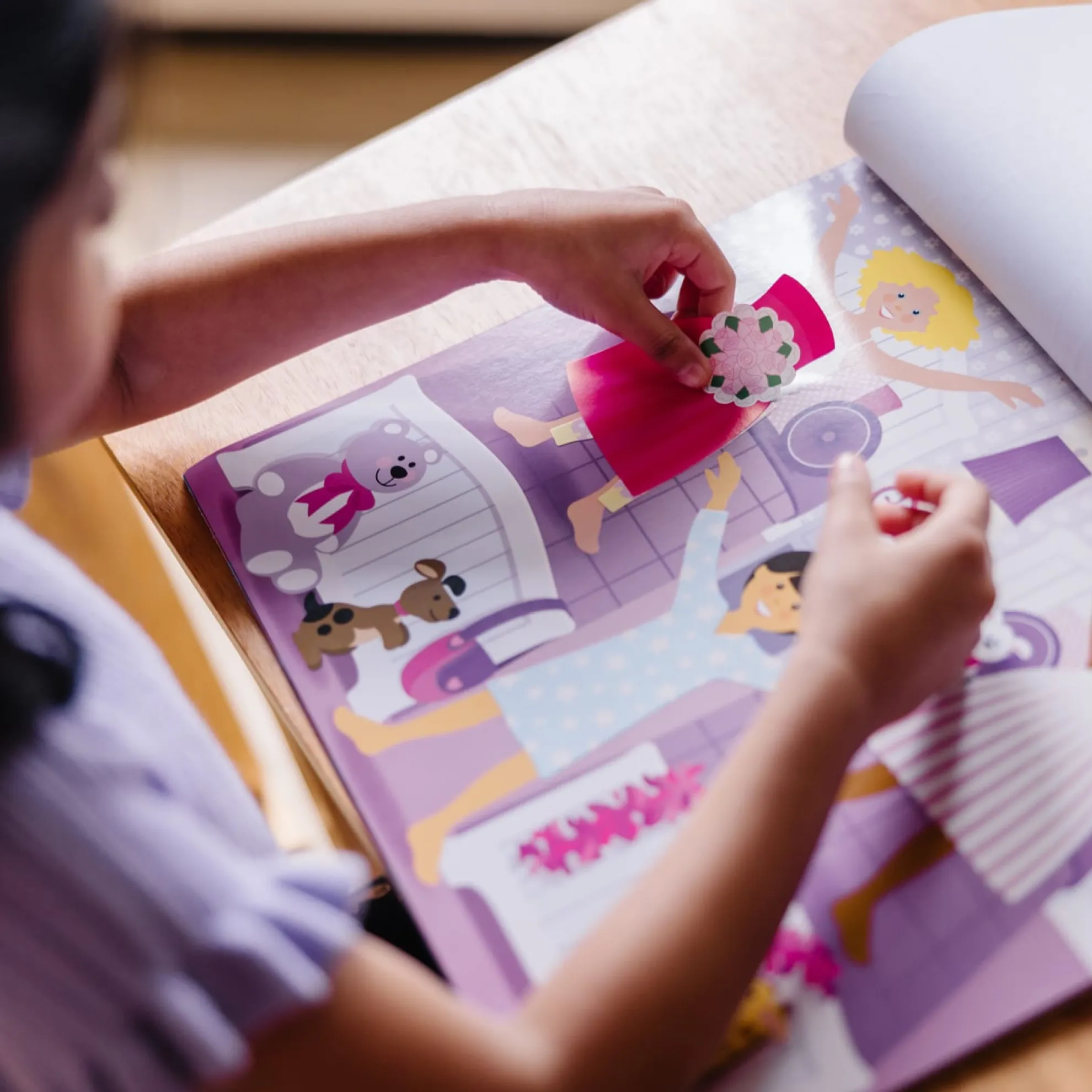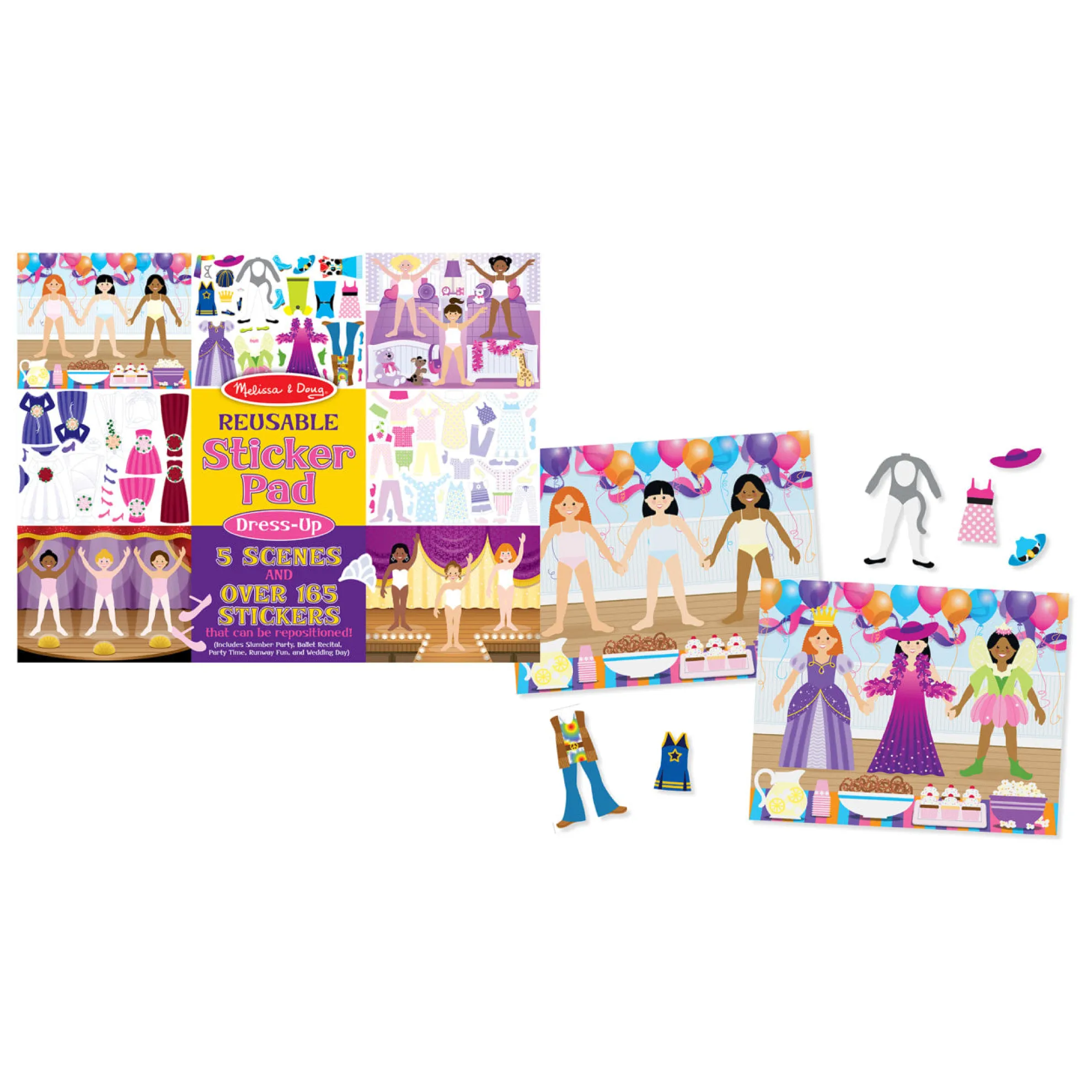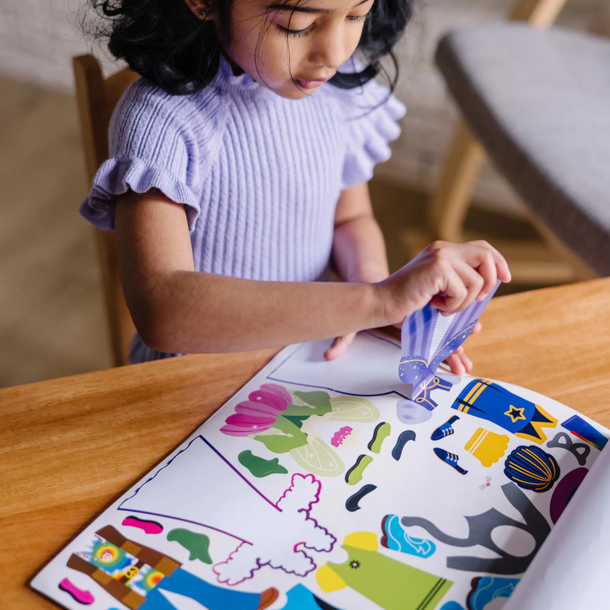 The reusable stickers in this creative activity book cling securely to the sturdy pages, then peel up easily when kids are ready to make a change. Five glossy, full-color background pages feature illustrated models to dress in 165+ skirts, dresses, and every imaginable accessory!