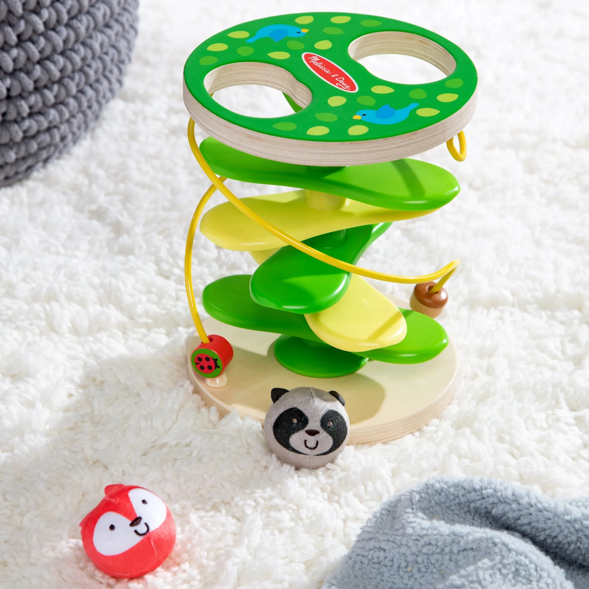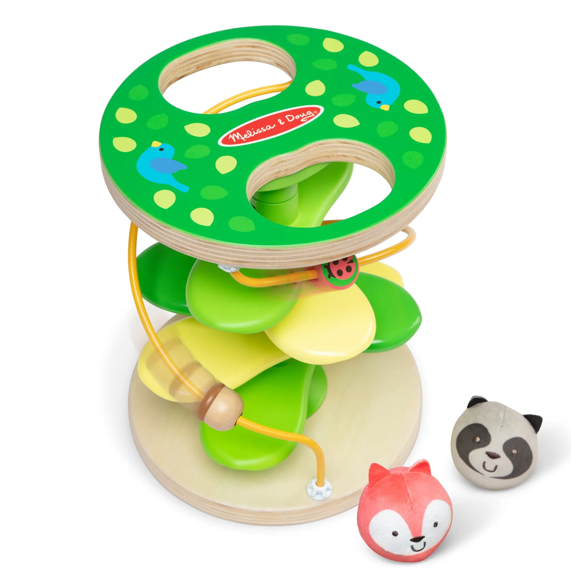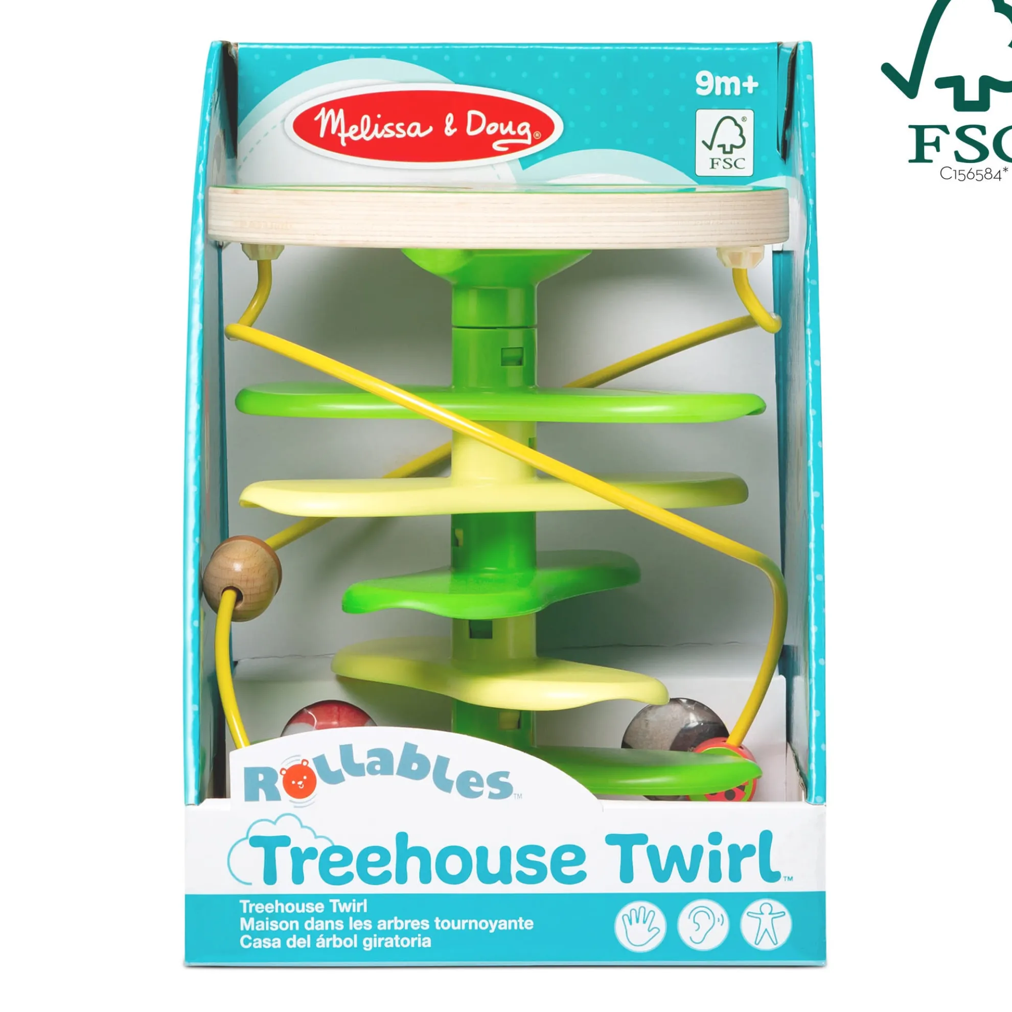 Get playtime and developmental skills rolling with Rollables—adorably round characters that are firm enough to roll but soft enough to squeeze! Inspire imaginative forest adventures through kinetic play with this sturdy wooden treehouse tower and two Rollables with chimes: the rascally racoon and sly fox. Drop Rollables into the top of the tree, and watch them tumble down the branches. A built-in bead maze adds to the excitement and tactile experience for kids. The Rollables Treehouse Twirl is an engaging way to introduce infants and toddlers 9 months and older to cause and effect while encouraging development of important sensory, fine motor, and problem-solving skills. Melissa & Doug infant and toddler toys inspire “a-ha!” moments of discovery. Adorable, diverse characters and a variety of fun shapes and textures encourage exploratory, skill-building play. As part of Melissa & Doug’s commitment to helping protect and preserve our planet’s natural resources for our children’s future This product is certified by the Forest Stewardship Council. FSC certification ensures that products come from responsibly managed forests that provide environmental, social, and economic benefits, and that forests are protected for future generations. Please note that FSC certification applies to new inventory only (FSC C156584)
