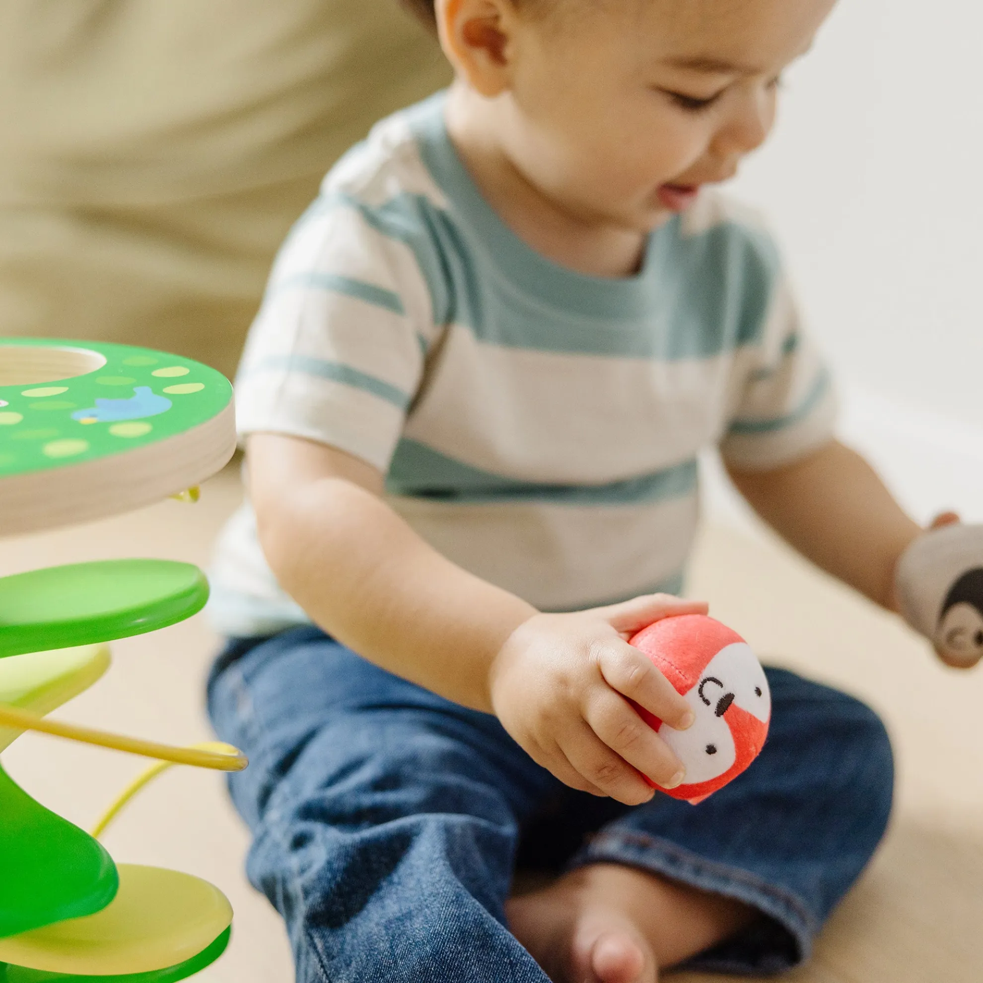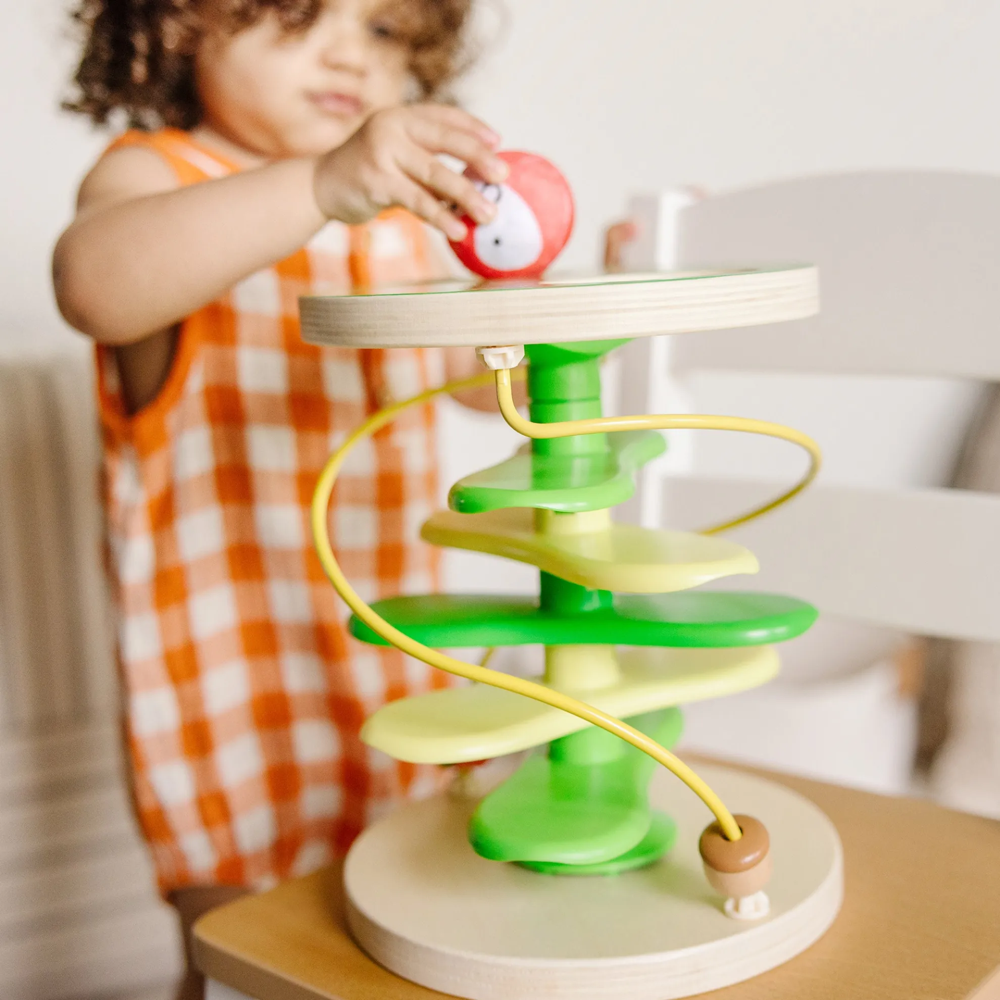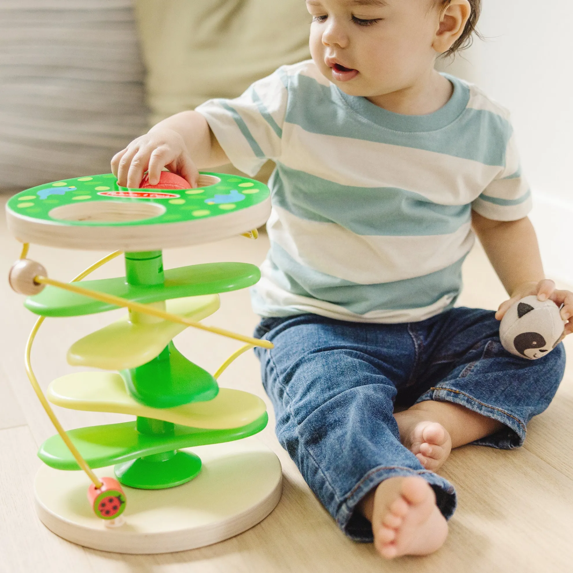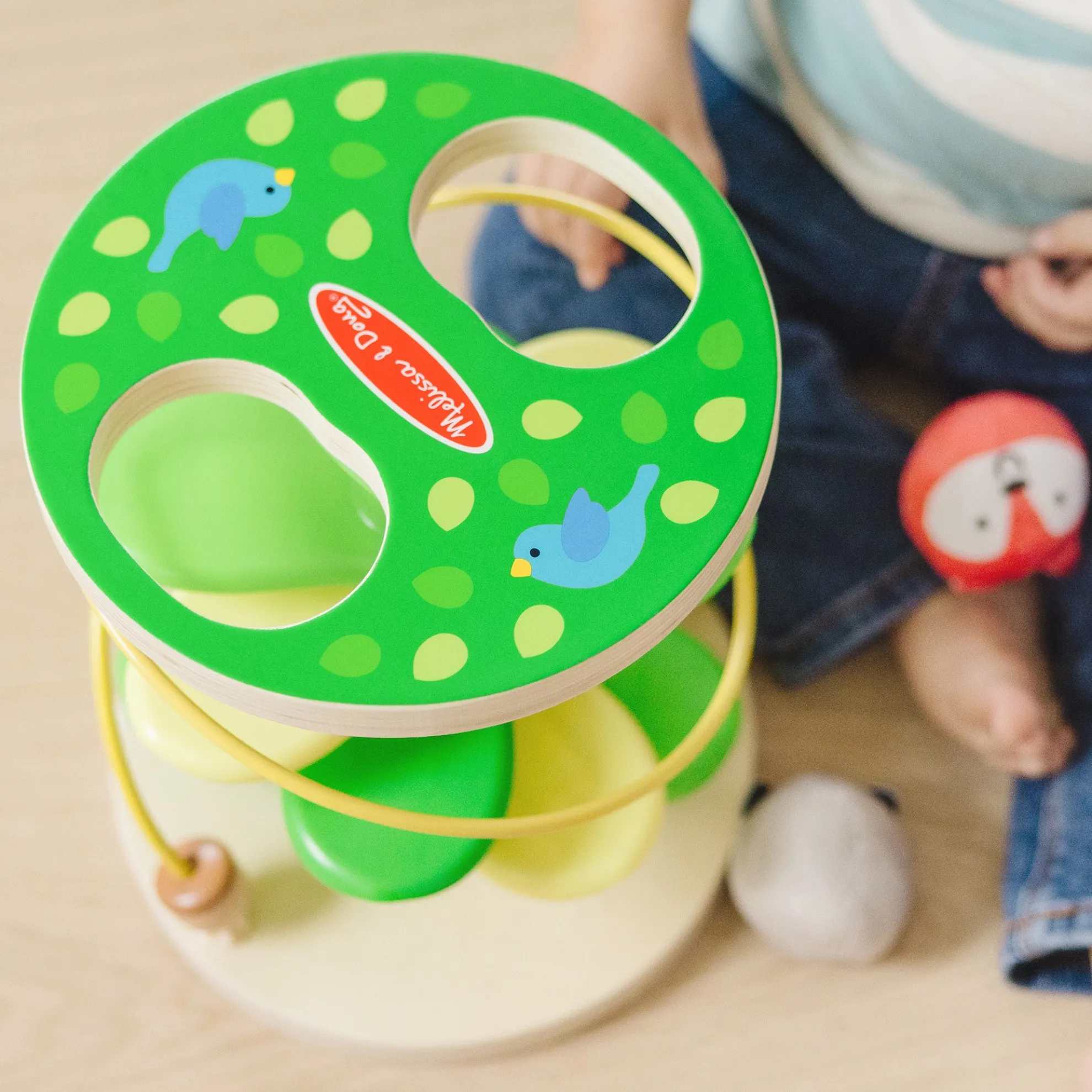 Get playtime and developmental skills rolling with Rollables—adorably round characters that are firm enough to roll but soft enough to squeeze! Inspire imaginative forest adventures through kinetic play with this sturdy wooden treehouse tower and two Rollables with chimes: the rascally racoon and sly fox. Drop Rollables into the top of the tree, and watch them tumble down the branches. A built-in bead maze adds to the excitement and tactile experience for kids. The Rollables Treehouse Twirl is an engaging way to introduce infants and toddlers 9 months and older to cause and effect while encouraging development of important sensory, fine motor, and problem-solving skills. Melissa & Doug infant and toddler toys inspire “a-ha!” moments of discovery. Adorable, diverse characters and a variety of fun shapes and textures encourage exploratory, skill-building play. As part of Melissa & Doug’s commitment to helping protect and preserve our planet’s natural resources for our children’s future This product is certified by the Forest Stewardship Council. FSC certification ensures that products come from responsibly managed forests that provide environmental, social, and economic benefits, and that forests are protected for future generations. Please note that FSC certification applies to new inventory only (FSC C156584)
