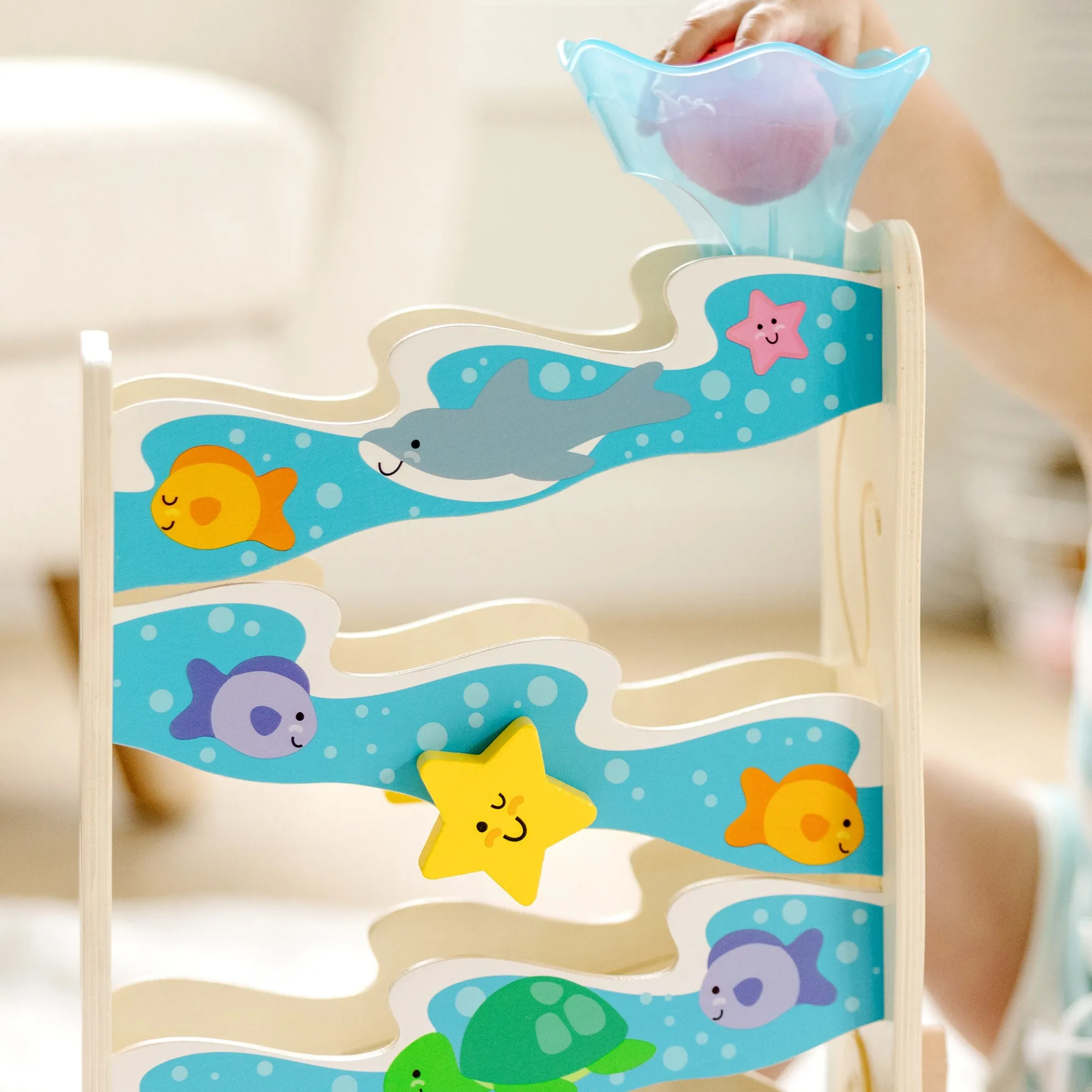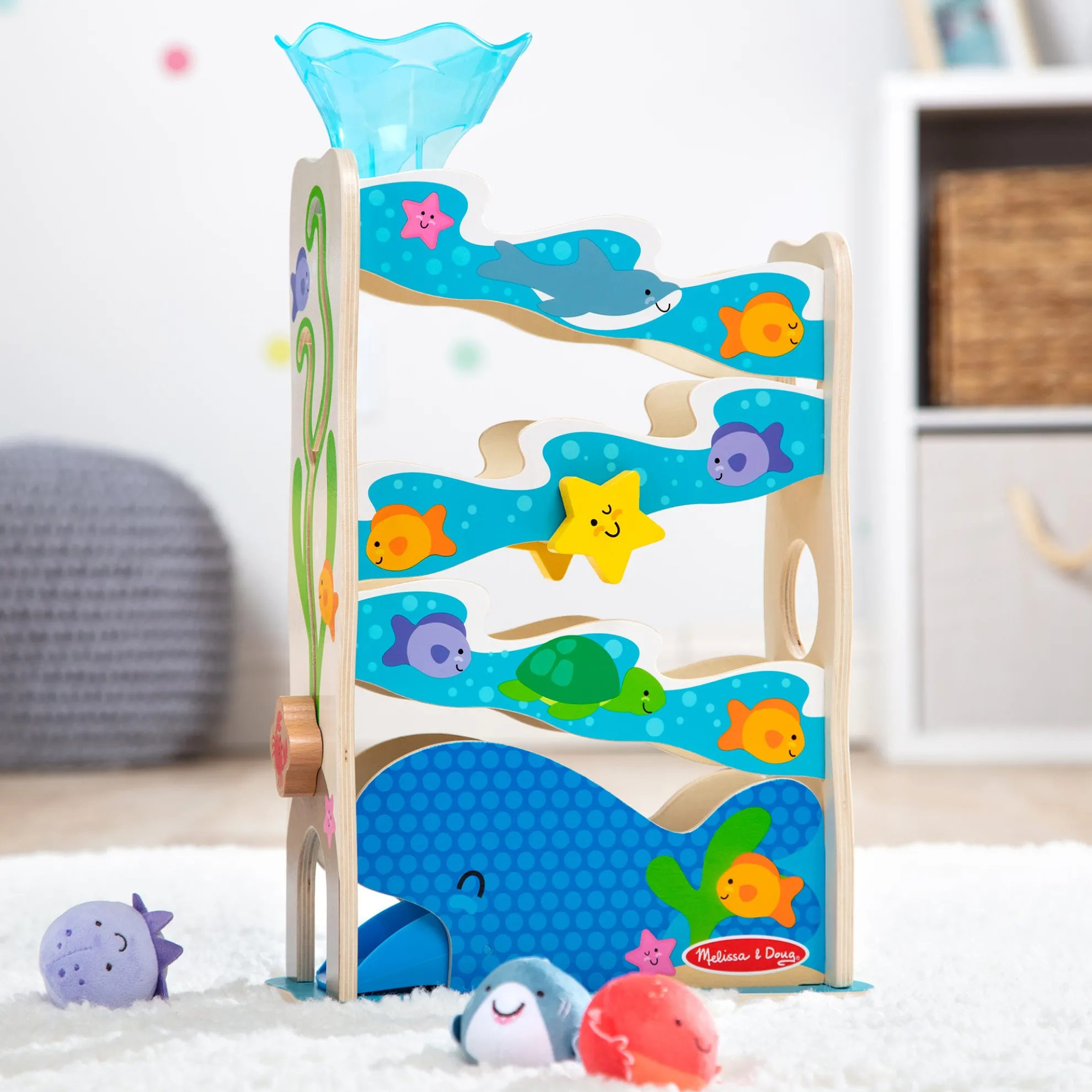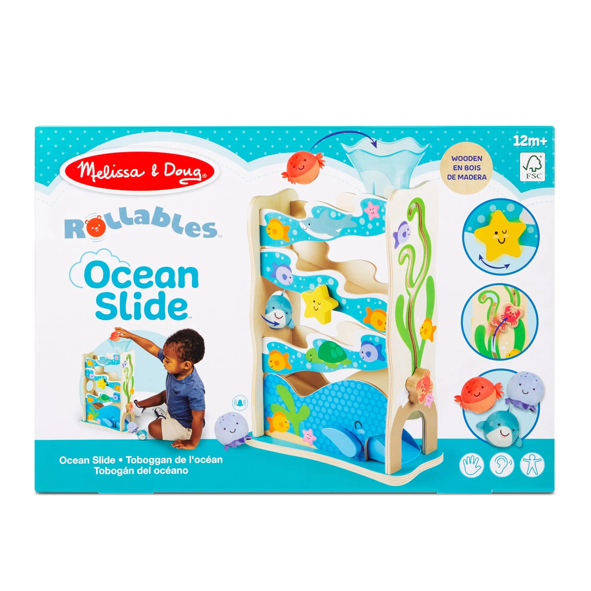 Get playtime and developmental skills rolling with Rollables—adorably round characters that are firm enough to roll but soft enough to squeeze! Inspire imaginative oceanside adventures through kinetic play with this sturdy wooden ramp tower and three Rollables: the friendly crab, silly shark, and awesome octopus with chime. Compatible with other Rollables play sets. Drop Rollables into the removable funnel, and watch them tumble down the wavy slide and out the whale’s mouth. Turn the sea star and press the whale’s flipper to stop and start the action. A built-in bead maze adds to the excitement and tactile experience for kids. The Rollables Ocean Slide is an engaging way to introduce infants and toddlers 12 months and older to cause and effect while encouraging development of important sensory, fine motor, and problem-solving skills. Melissa & Doug infant and toddler toys inspire “a-ha!” moments of discovery. Adorable, diverse characters and a variety of fun shapes and textures encourage exploratory, skill-building play. As part of Melissa & Doug’s commitment to helping protect and preserve our planet’s natural resources for our children’s future This product is certified by the Forest Stewardship Council. FSC certification ensures that products come from responsibly managed forests that provide environmental, social, and economic benefits, and that forests are protected for future generations. Please note that FSC certification applies to new inventory only (FSC C156584)