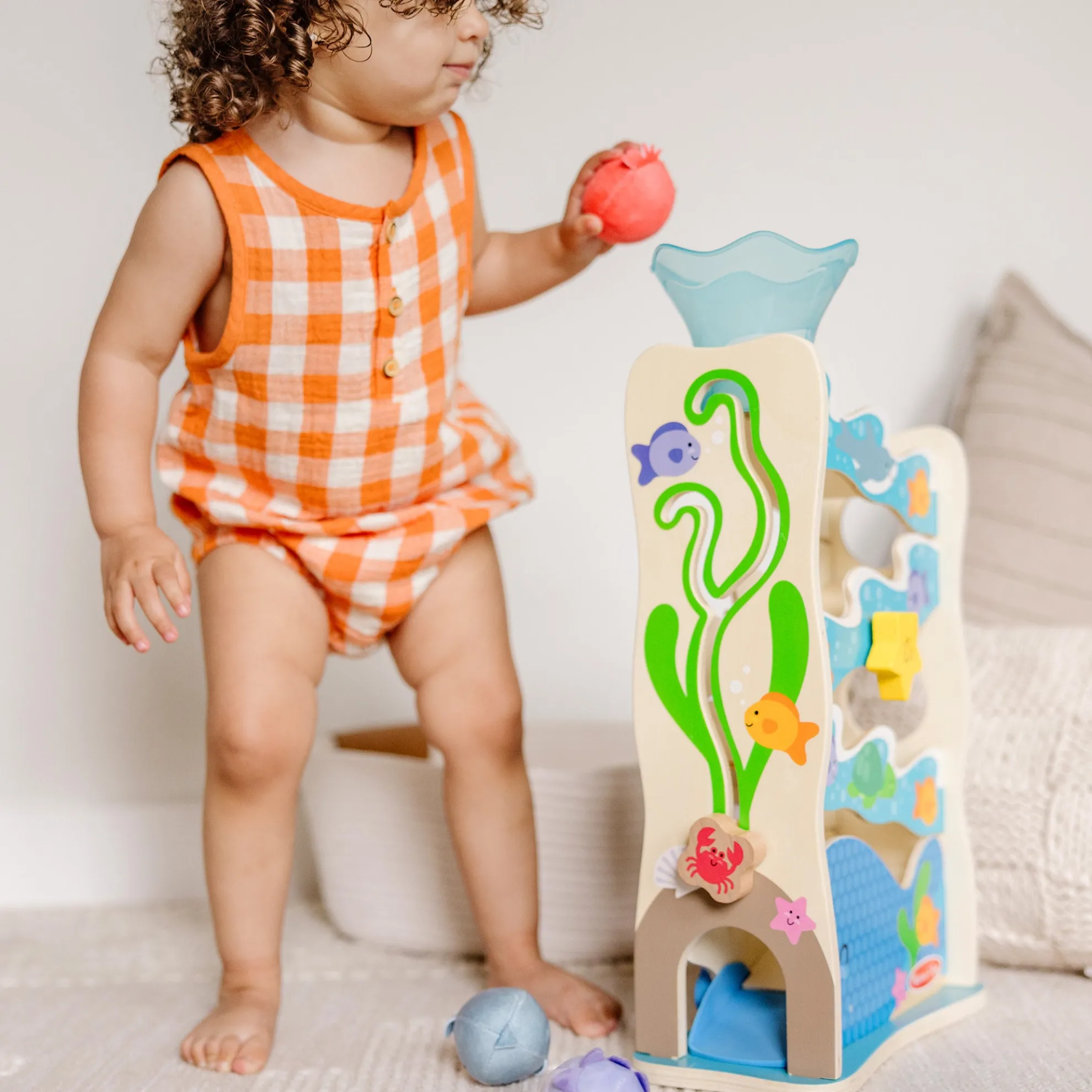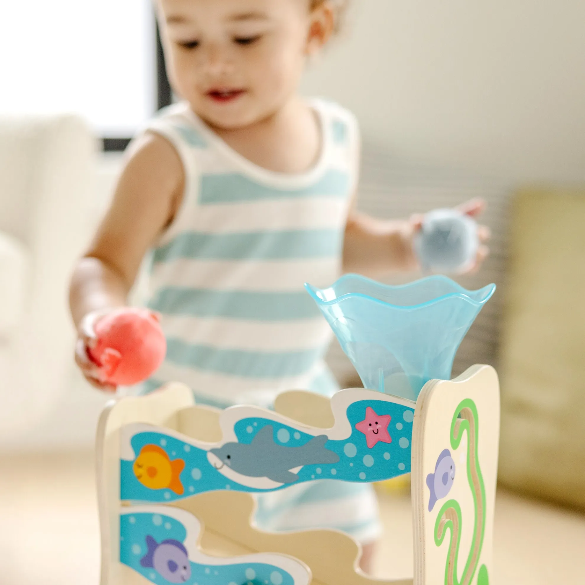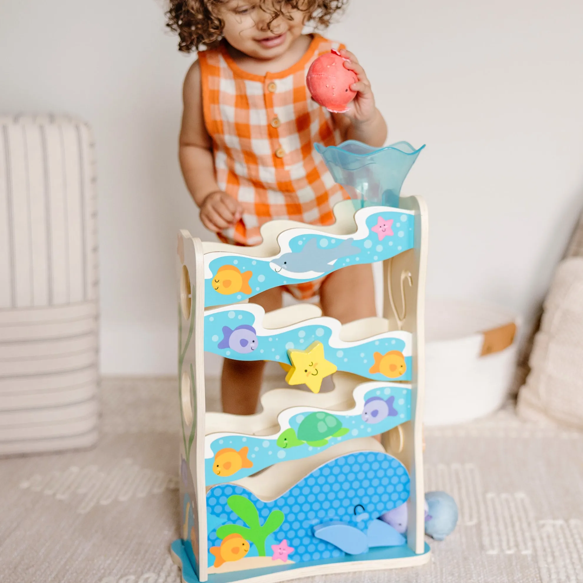 Get playtime and developmental skills rolling with Rollables—adorably round characters that are firm enough to roll but soft enough to squeeze! Inspire imaginative oceanside adventures through kinetic play with this sturdy wooden ramp tower and three Rollables: the friendly crab, silly shark, and awesome octopus with chime. Compatible with other Rollables play sets. Drop Rollables into the removable funnel, and watch them tumble down the wavy slide and out the whale’s mouth. Turn the sea star and press the whale’s flipper to stop and start the action. A built-in bead maze adds to the excitement and tactile experience for kids. The Rollables Ocean Slide is an engaging way to introduce infants and toddlers 12 months and older to cause and effect while encouraging development of important sensory, fine motor, and problem-solving skills. Melissa & Doug infant and toddler toys inspire “a-ha!” moments of discovery. Adorable, diverse characters and a variety of fun shapes and textures encourage exploratory, skill-building play. As part of Melissa & Doug’s commitment to helping protect and preserve our planet’s natural resources for our children’s future This product is certified by the Forest Stewardship Council. FSC certification ensures that products come from responsibly managed forests that provide environmental, social, and economic benefits, and that forests are protected for future generations. Please note that FSC certification applies to new inventory only (FSC C156584)