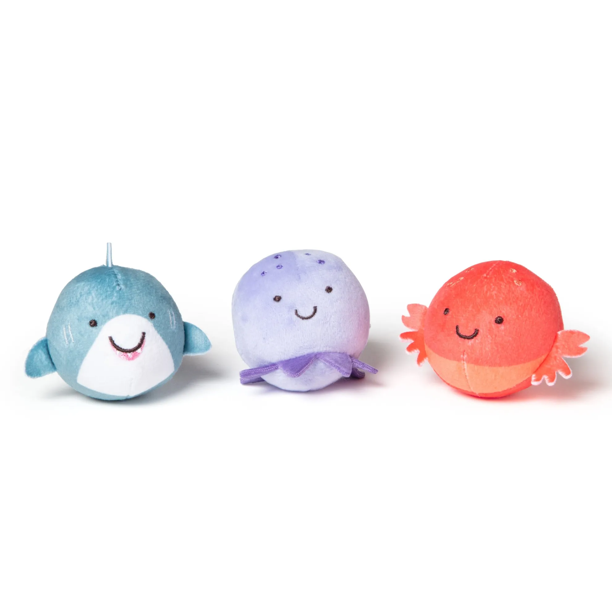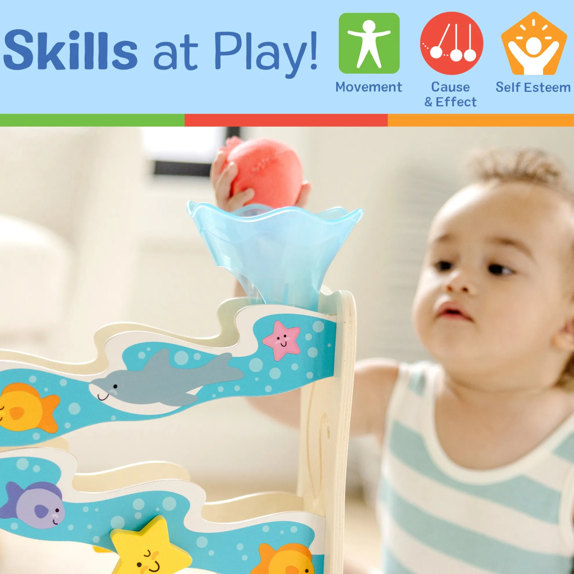 - Includes wooden slide tower with built-in bead maze, a sea star to turn and whale flipper to press that stop and start rolling, and a removable durable funnel; 3 Rollables (shark, crab, and octopus with chime)