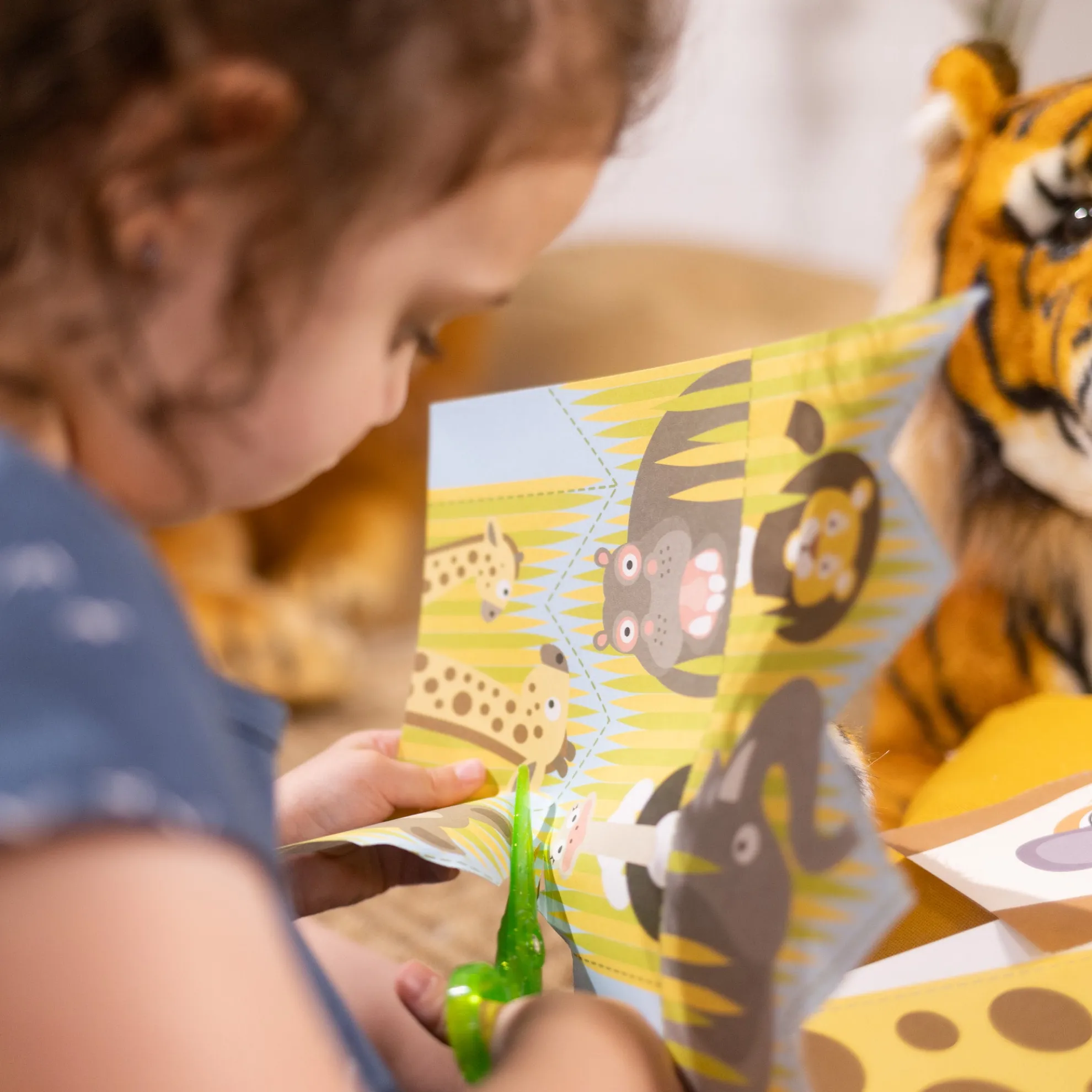 - Paper-cutting project book with pre-printed activity pages and a safari animal theme