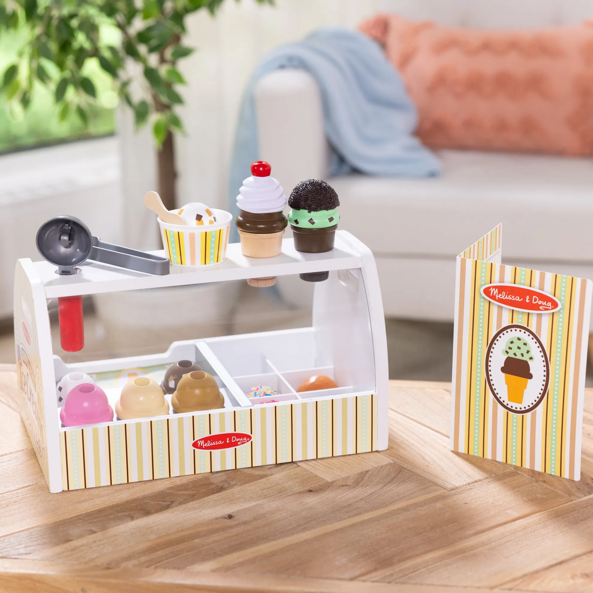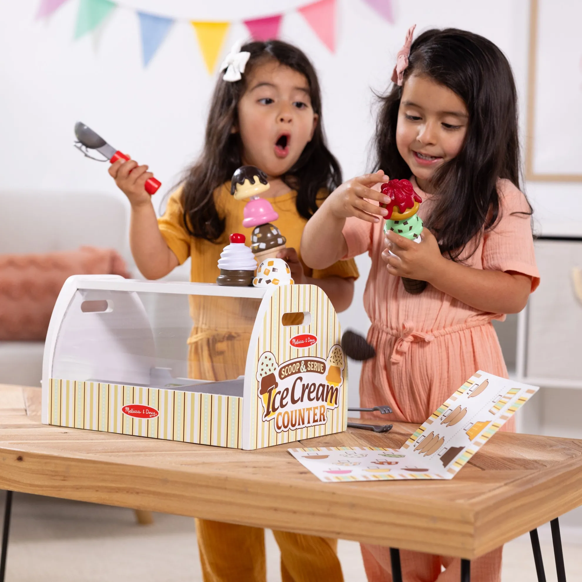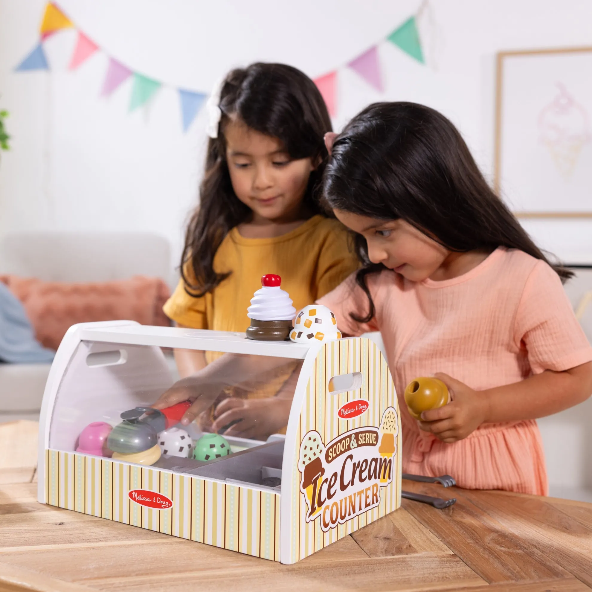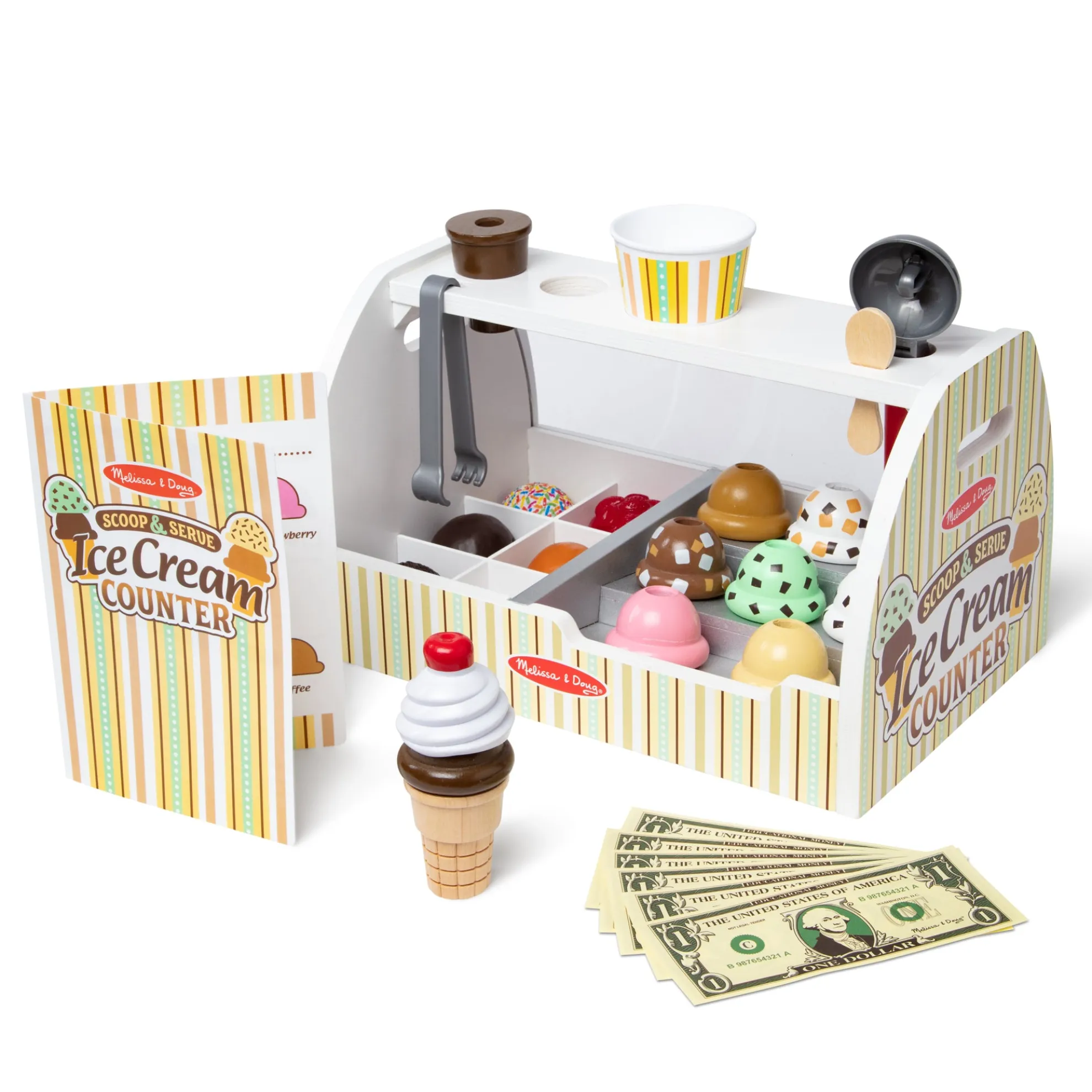 Kids can scoop up some cool treats with this all-inclusive, 28-piece pretend play ice cream counter! The sturdy wooden tabletop counter holds eight wooden scoops of different-flavored ice cream, six assorted toppings, two cones, a plastic cup, an ice cream scooper, a wooden spoon, tongs, reusable menu card, and six pretend dollar bills to get started on your very own ice cream shop! The scooper fits into a hole on top of the scoops so little ones can easily lift, stack, and release. Take orders on the reusable menu card and serve up delicious fun with this ice cream play set by Melissa & Doug!