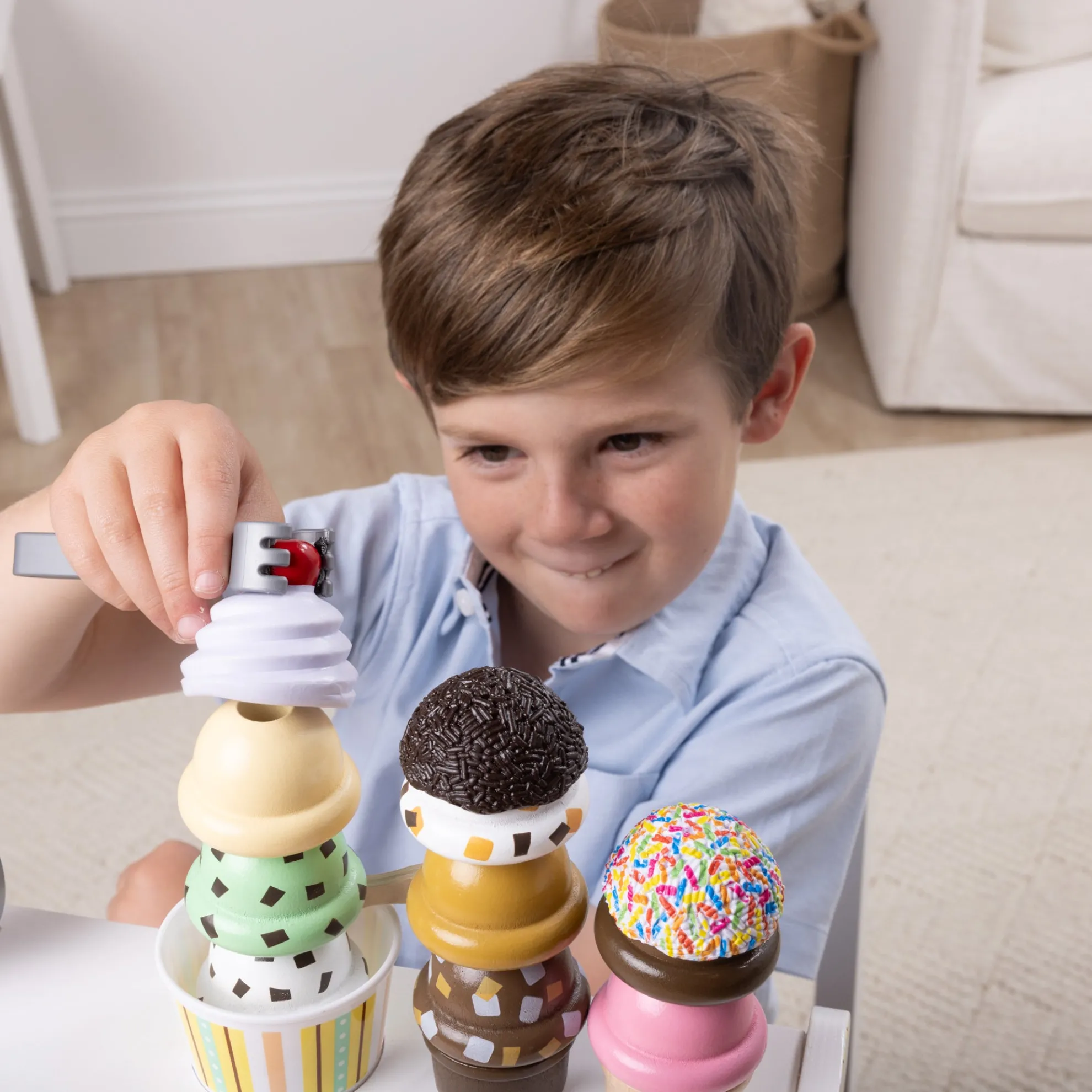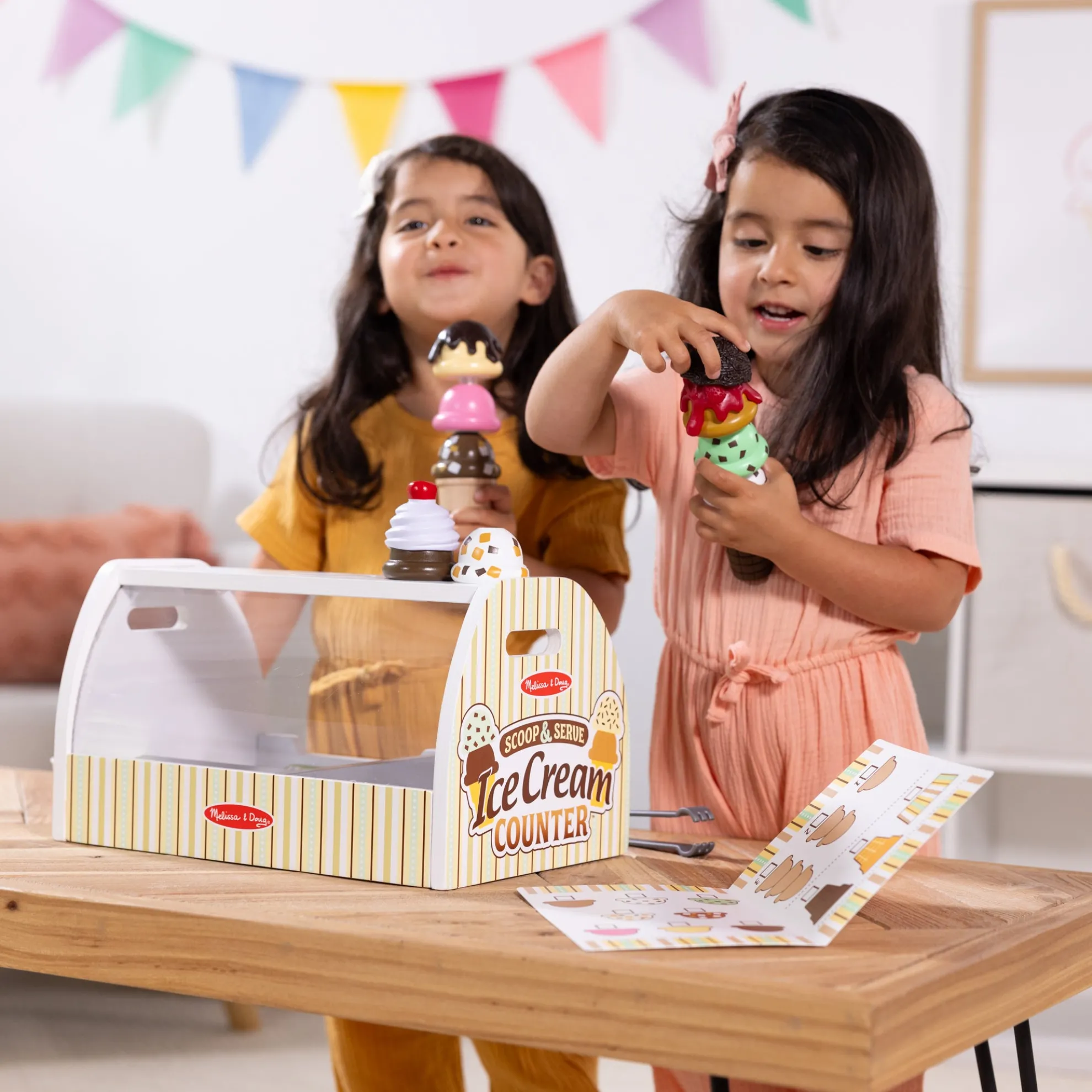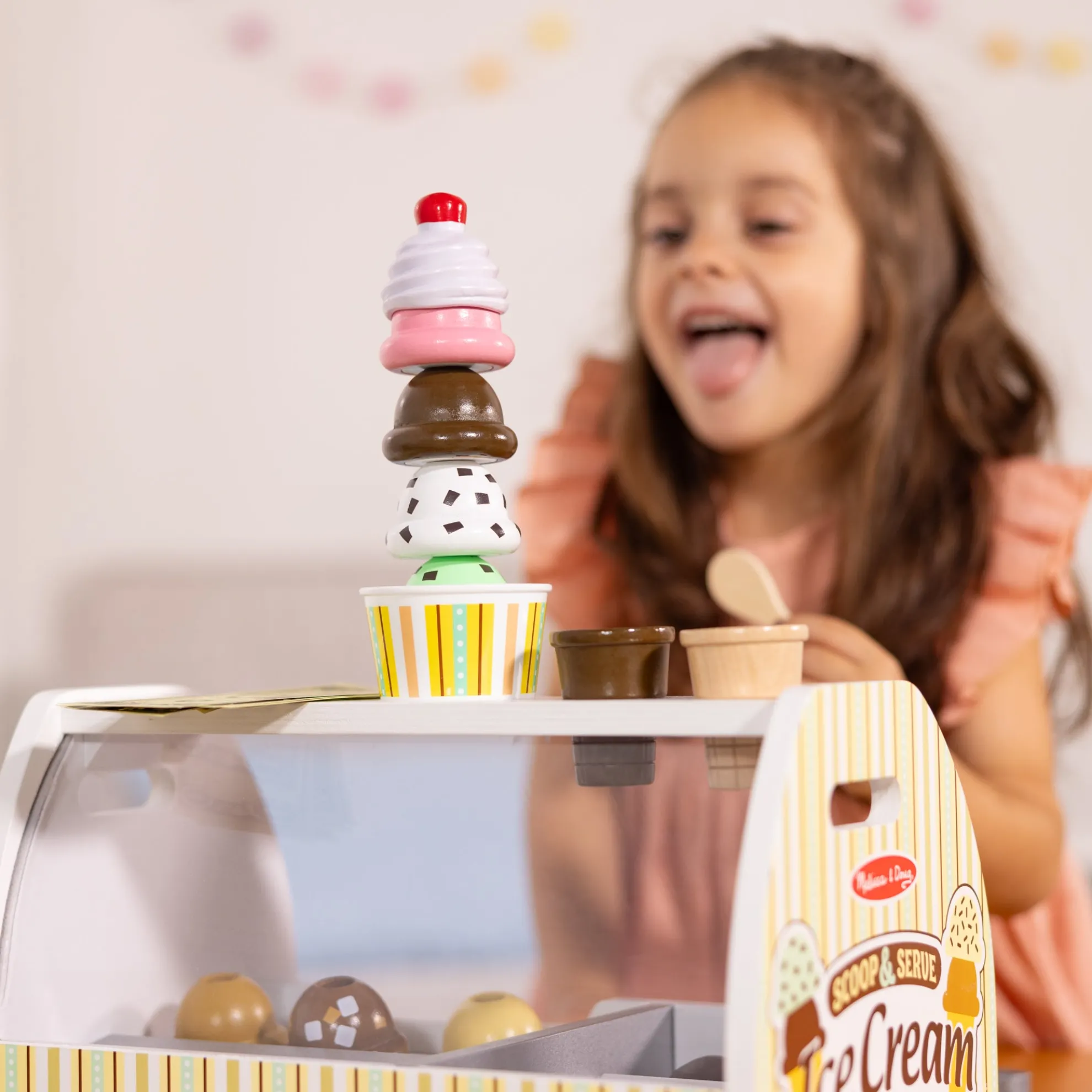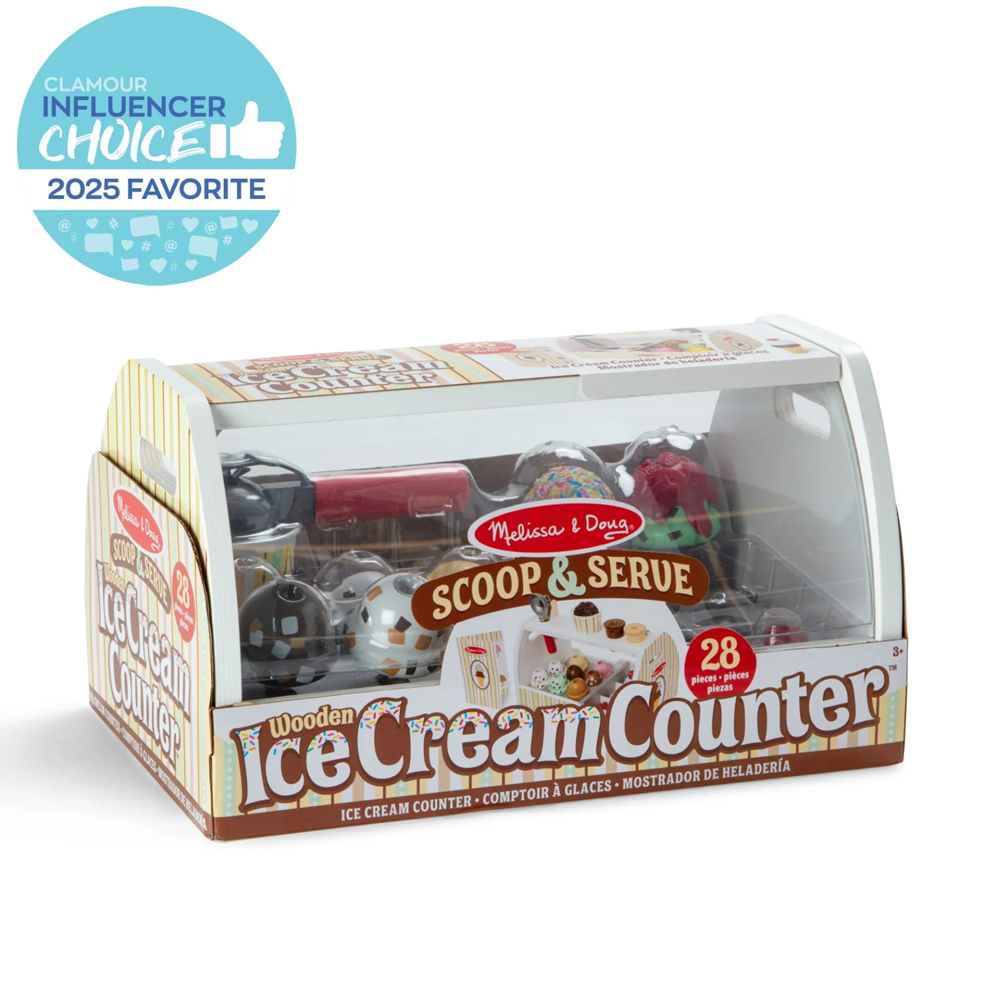 Kids can scoop up some cool treats with this all-inclusive, 28-piece pretend play ice cream counter! The sturdy wooden tabletop counter holds eight wooden scoops of different-flavored ice cream, six assorted toppings, two cones, a plastic cup, an ice cream scooper, a wooden spoon, tongs, reusable menu card, and six pretend dollar bills to get started on your very own ice cream shop! The scooper fits into a hole on top of the scoops so little ones can easily lift, stack, and release. Take orders on the reusable menu card and serve up delicious fun with this ice cream play set by Melissa & Doug!
