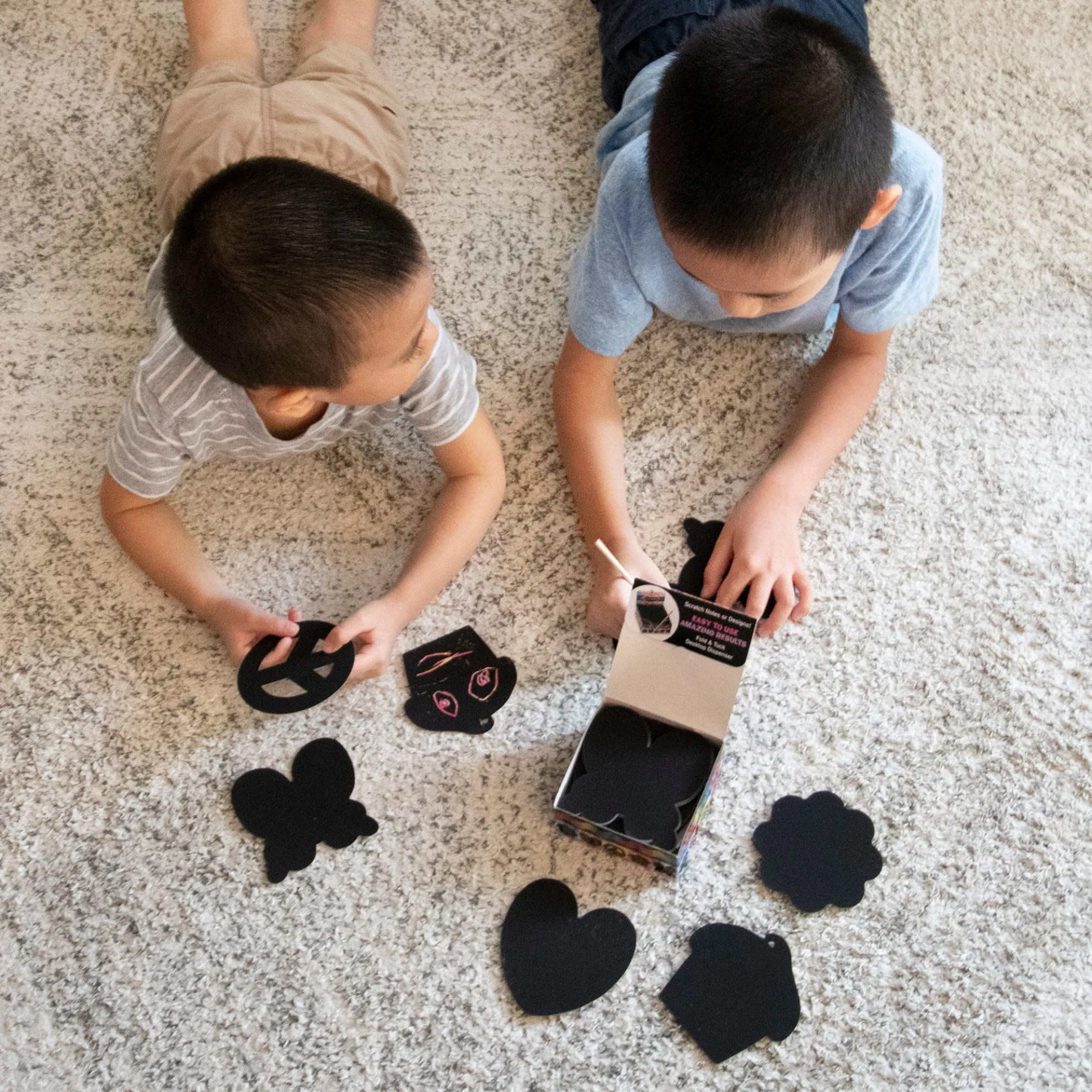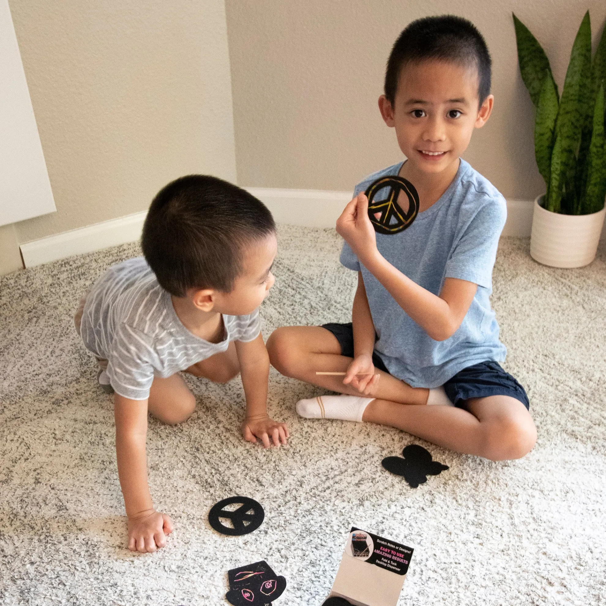 - Scratch away the black coating to reveal 5 colorful patterns underneath